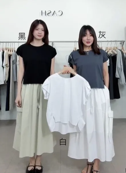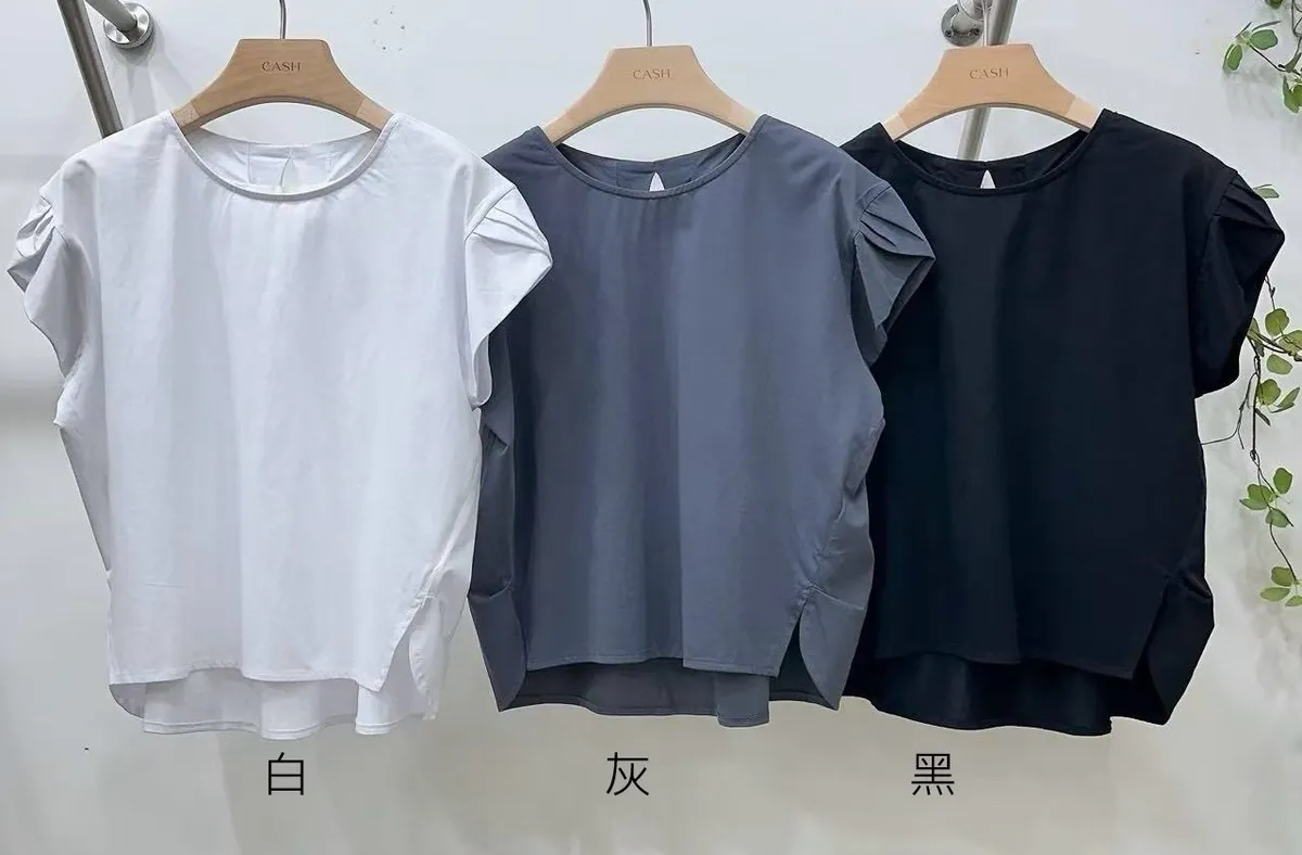 棉85%+聚酯 絲滑舒適 後頸立體剪裁設計 壓褶美肩袖 側開叉