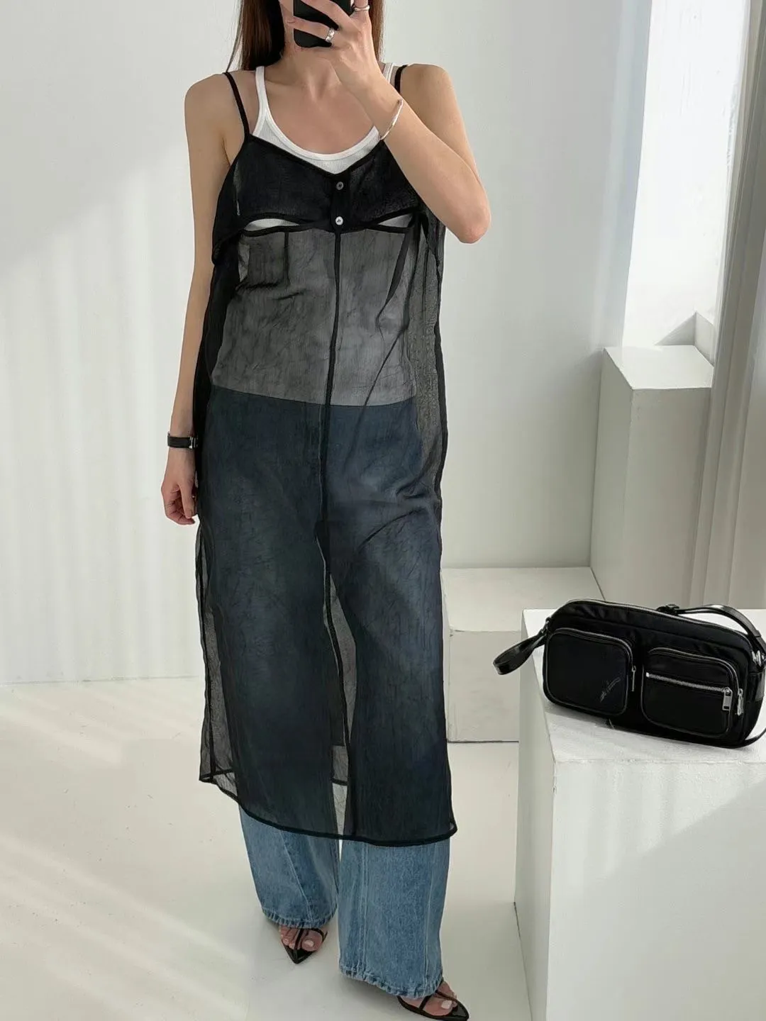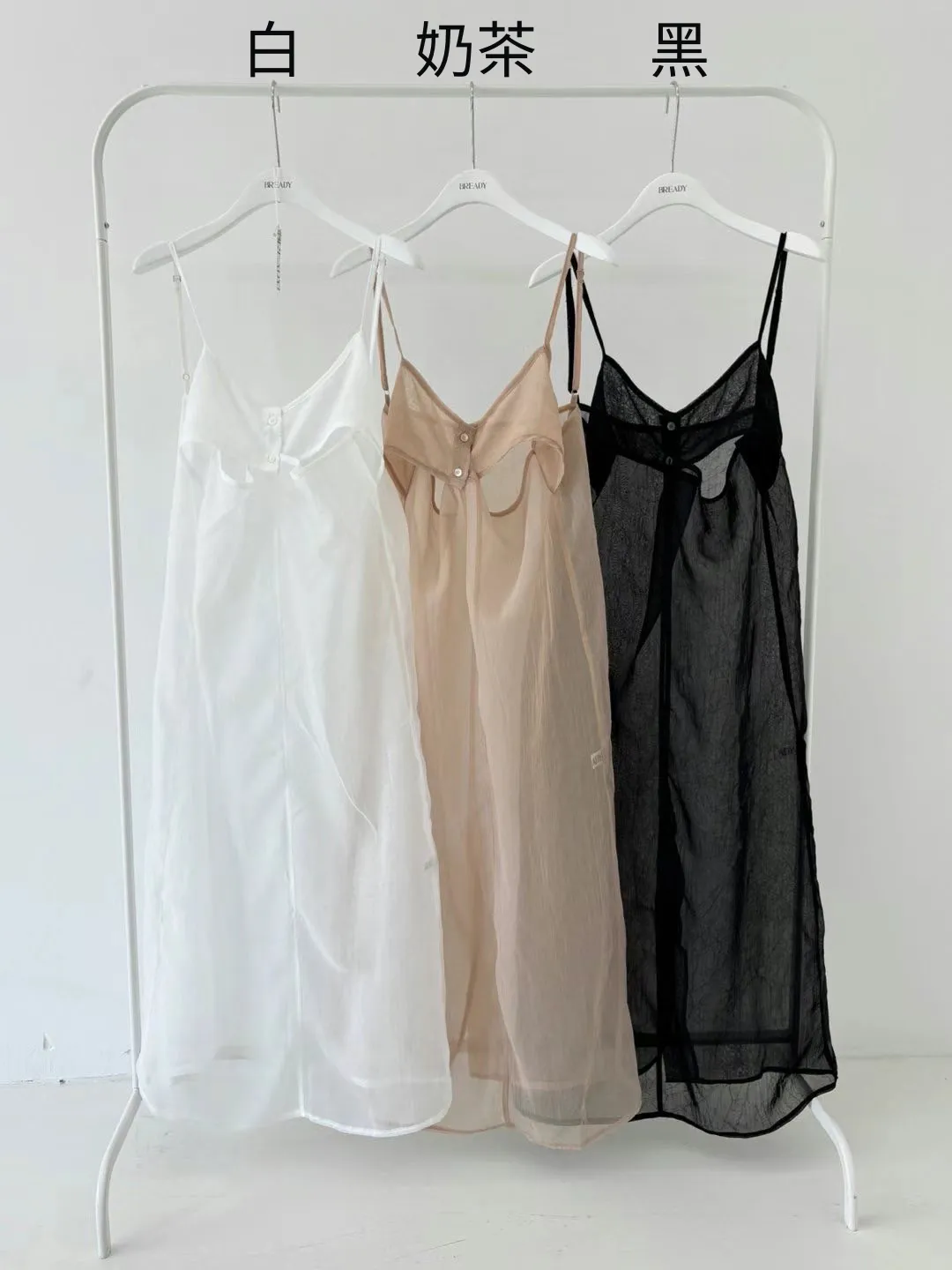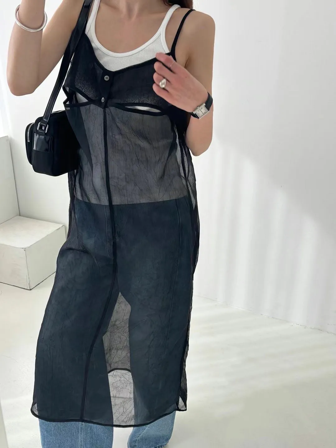 聚酯 薄款透光 不規則皺摺裂痕面料 肩帶可調 側開叉