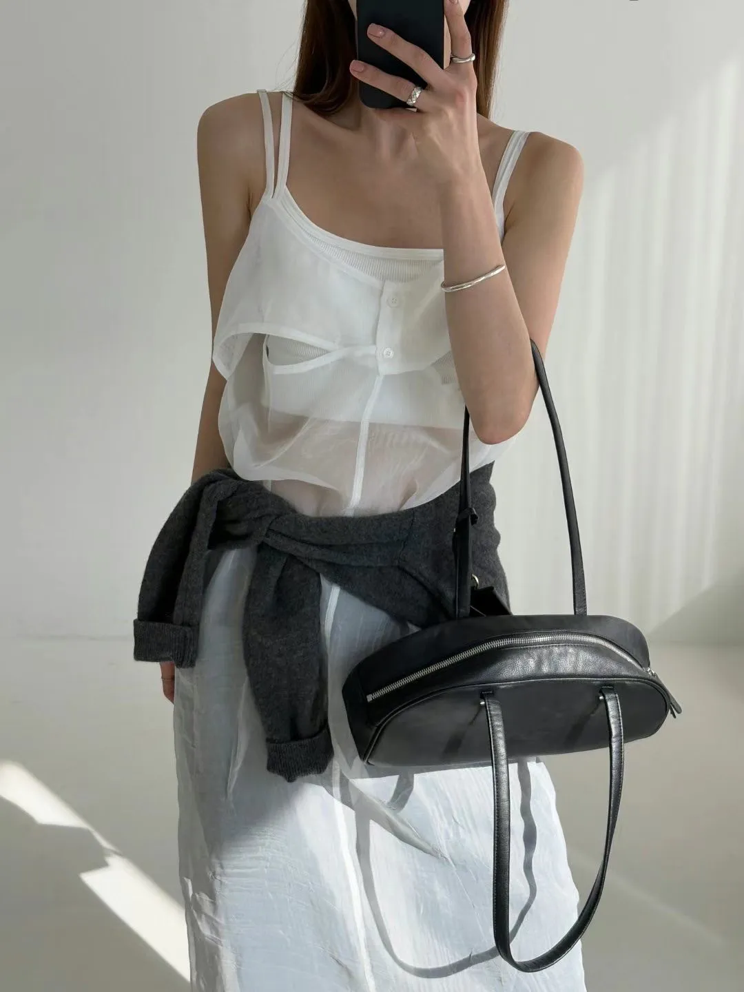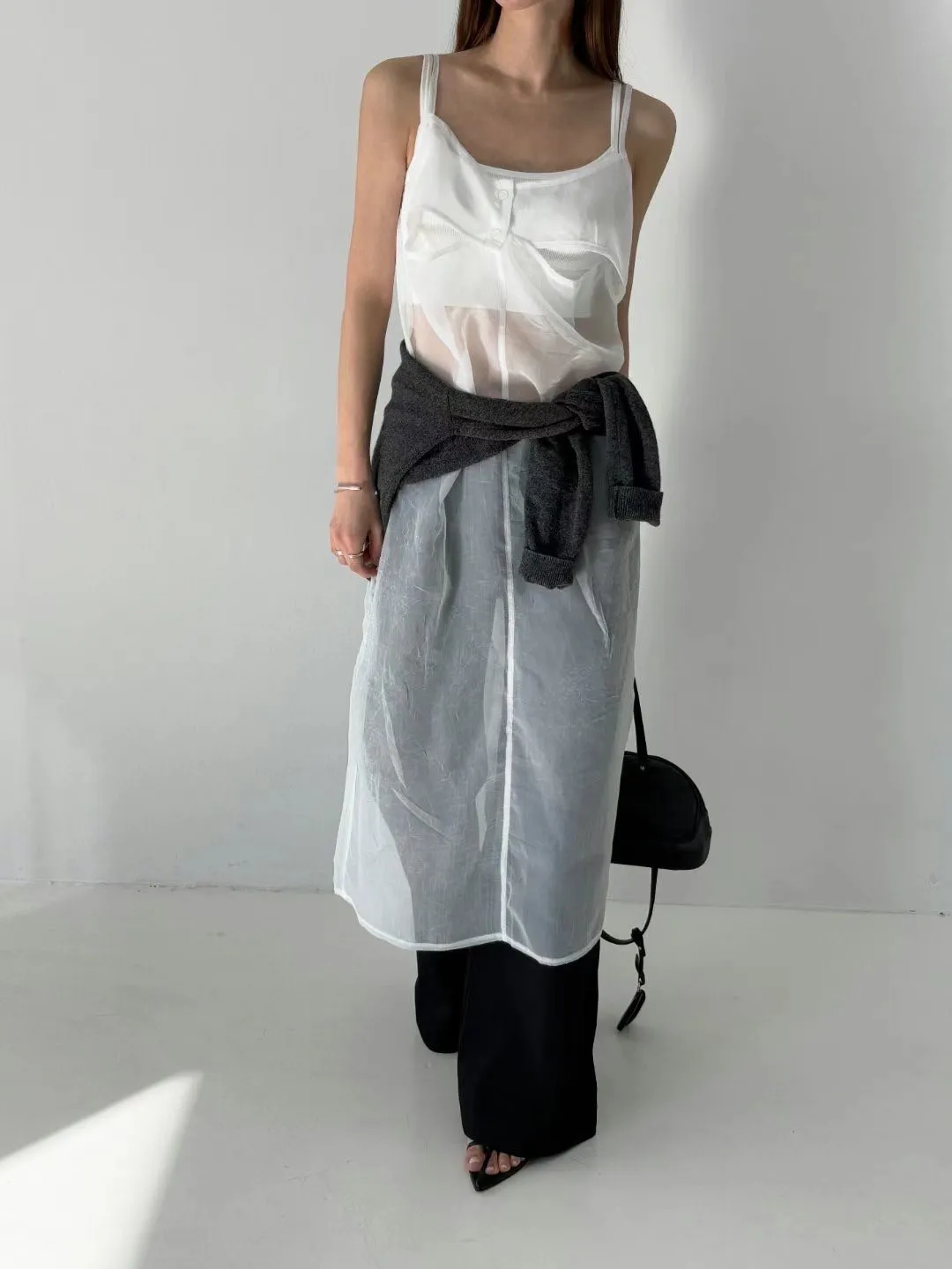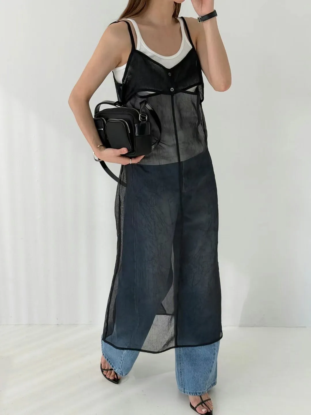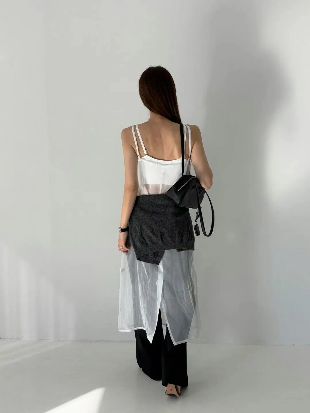 聚酯 薄款透光 不規則皺摺裂痕面料 肩帶可調 側開叉