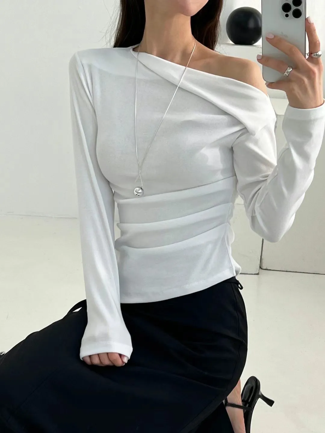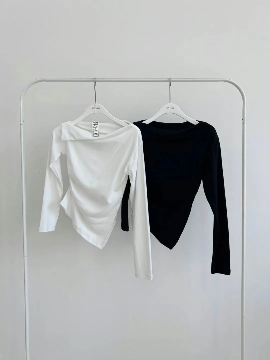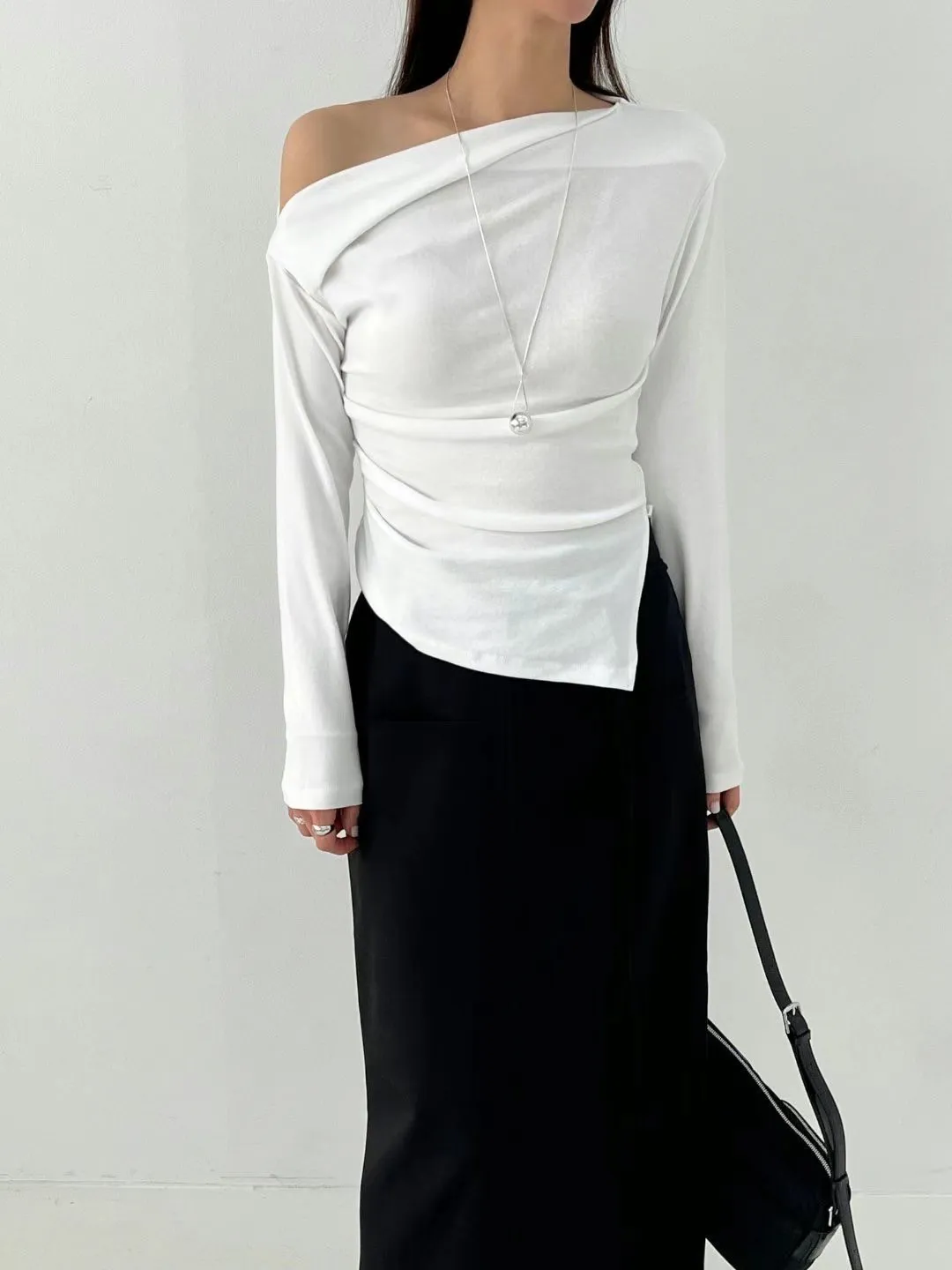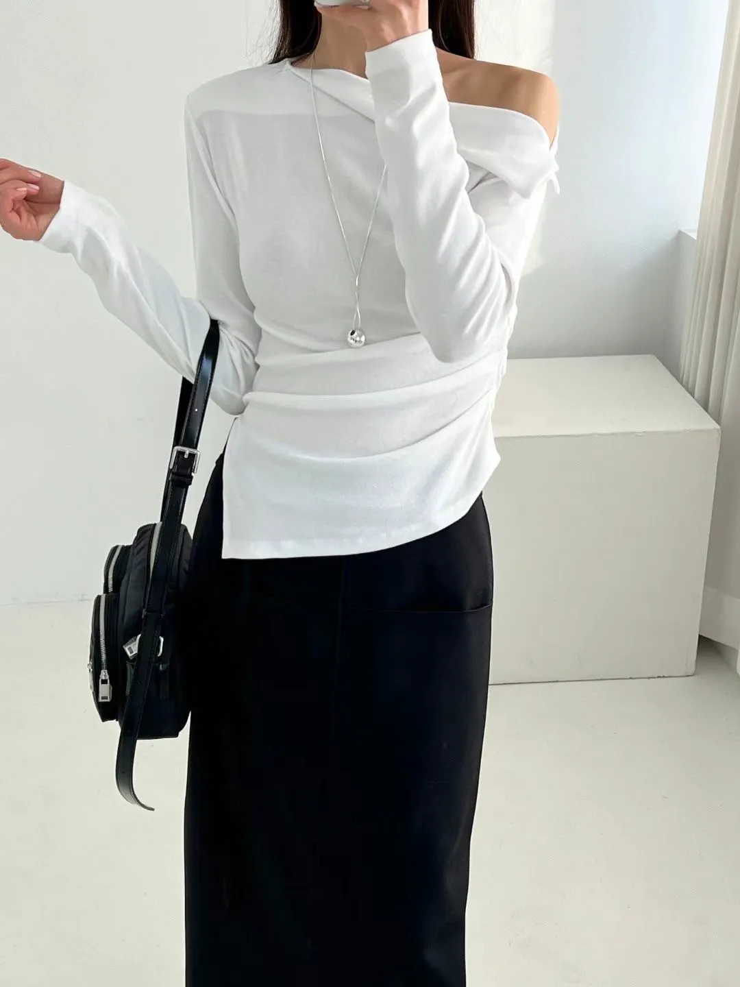 棉+彈力 側腰抓皺 單露香肩 下擺不對稱 自然微皺 彈性佳