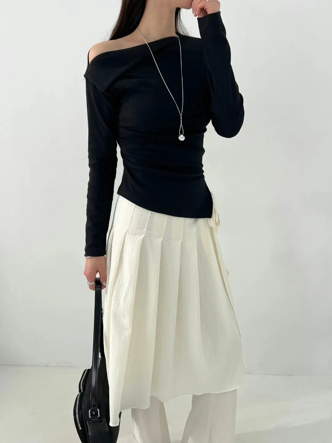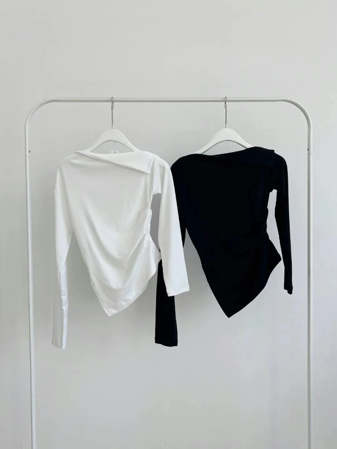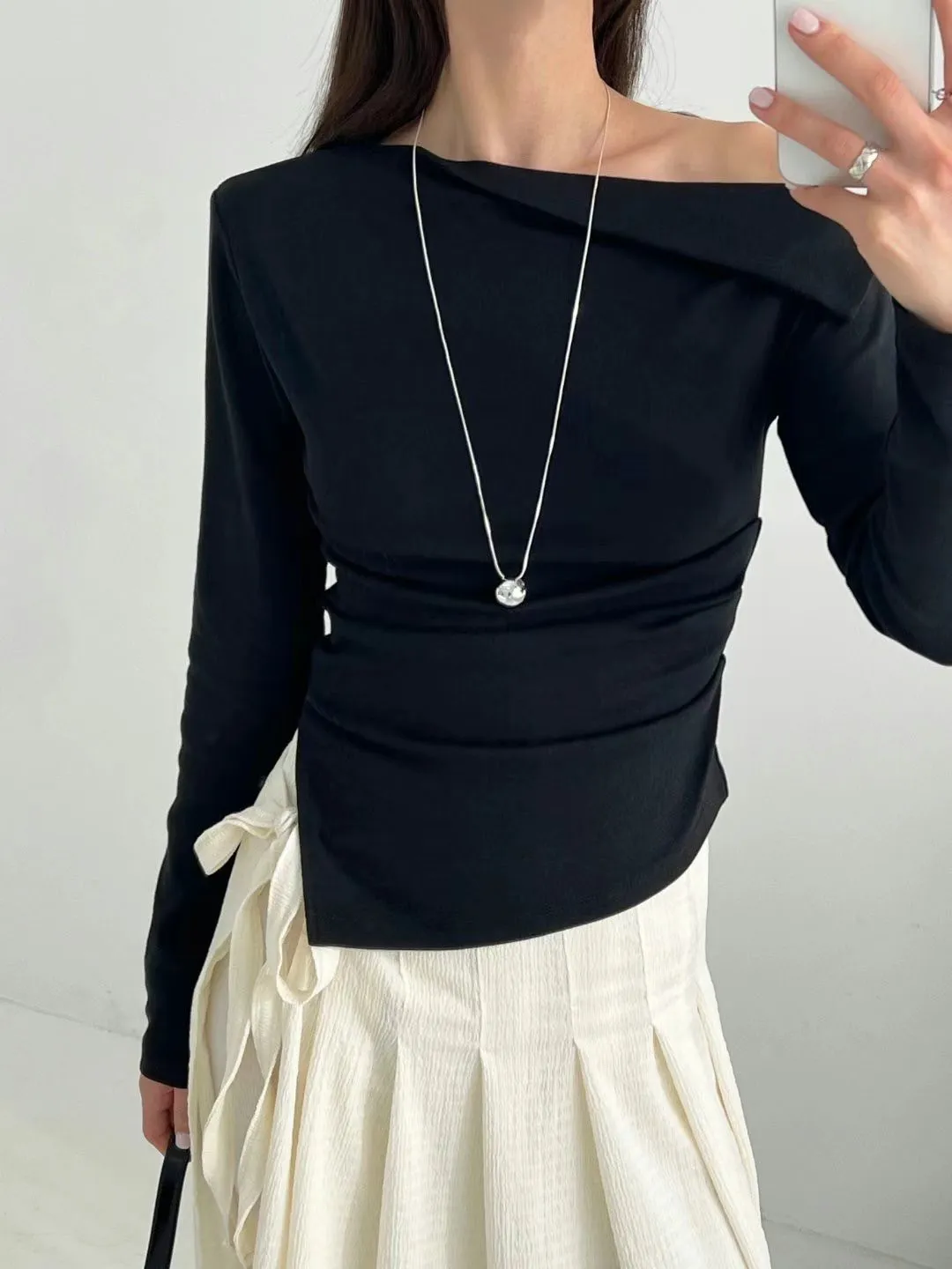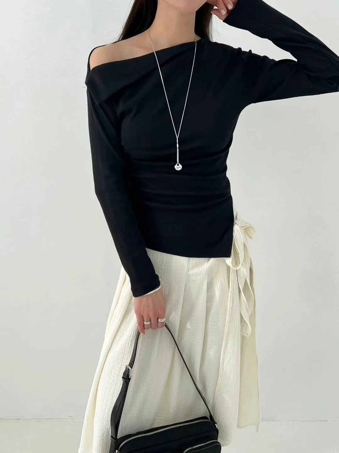棉+彈力 側腰抓皺 單露香肩 下擺不對稱 自然微皺 彈性佳