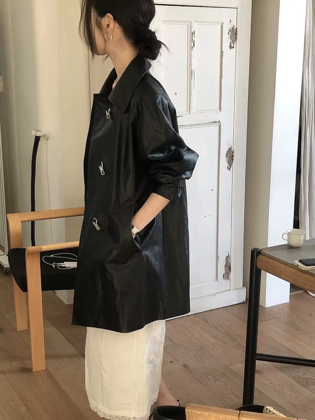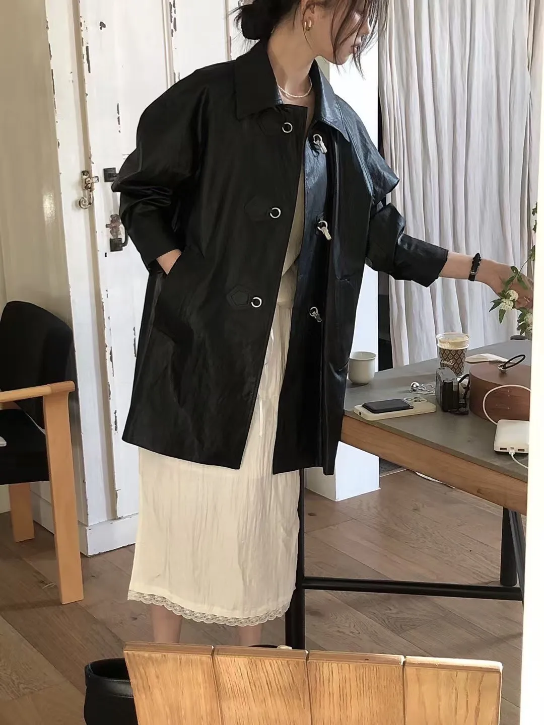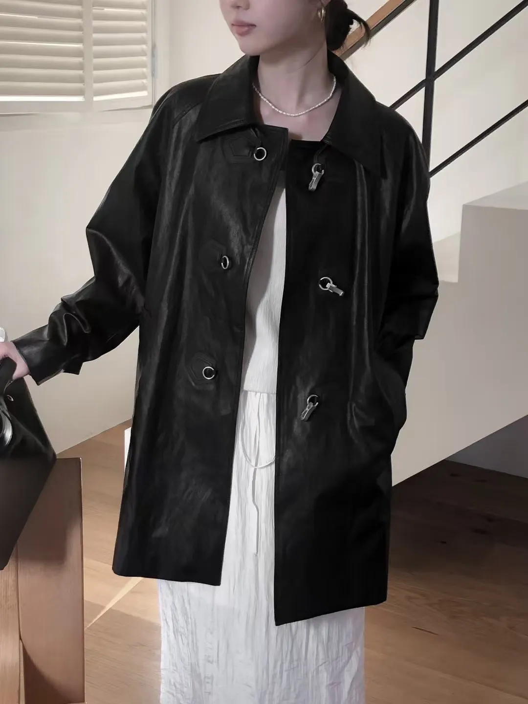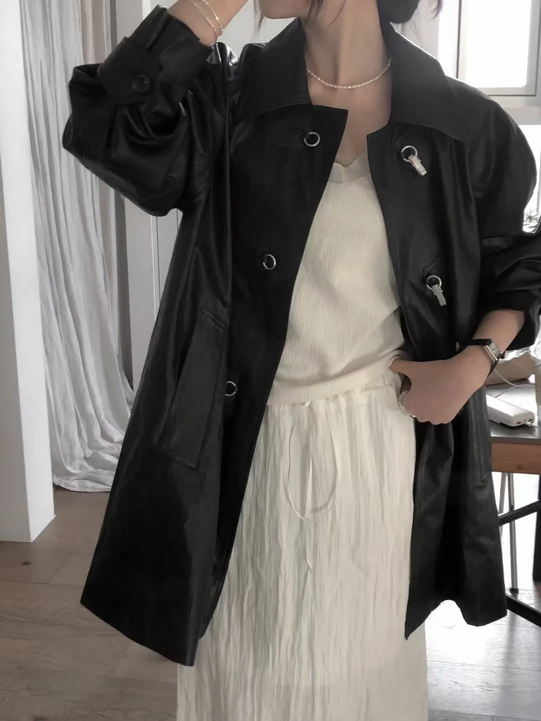 合成皮革 中長版 霧銀勾釦穿脫 有口袋