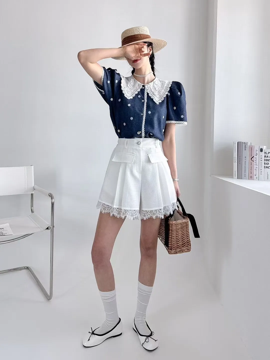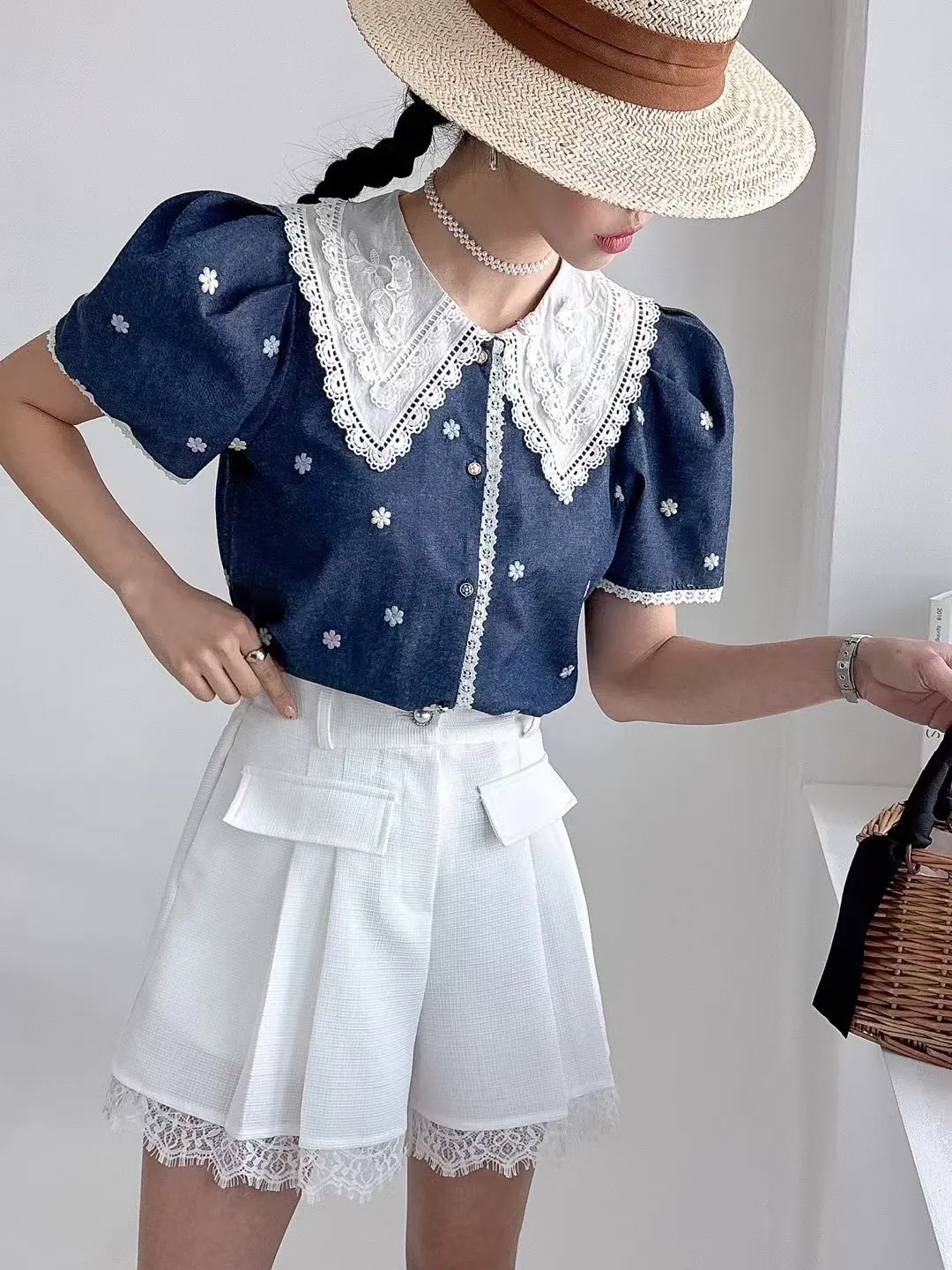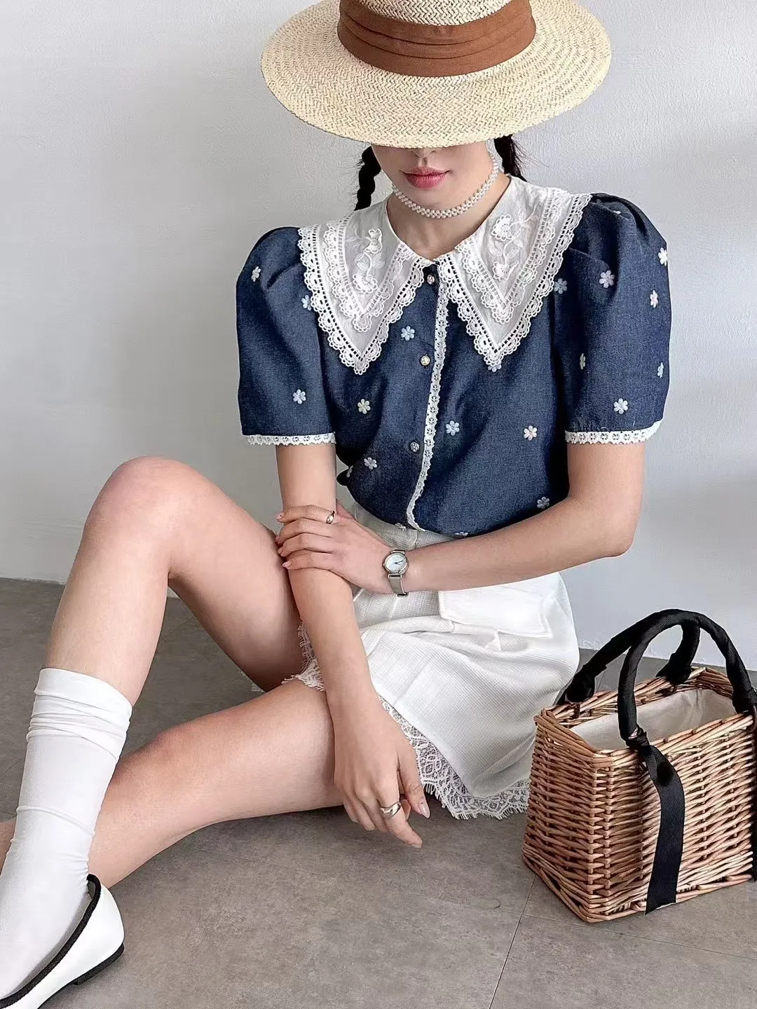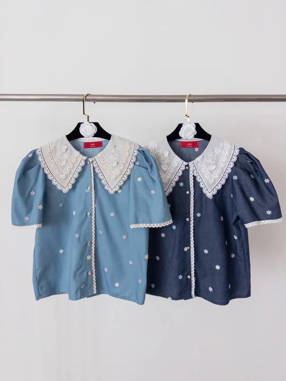 棉 蕾絲棉翻領 刺繡彩色小花 公主肩袖 袖口蕾絲