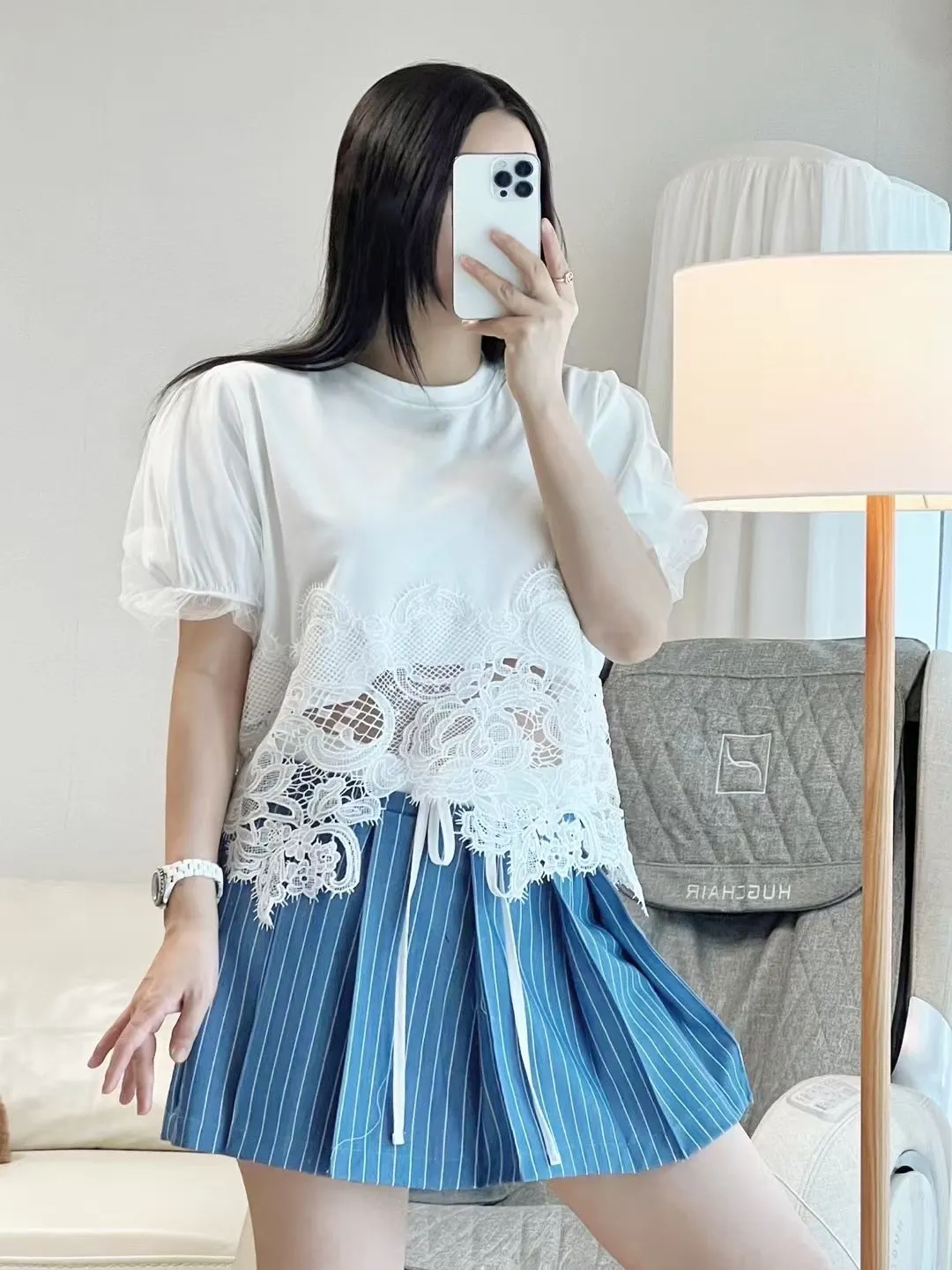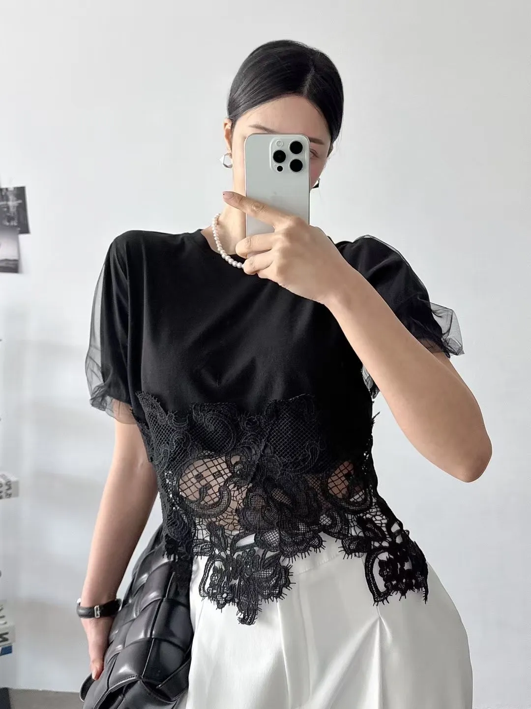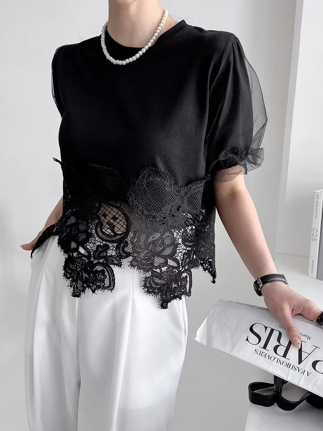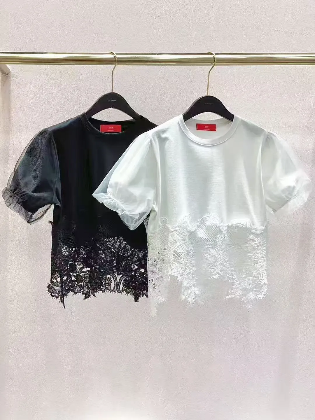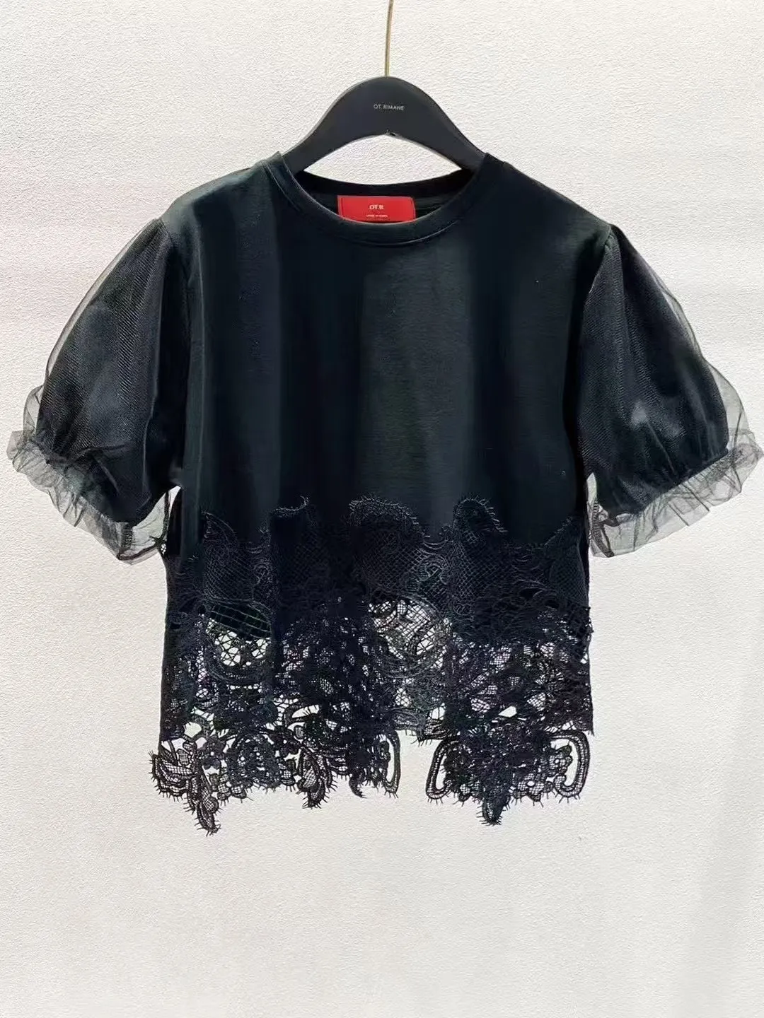 棉+蕾絲+網紗 網紗雙層袖 睫毛蕾絲下擺 夏天合適