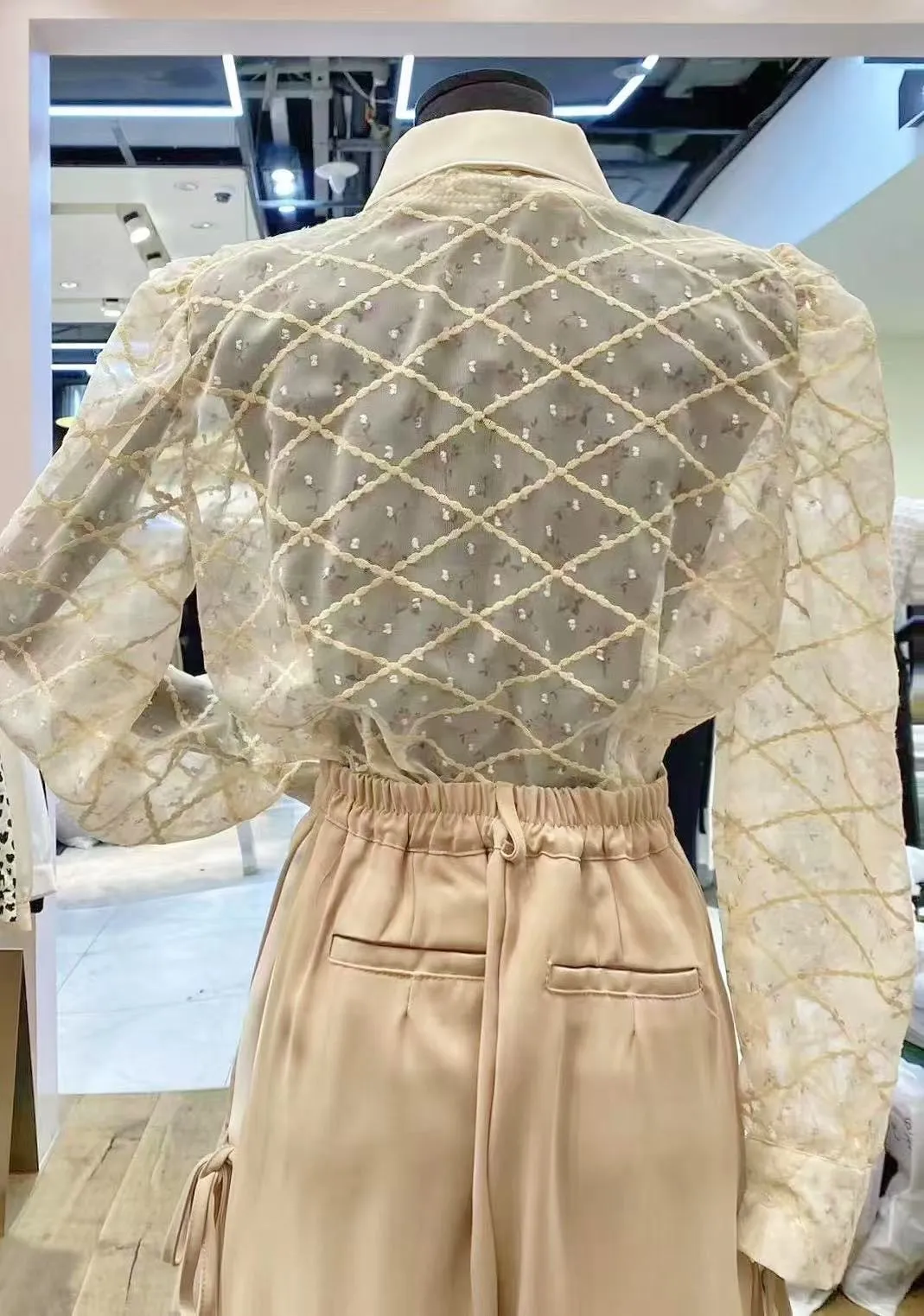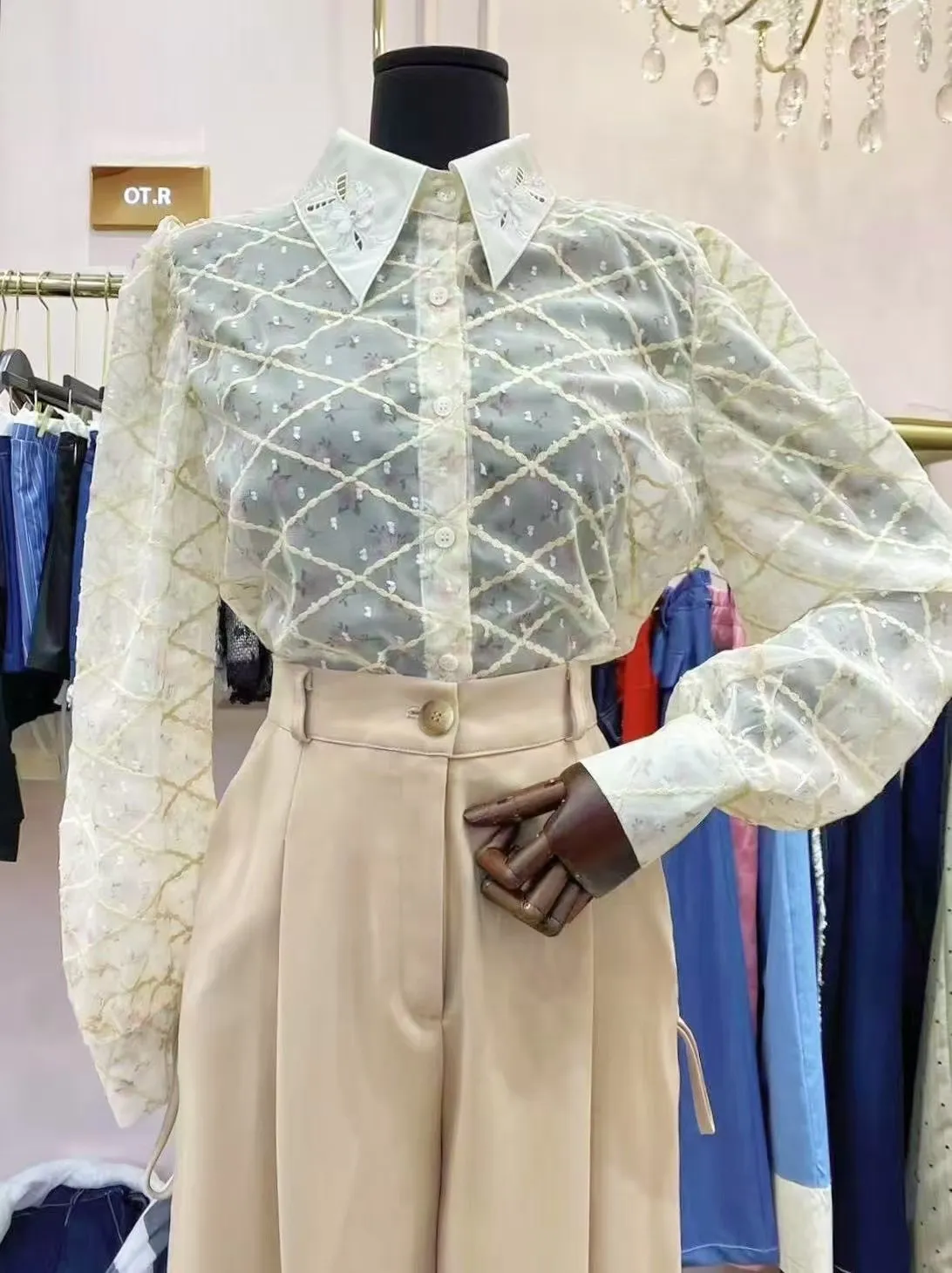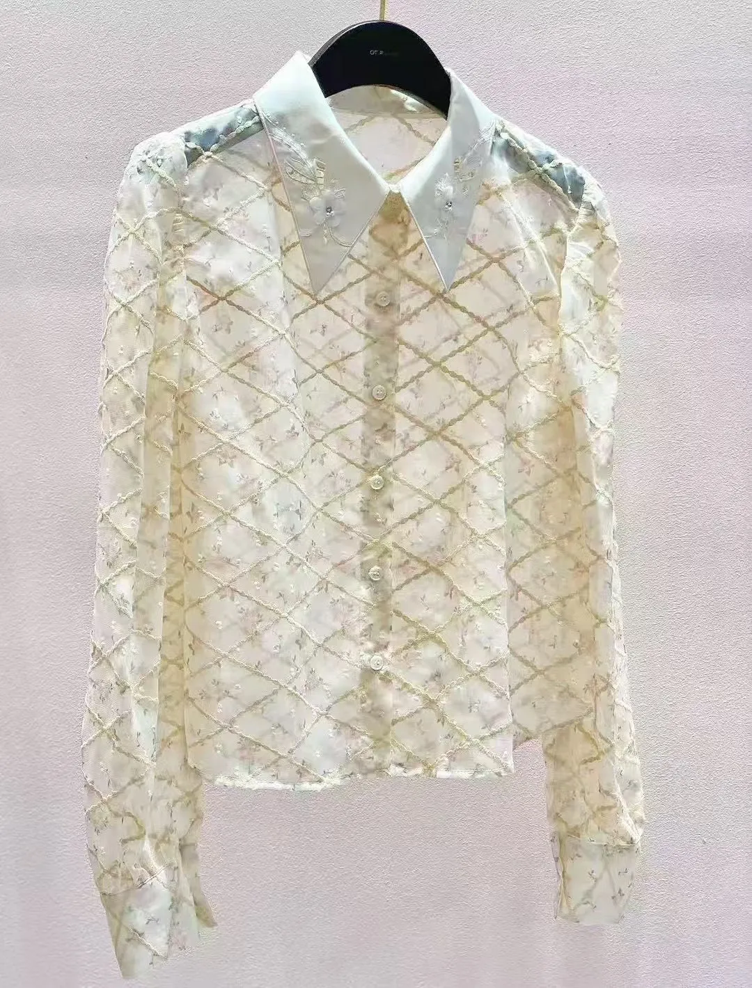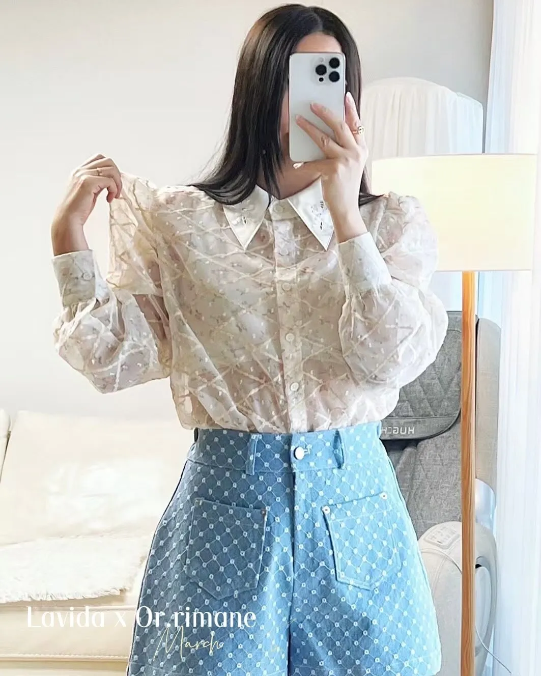 雪紡 視覺透光 排釦穿脫 水晶鑽小花翻領 夢幻若隱