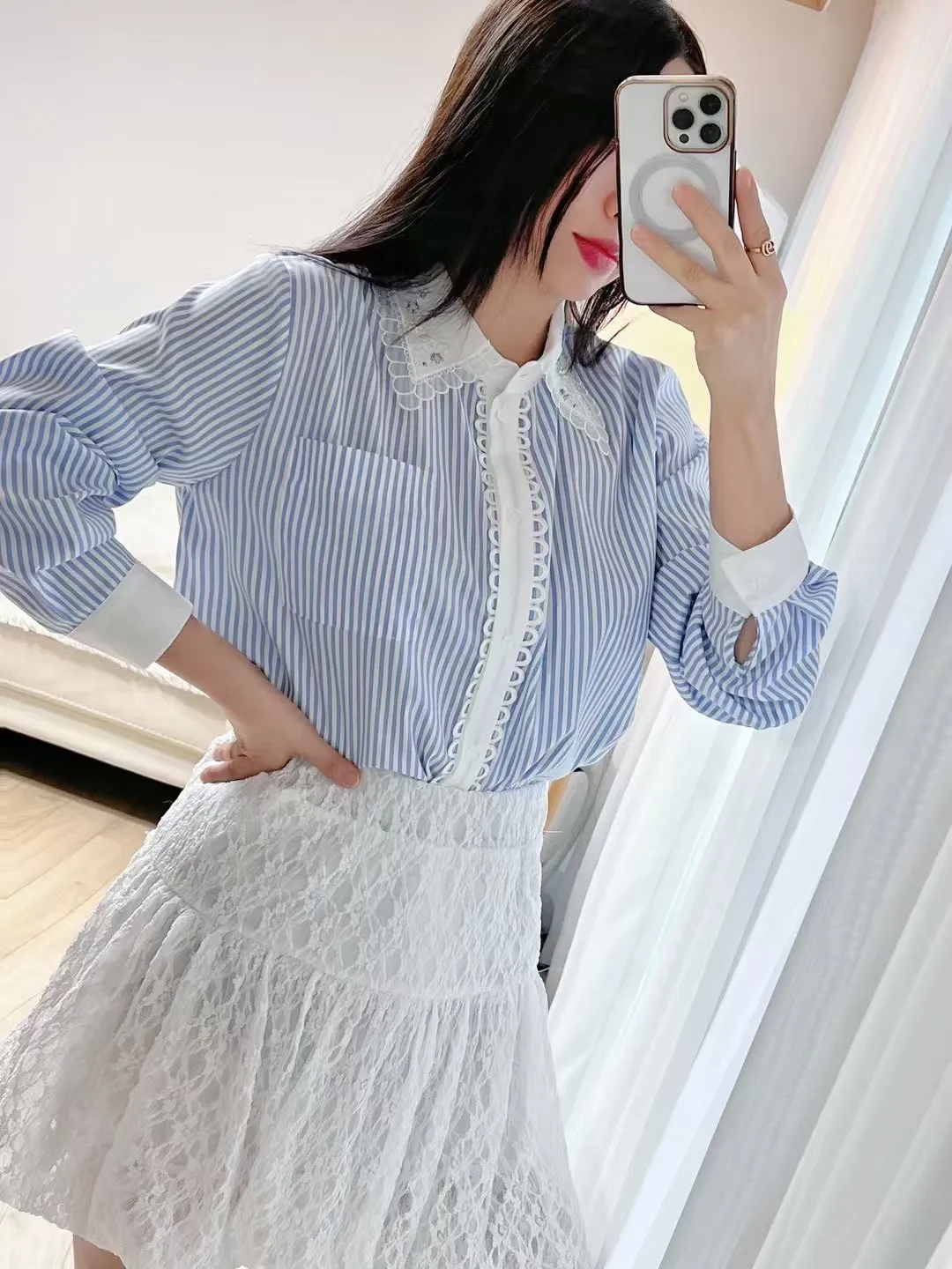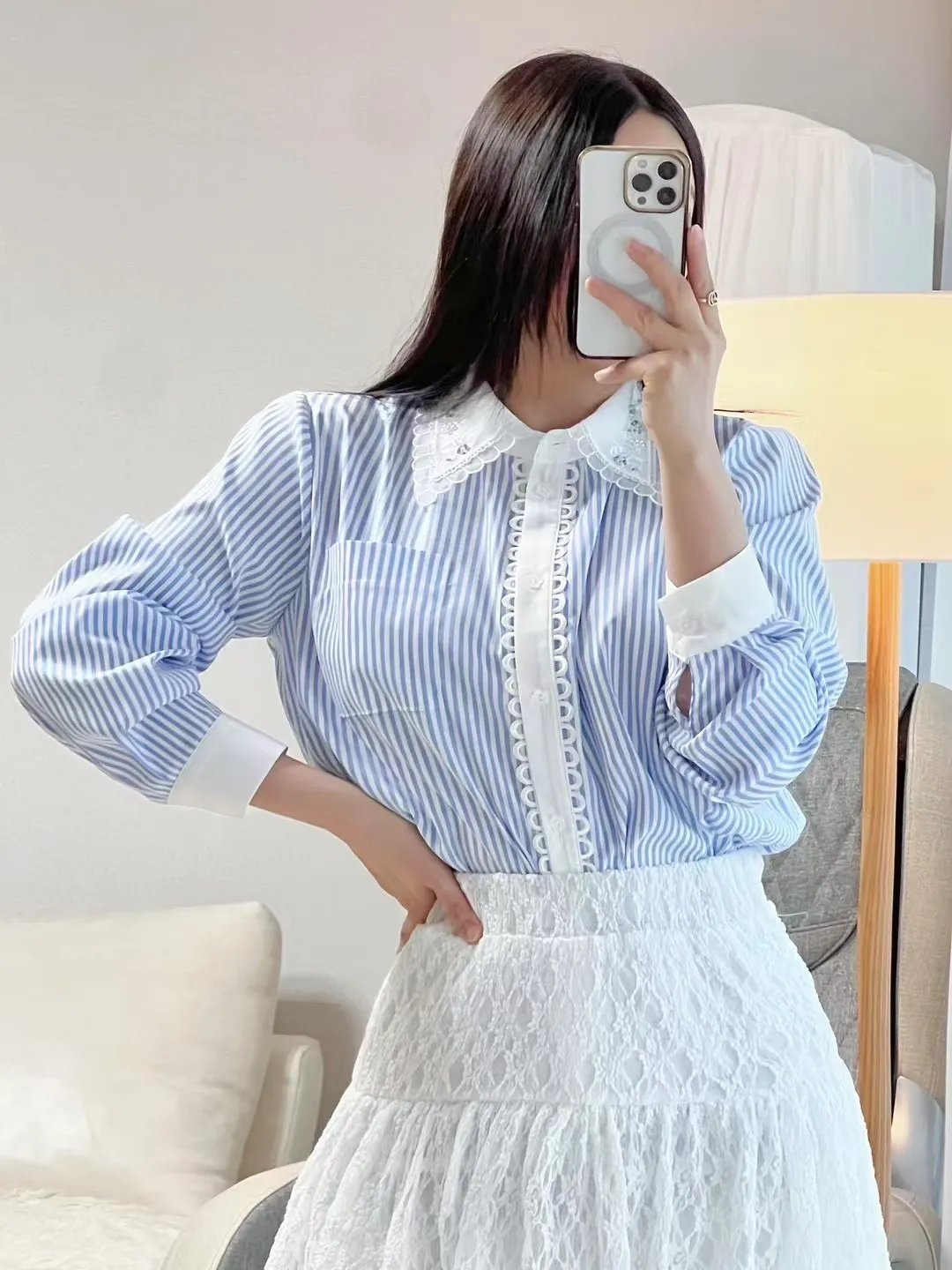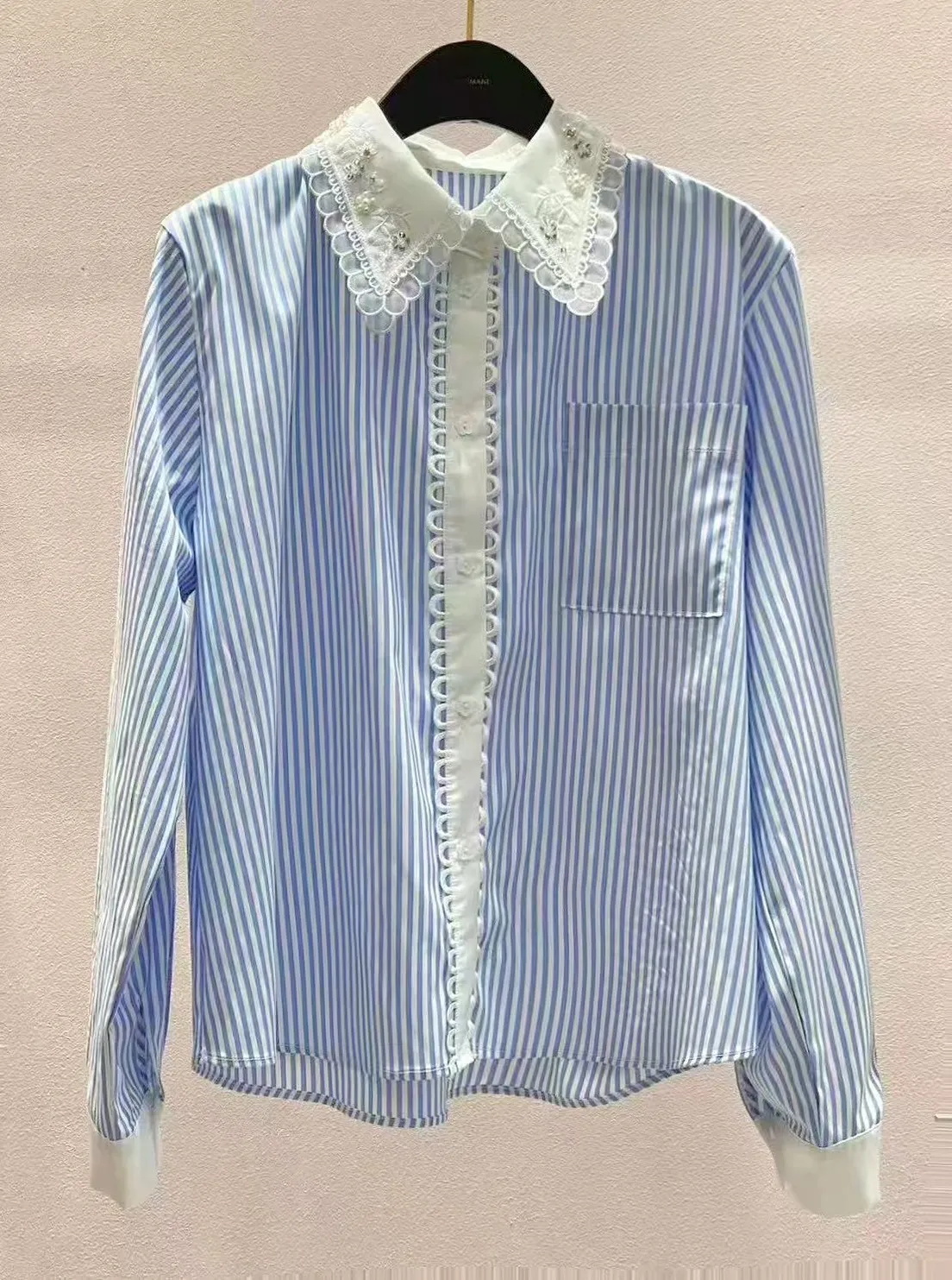 棉+聚酯 排釦圈圈蕾絲 梅花釦 天藍直條紋 L號友善