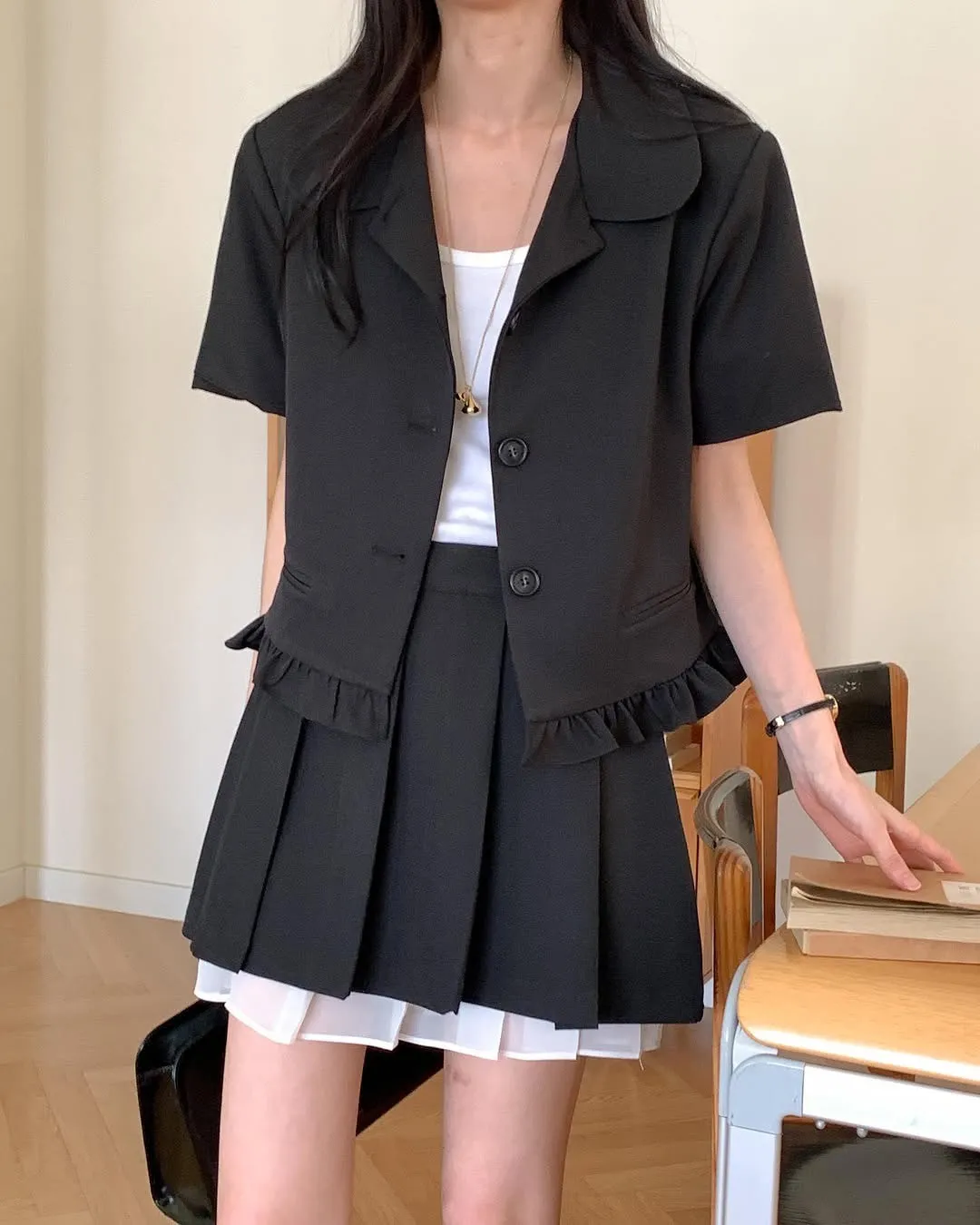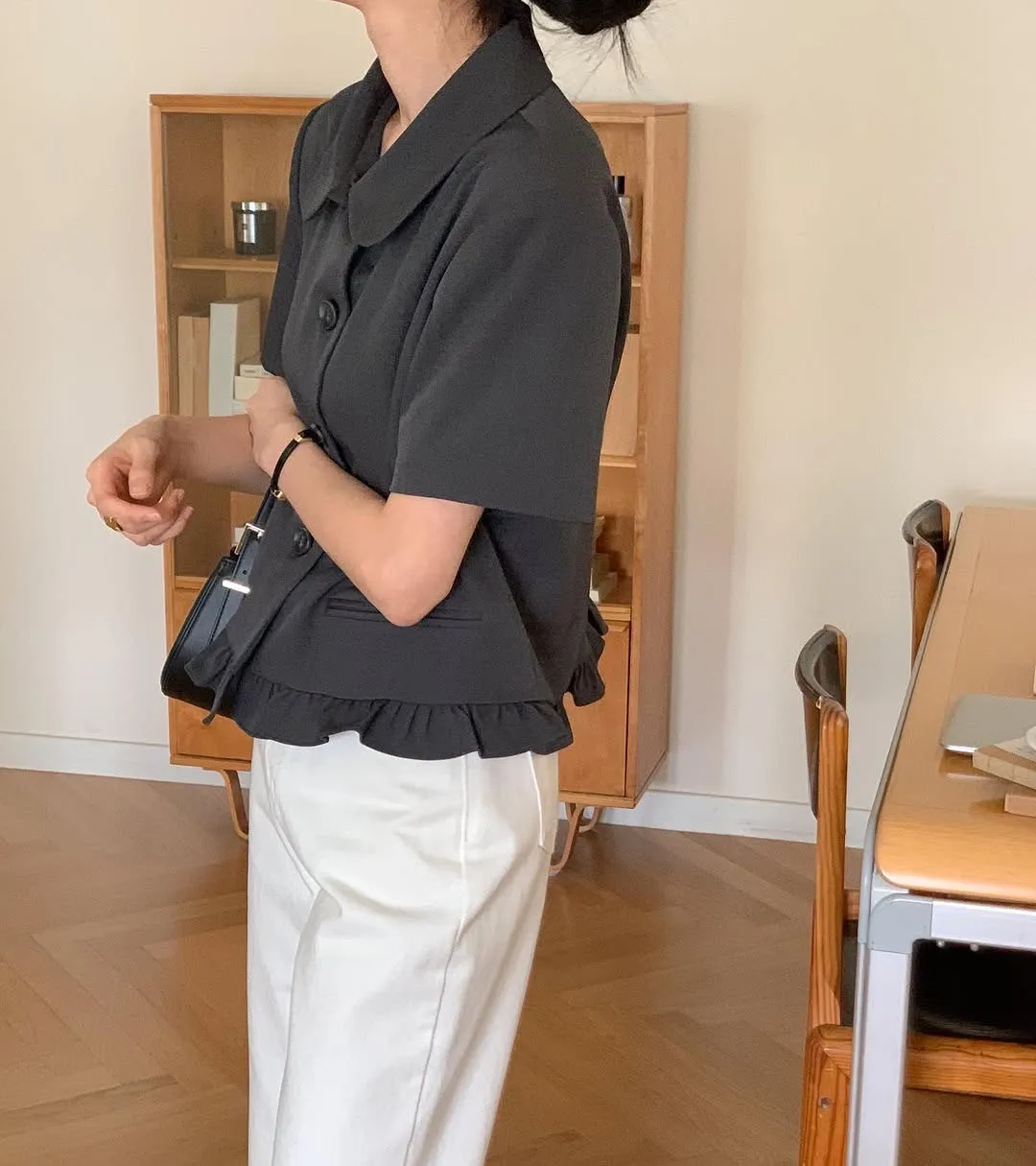 西裝面料 下擺荷葉滾邊 圓弧翻領 信封口袋 不易皺 穿到L號