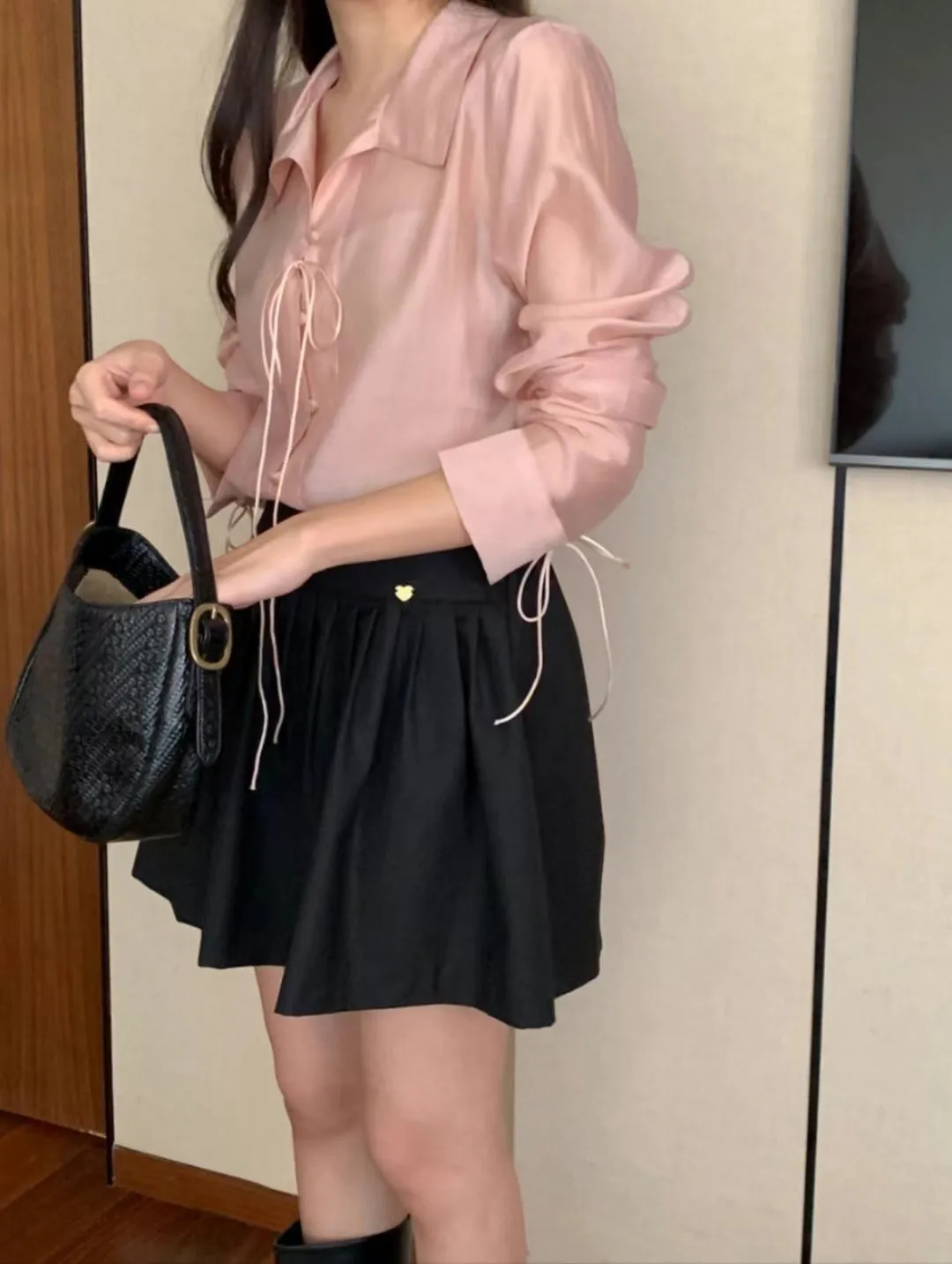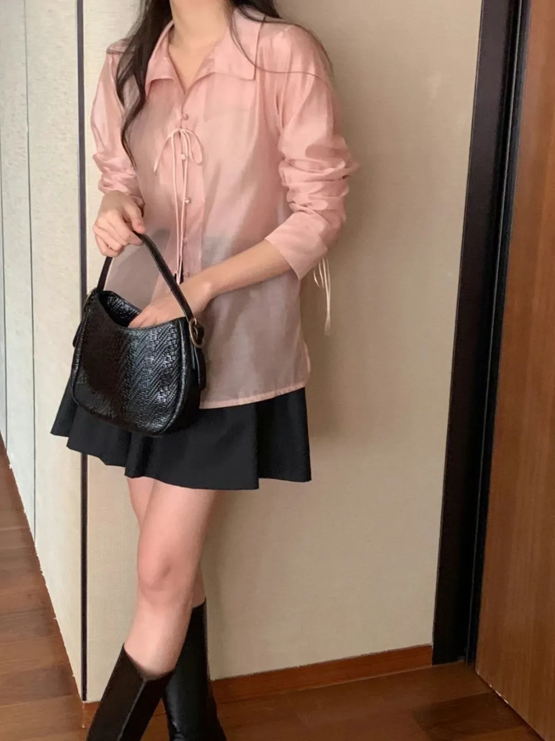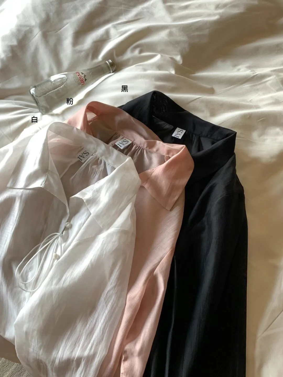 天絲+聚酯 輕盈薄款 柔軟舒適 細洞釦胸前綁帶 縫線不刺