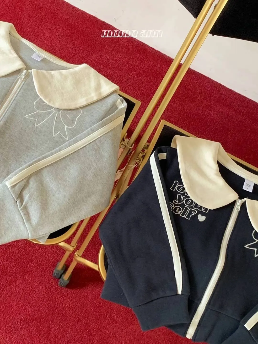 UU068運動翻領胸前蝴蝶結拉鍊上衣 灰 藍 5 7 9 11 13 $770 15 17 $810 (線上價再-30元)