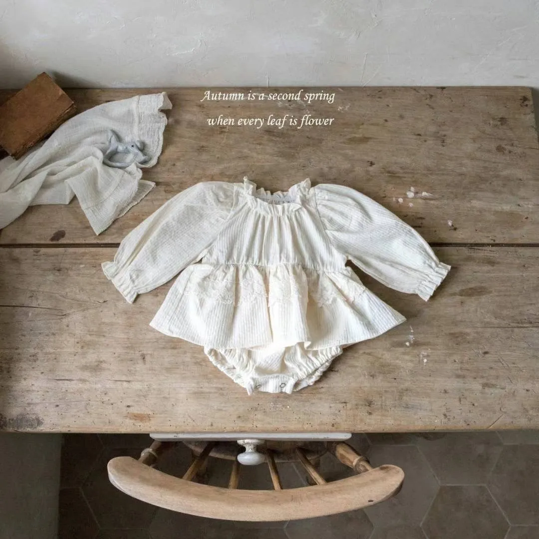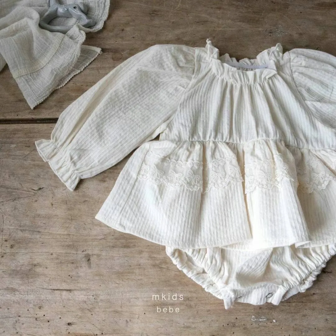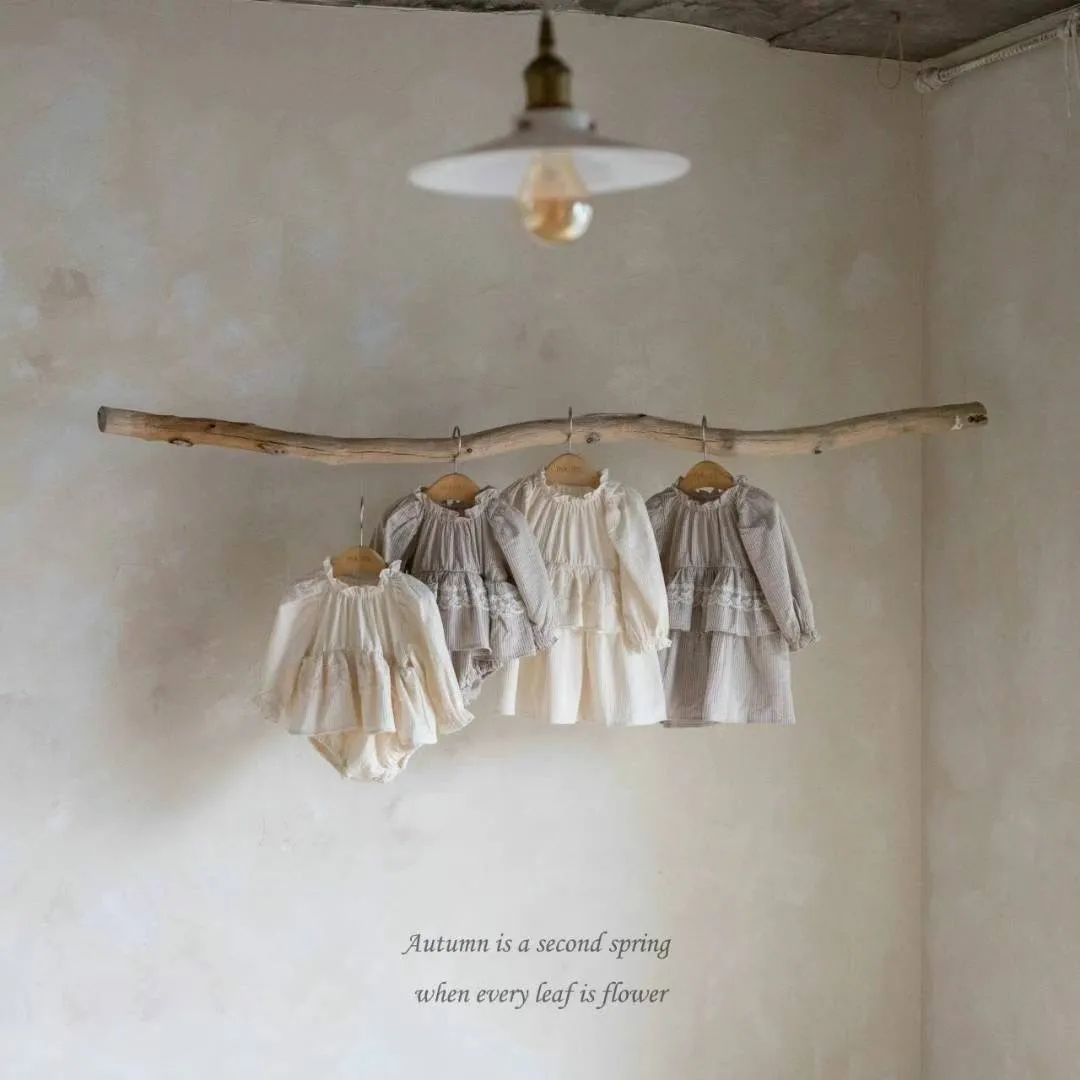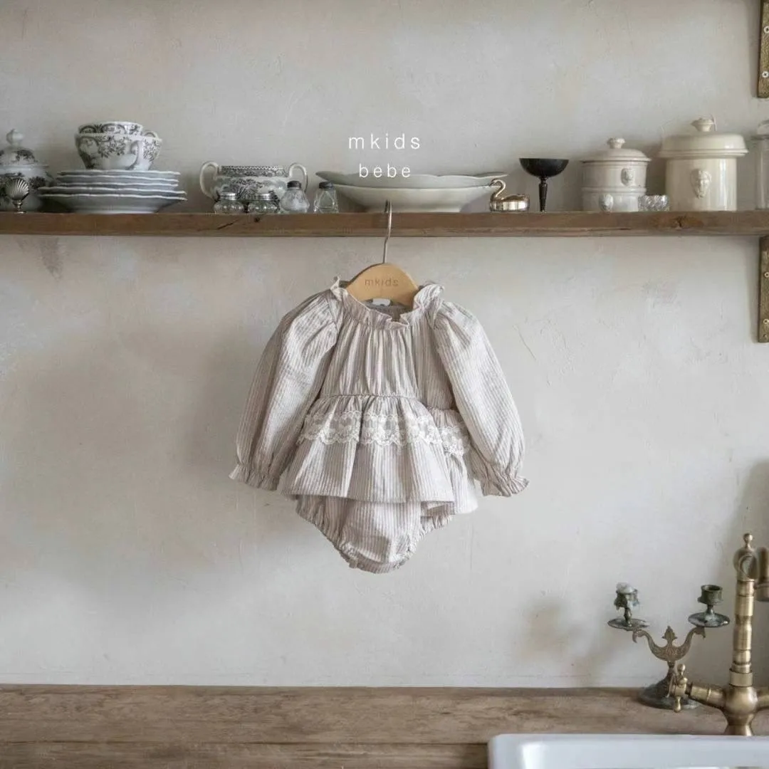 UU202荷葉領直條紋布蕾絲包屁衣 米 奶茶 XS S M 原價$790 線上價$760