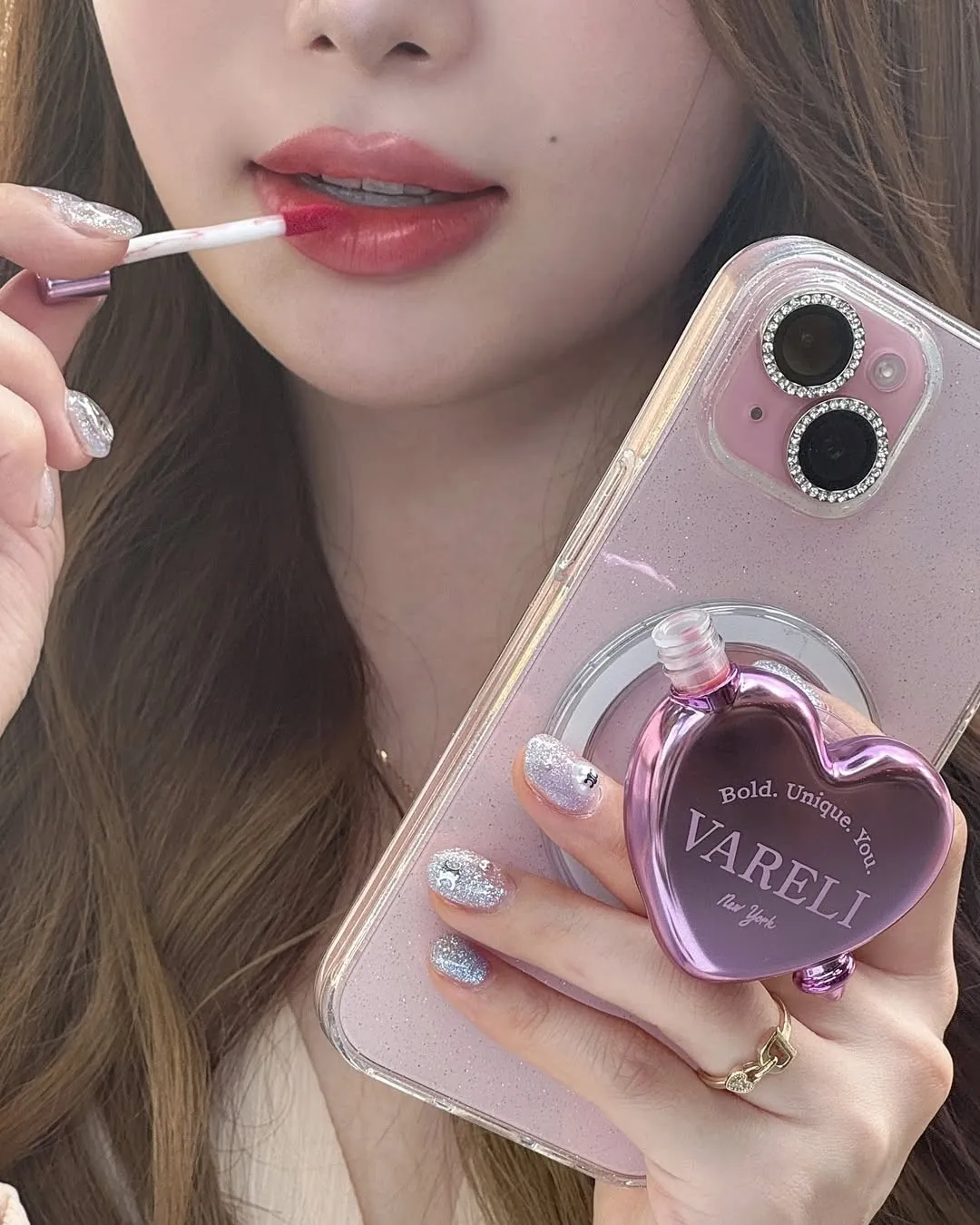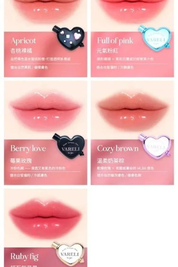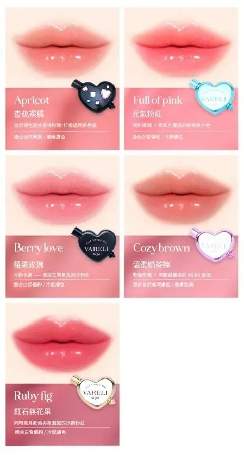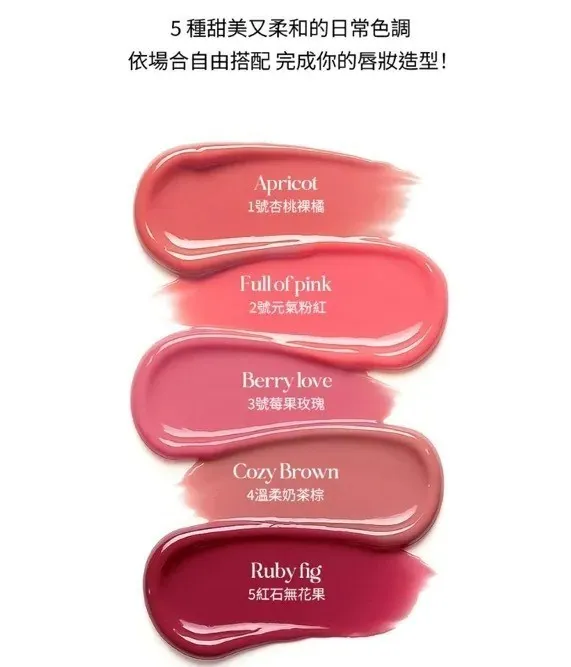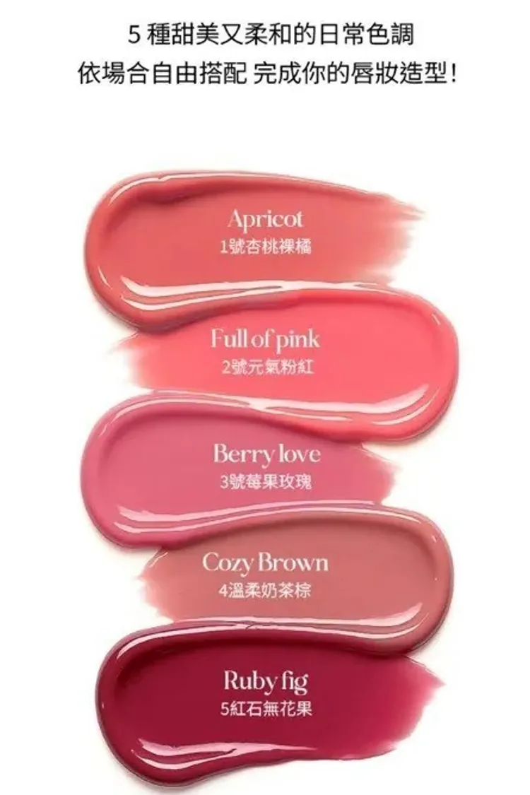VAR001愛心潤澤手機支架唇釉(4.5g) 01 02 03 04 05 售價$49901 APRICOT 杏桃裸橘02 FULL OF PINK 元氣粉紅03 BERRY LOVE 莓果玫瑰04 COZY BROWN 溫柔奶茶棕05 RUBY FIG 紅石無花果水潤光澤質地 輕盈好延展為嘴唇打造清透感 上唇不會黏黏的 容量 4.5g 內容物 唇釉*1,磁吸環*1,支架*1