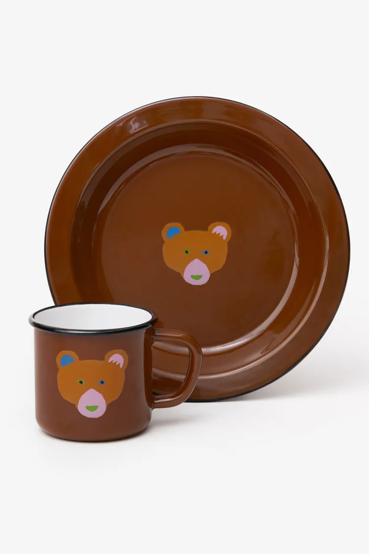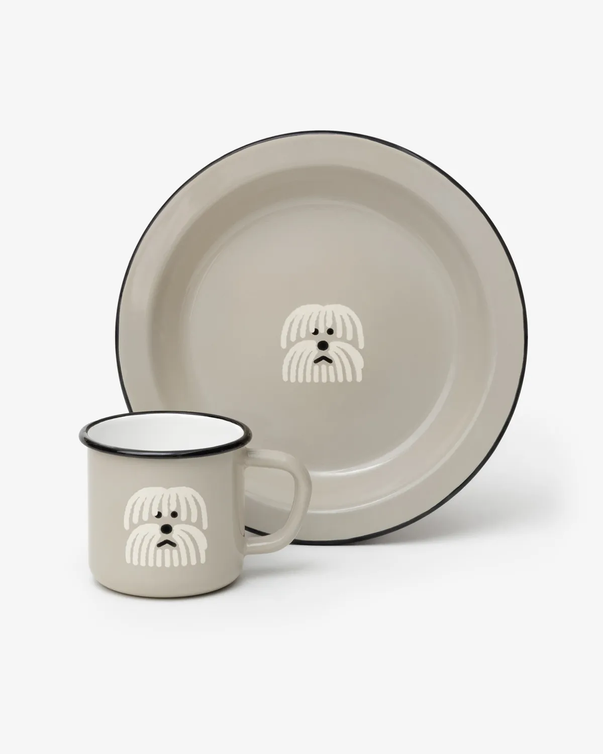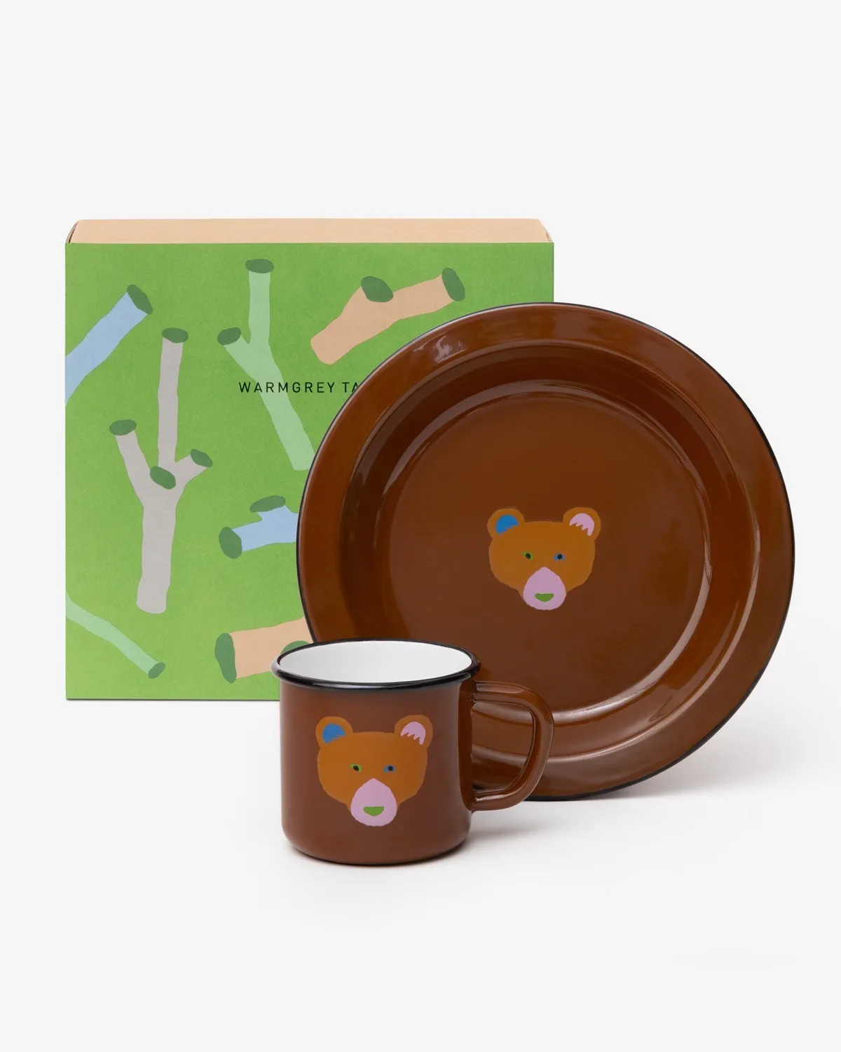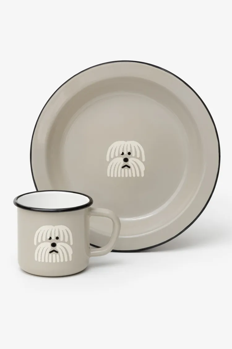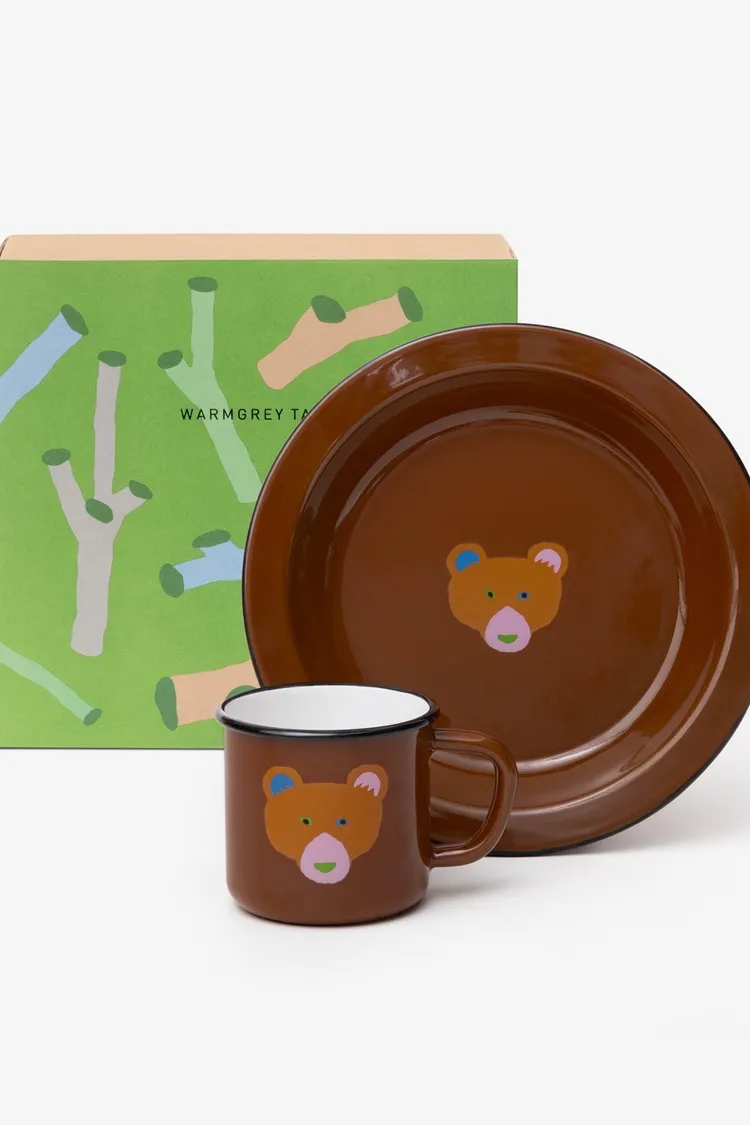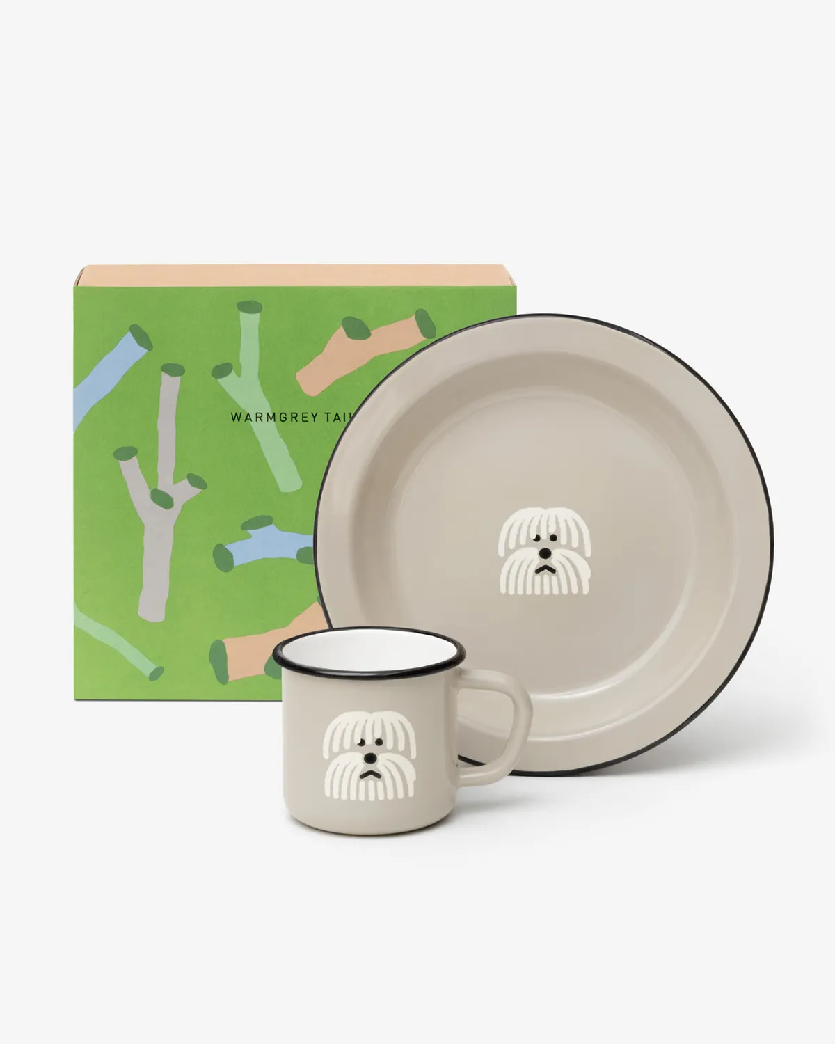 這是一套兩件裝的Warmgreytail琺瑯馬克杯和餐盤禮盒。
