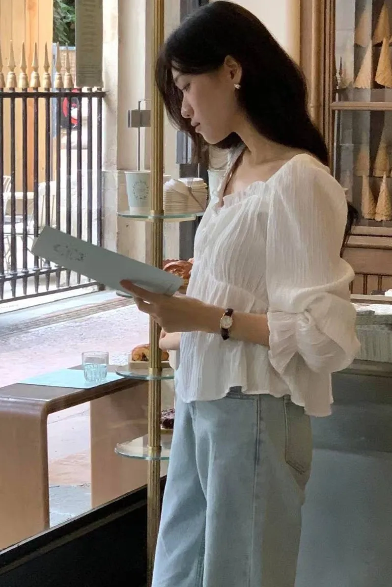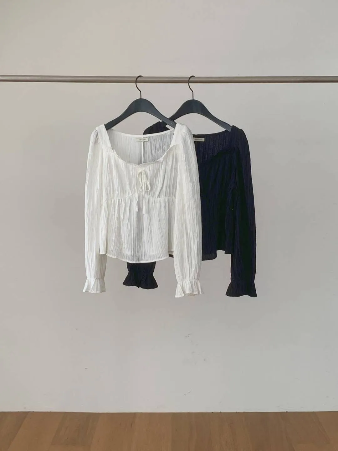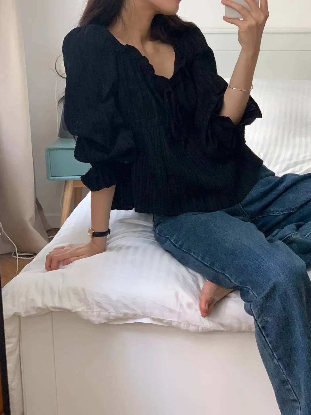 縲縈+聚酯+彈力 桃心荷葉領 細緻髮絲面料 手袖鬆緊 細節感十足