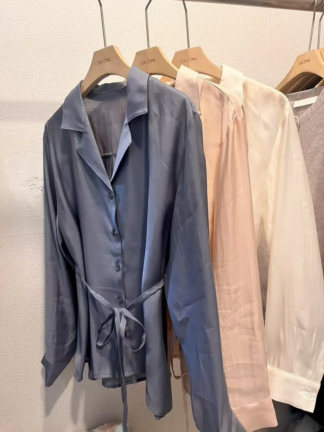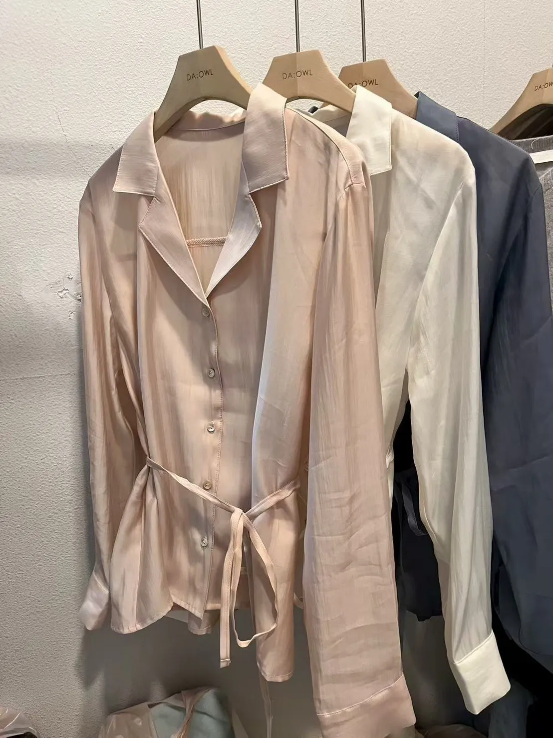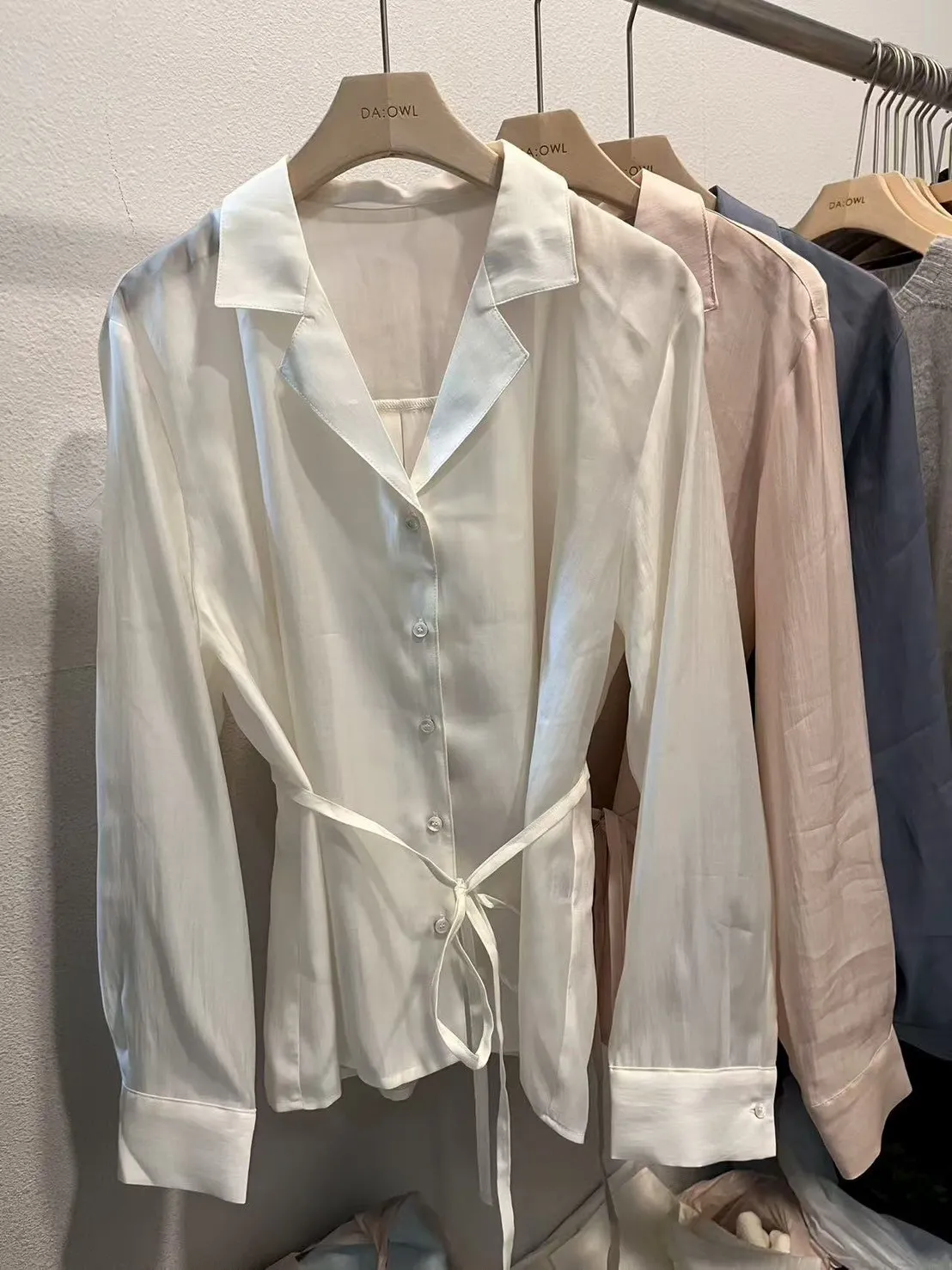 WB248薄款透光西裝領腰綁帶長袖上衣(附綁帶) 米 粉 藍 官網價$850 線上價$820