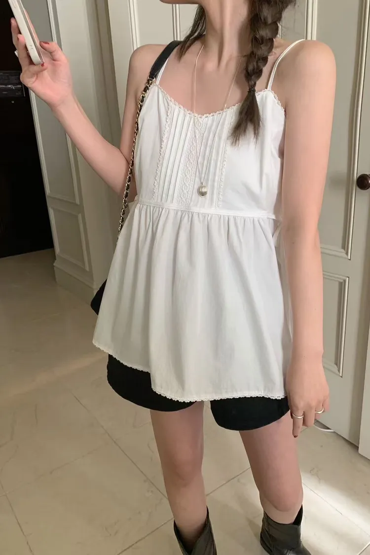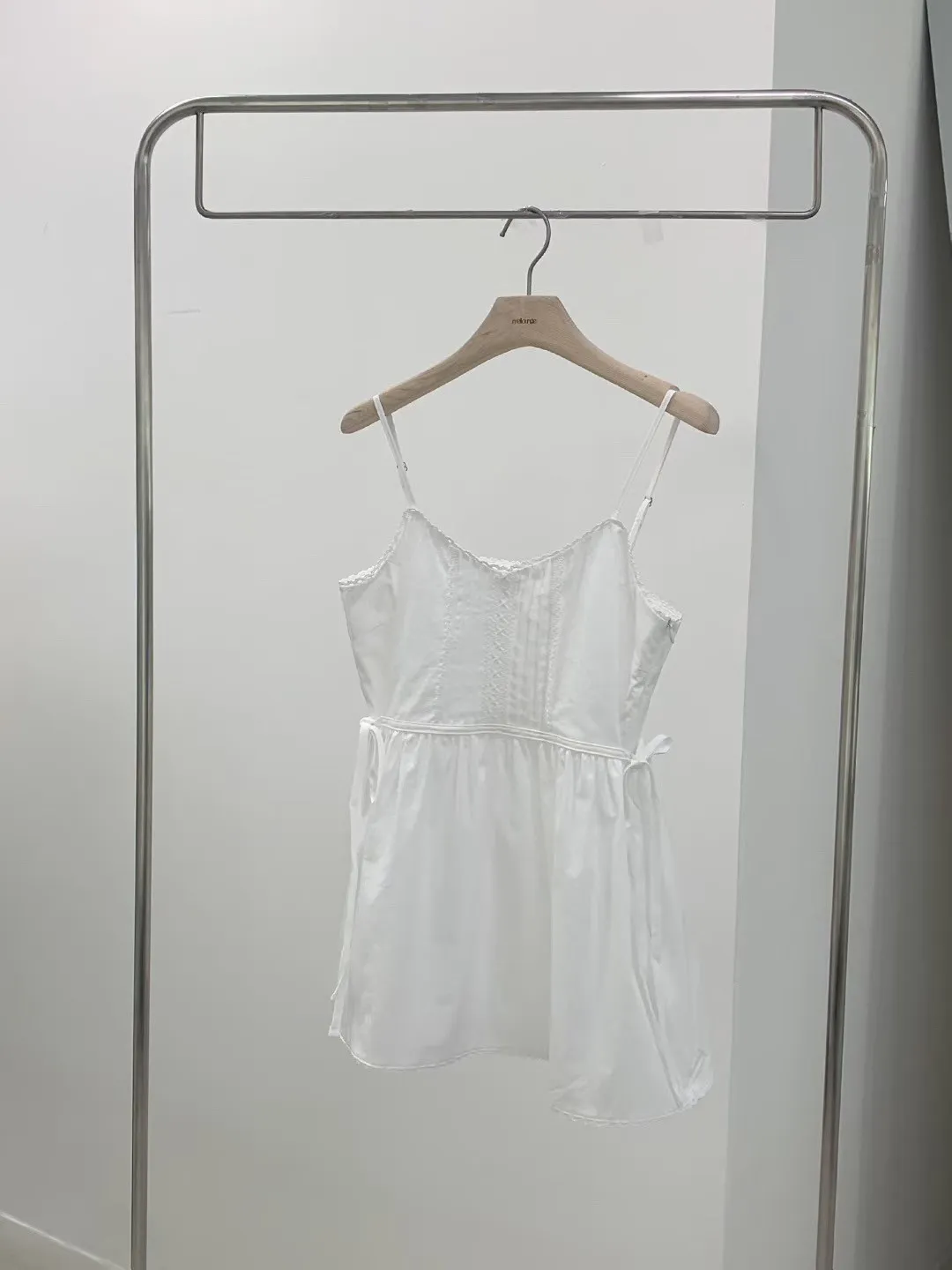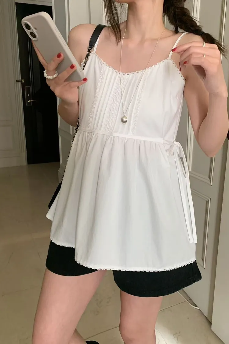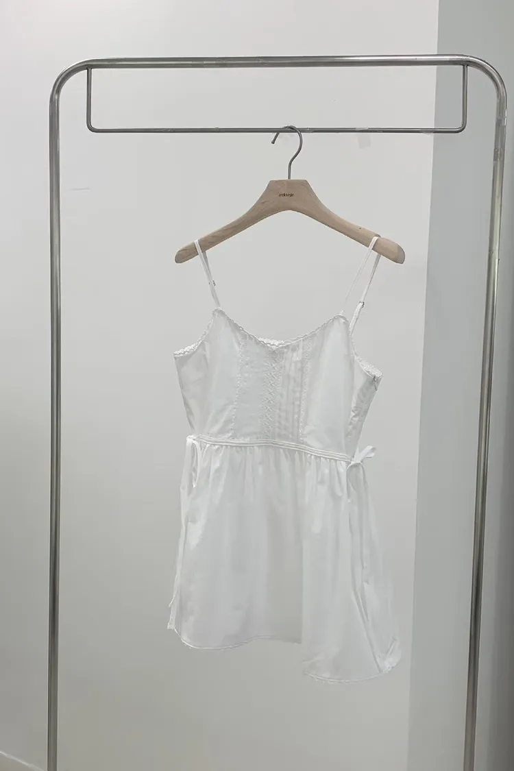 棉 雙側腰綁帶 肩帶可調 挺度面料 自然高腰傘擺 細緻蕾絲滾邊