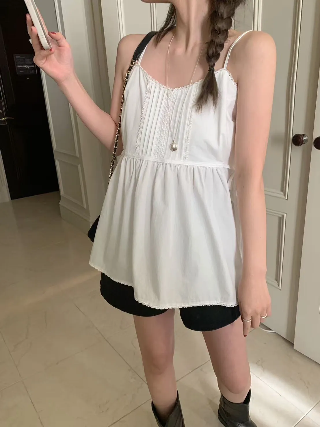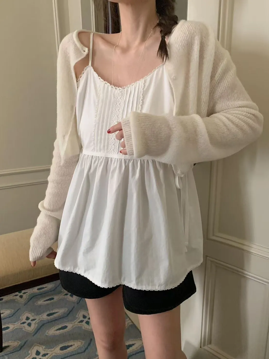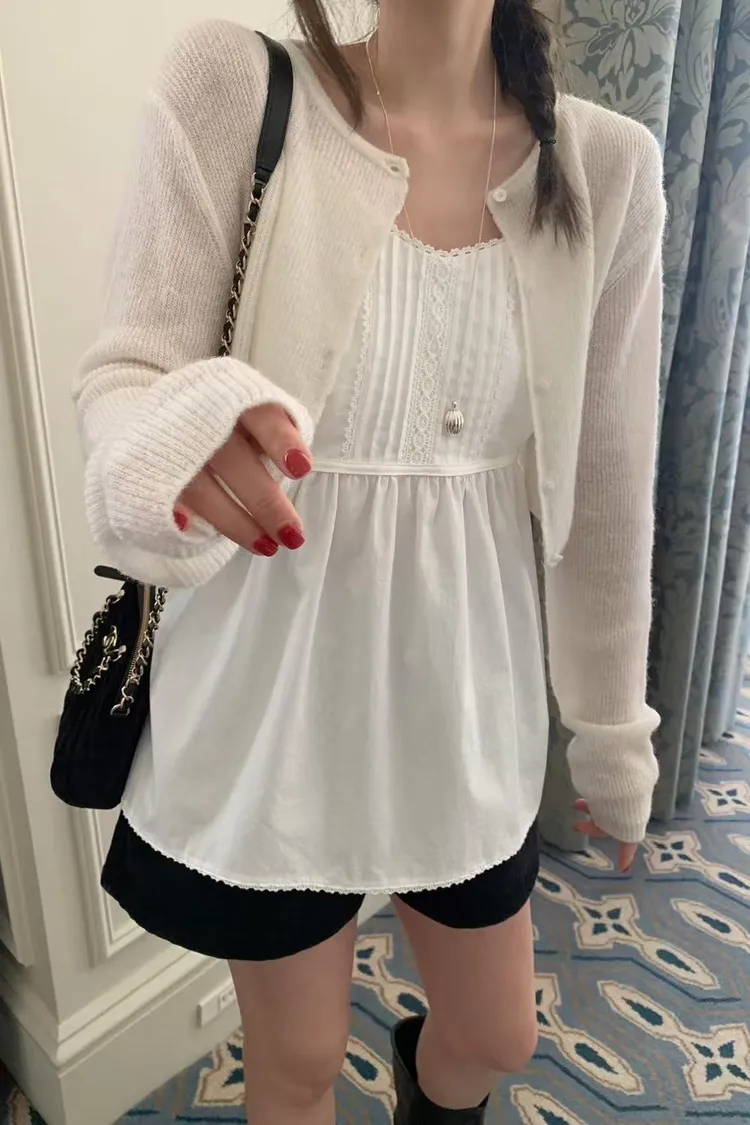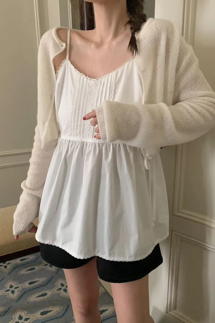 棉 雙側腰綁帶 肩帶可調 挺度面料 自然高腰傘擺 細緻蕾絲滾邊