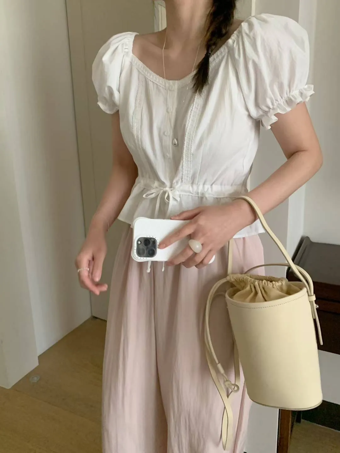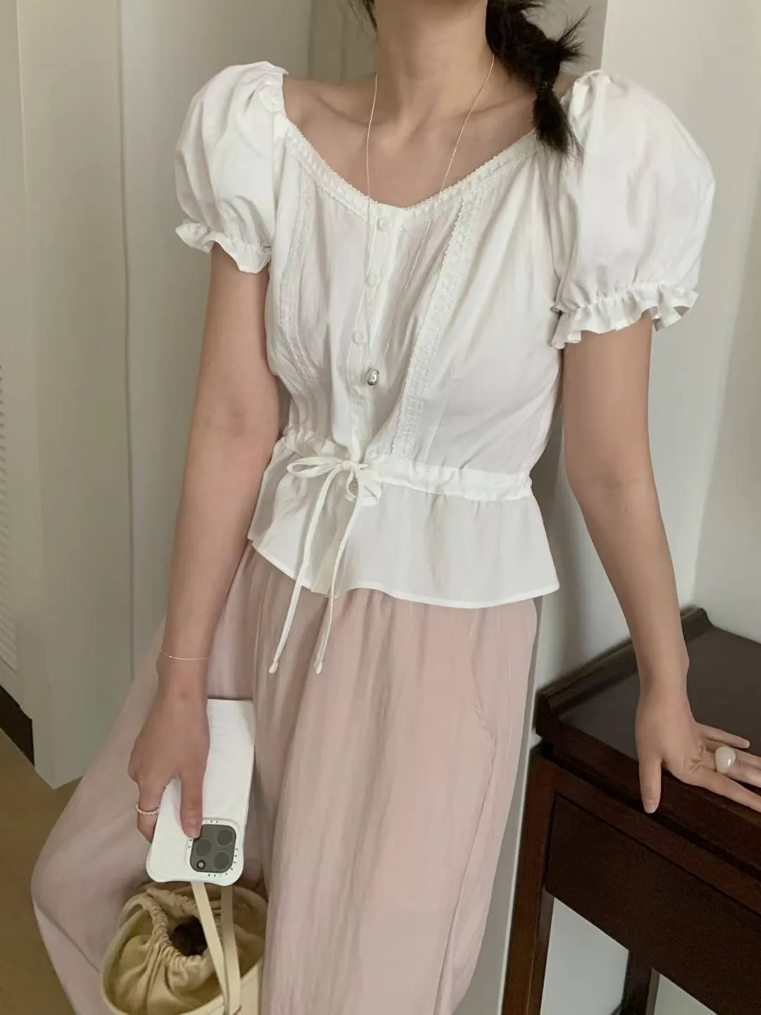 棉 細腰抽繩 袖口鬆緊 可拉一字領 娃娃裝下擺 穿到M號 微透