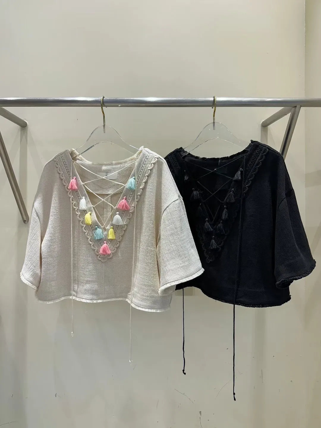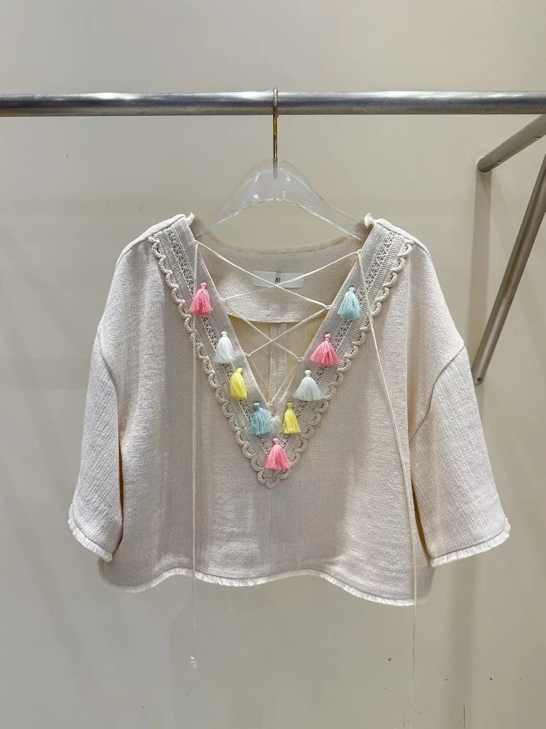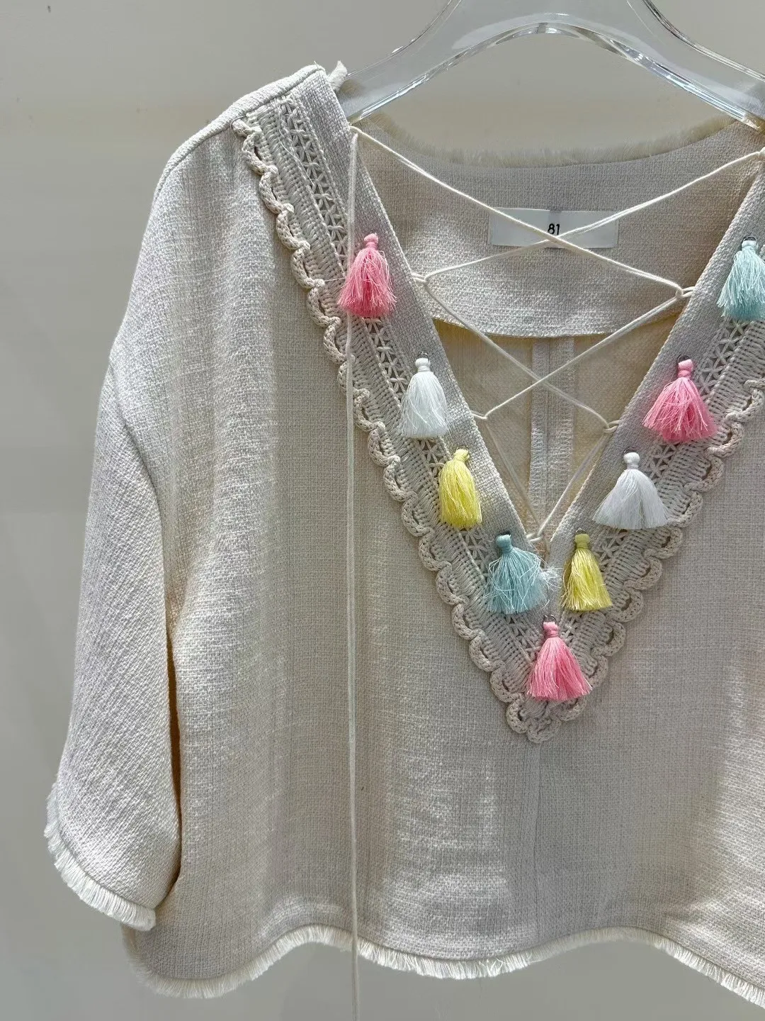 棉+亞麻 細緻面料 手工流蘇 五分寬袖 空間舒適