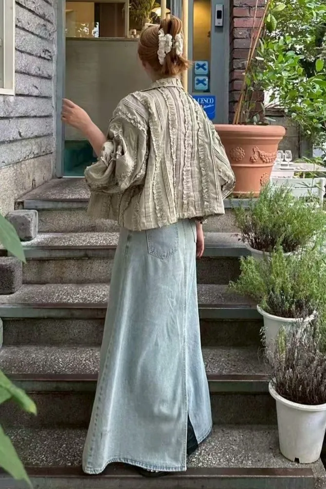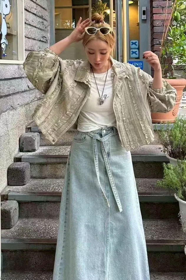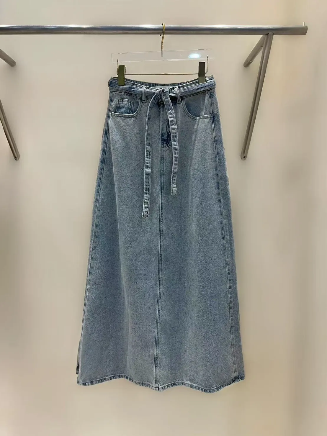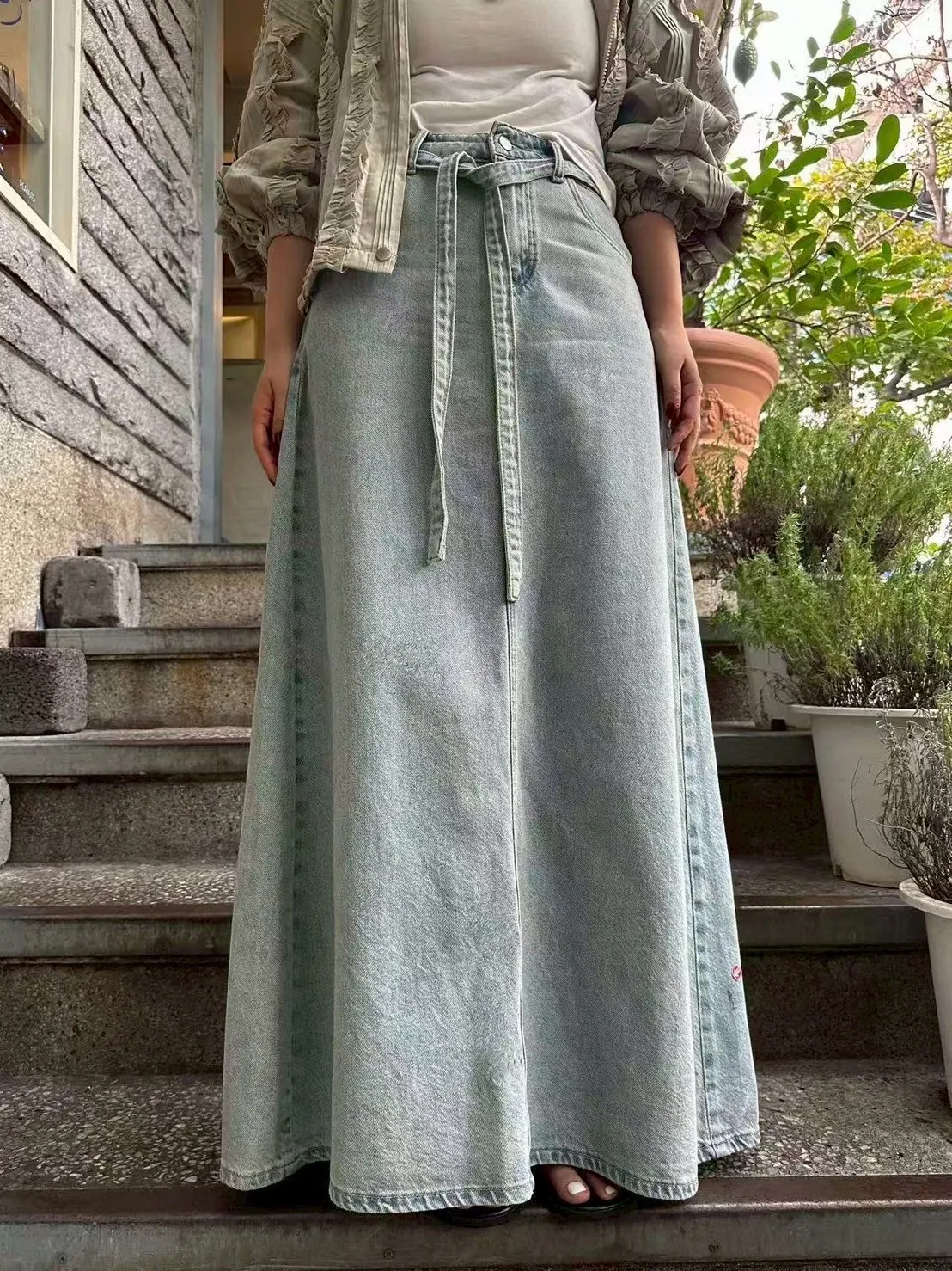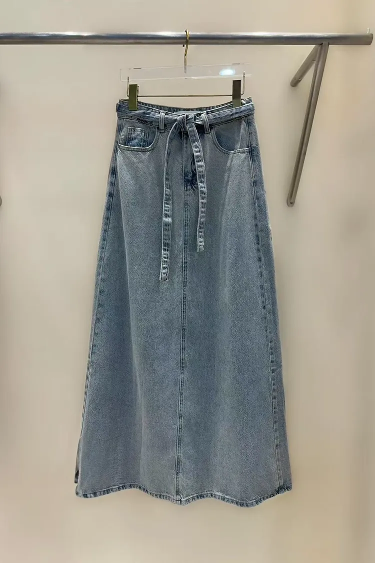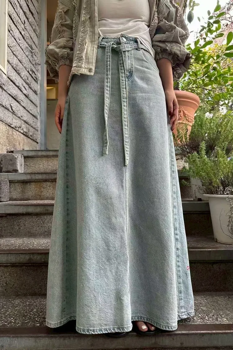 棉 薄款柔軟 復古淺藍 釦鍊穿脫 同色丹寧腰綁帶 後開叉 百搭色系
