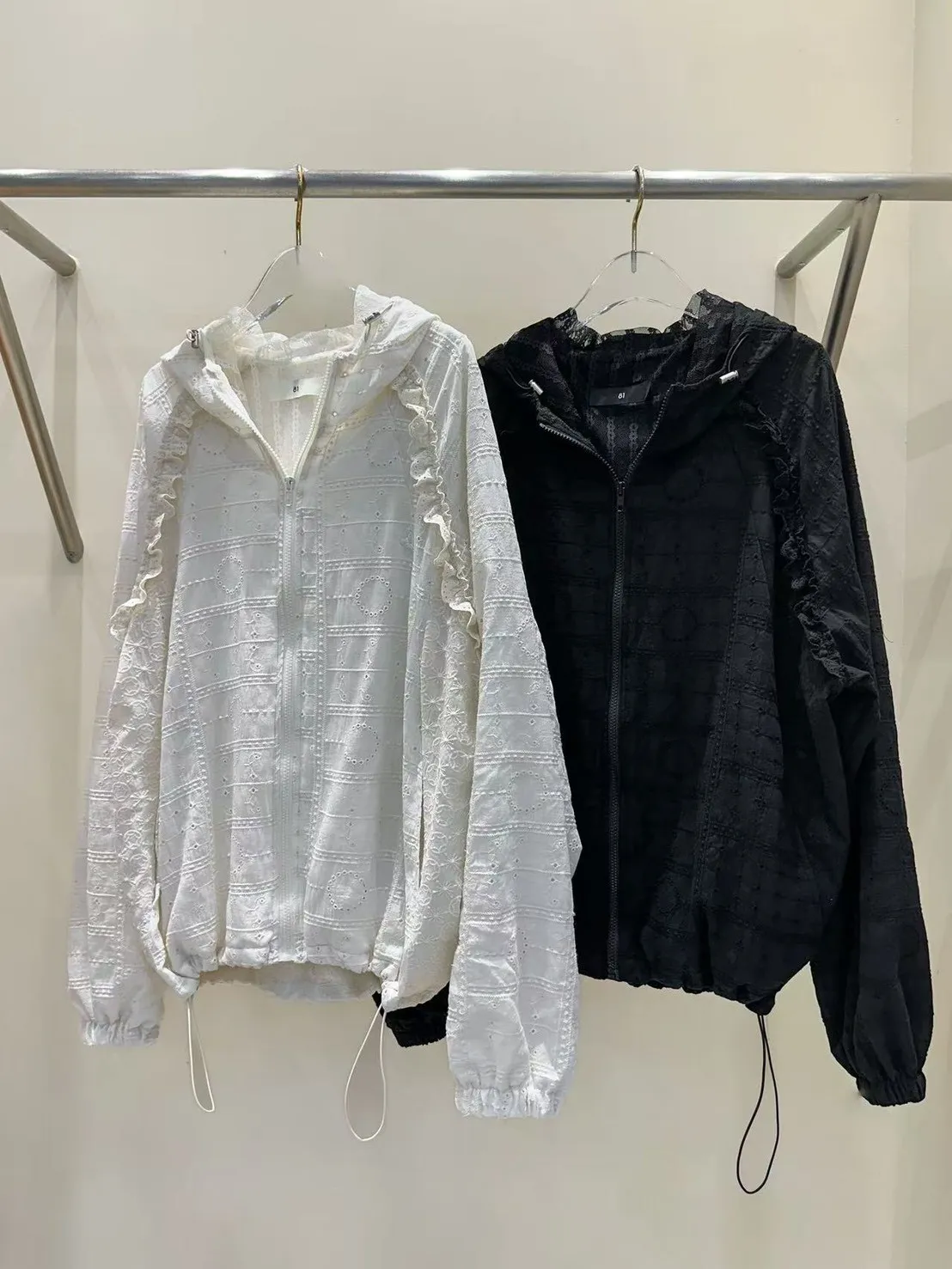 棉+聚酯 親膚不刺癢 細緻蕾絲 拉鍊穿脫 連帽設計 網紗內裡 下擺抽繩