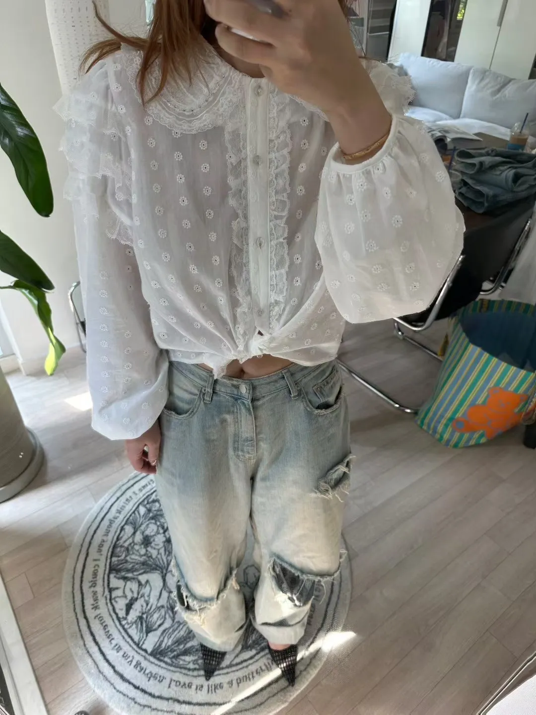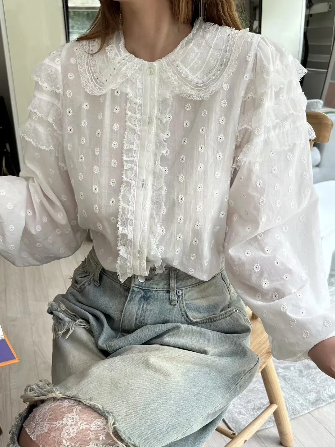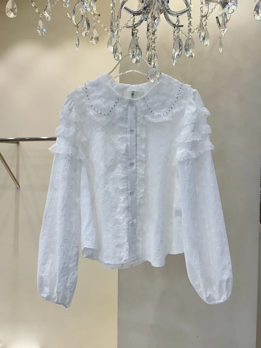 棉+聚酯+網紗 鑲水晶網紗翻領 燒花蕾絲 層次美肩蕾絲