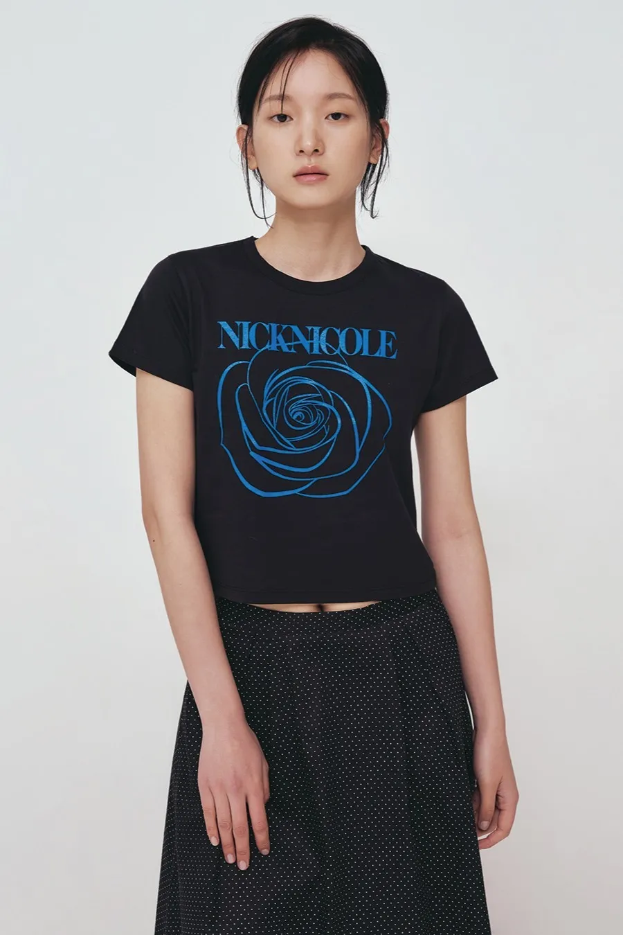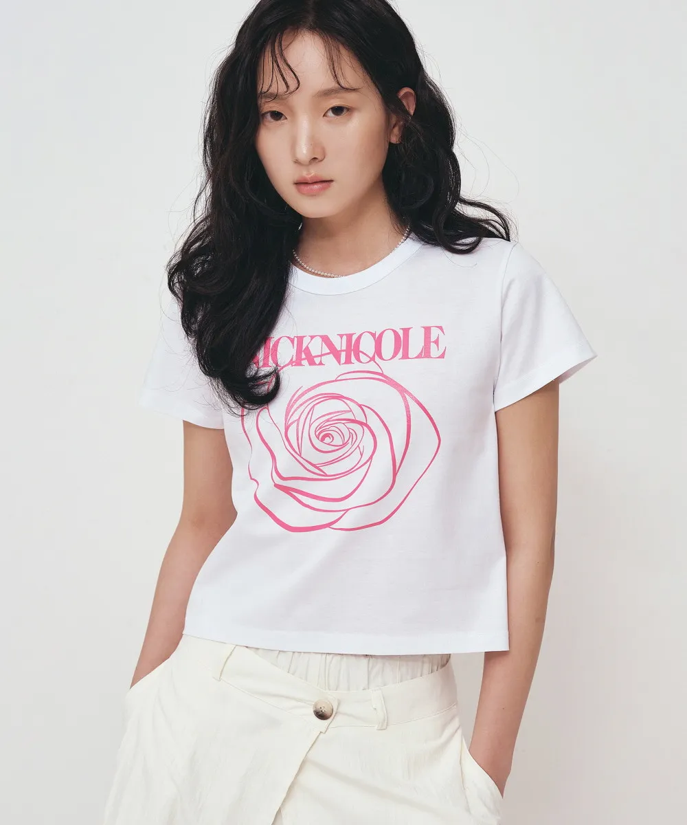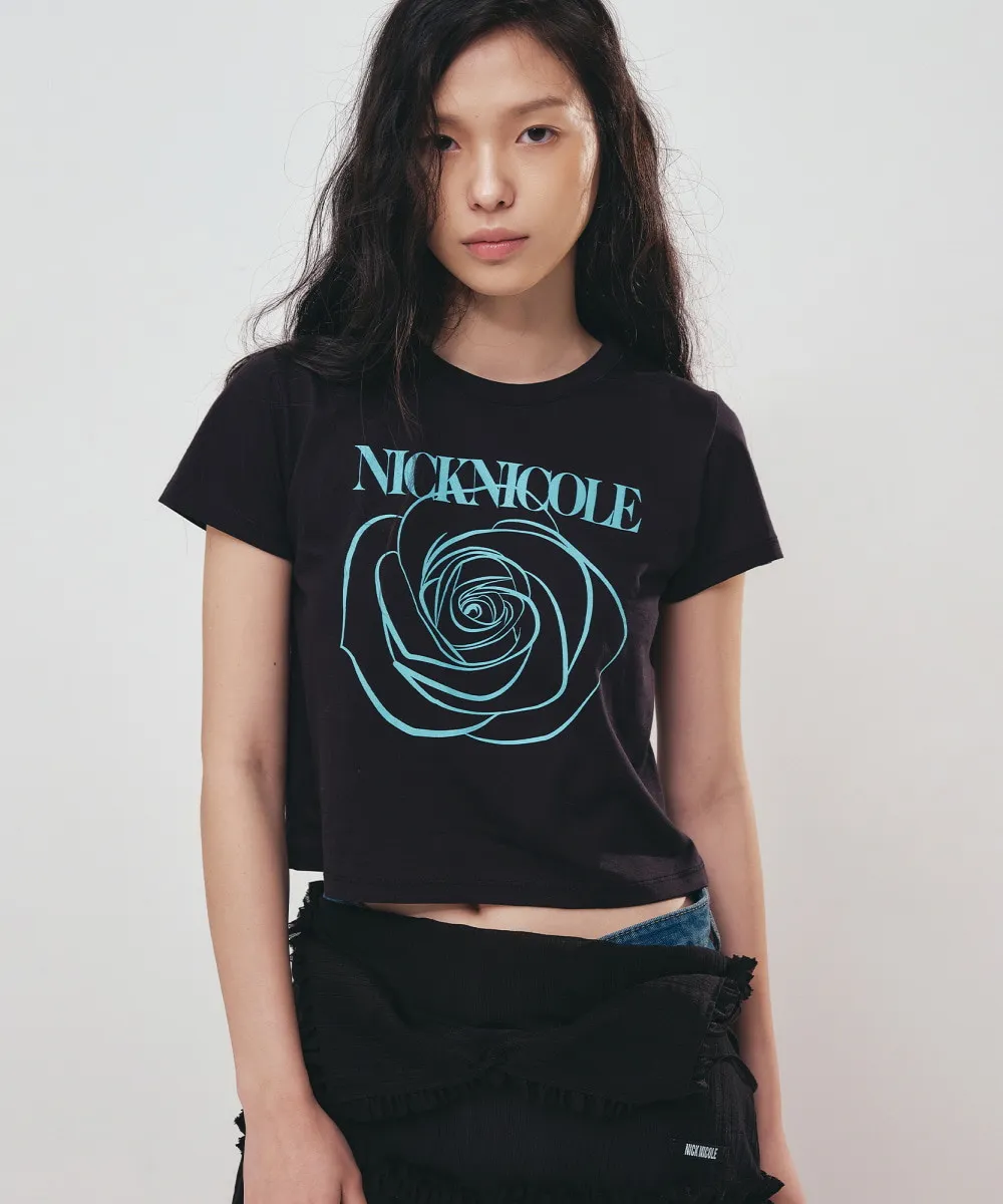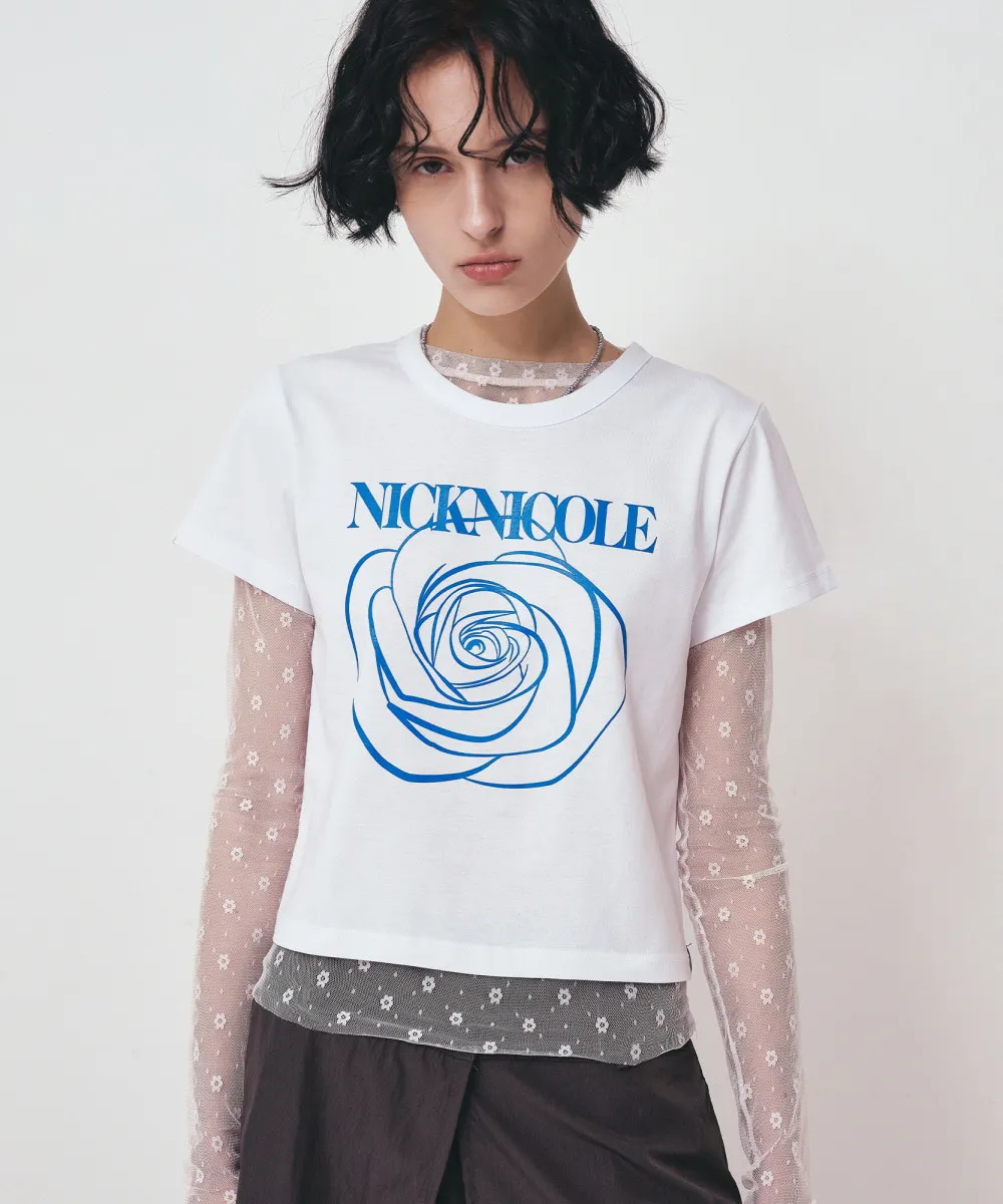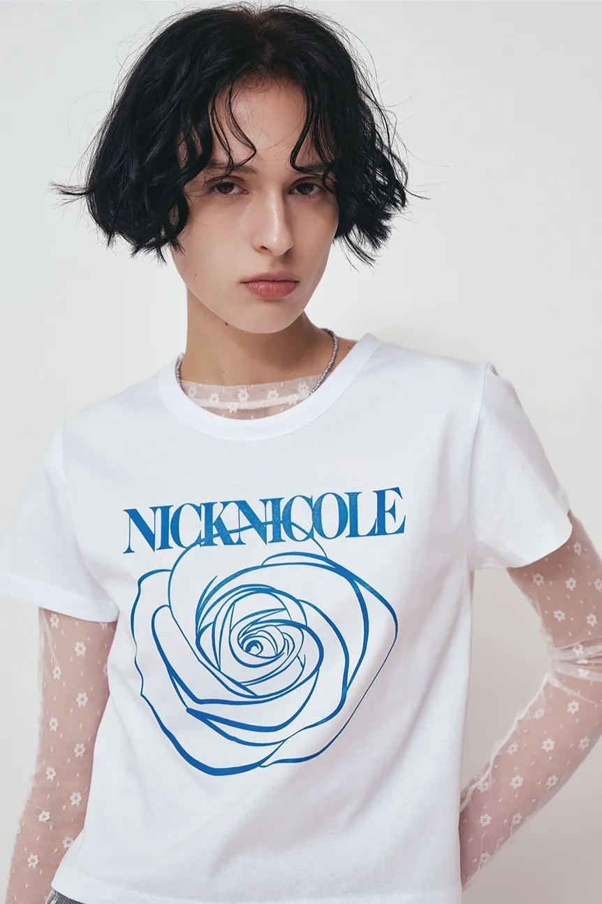 WB594經典Nick nicole玫瑰花Tshirt(短版) 黑淺藍 黑紅 黑粉 黑深藍 白銀 白 粉 白綠 白藍 黃黑 官網價$899 線上價$869