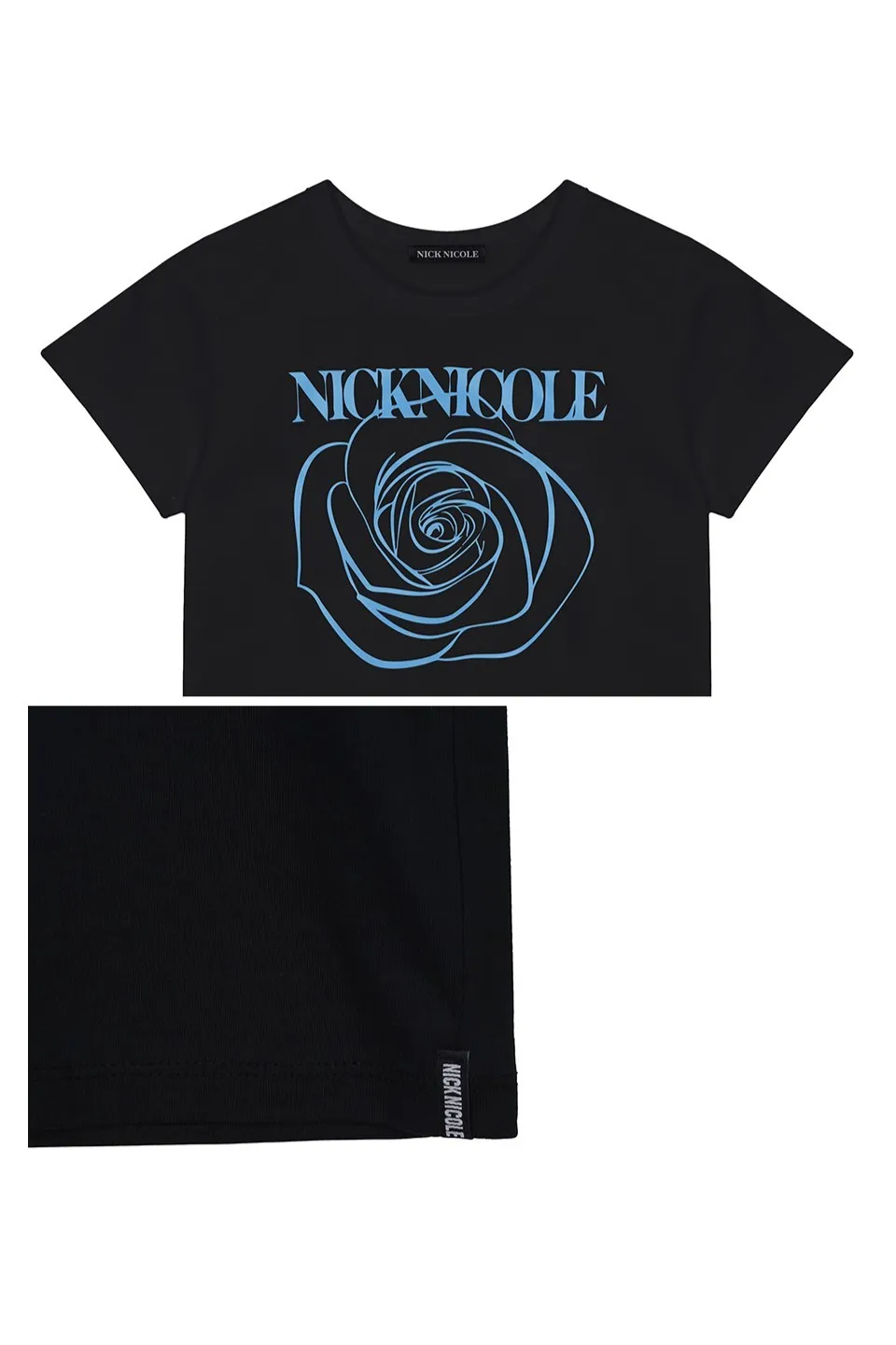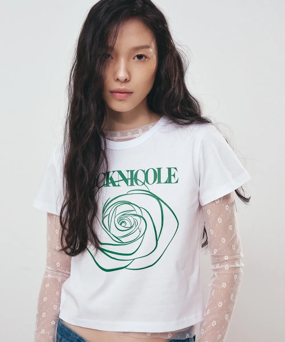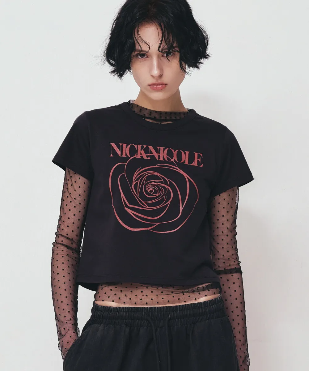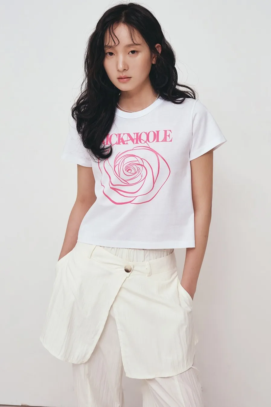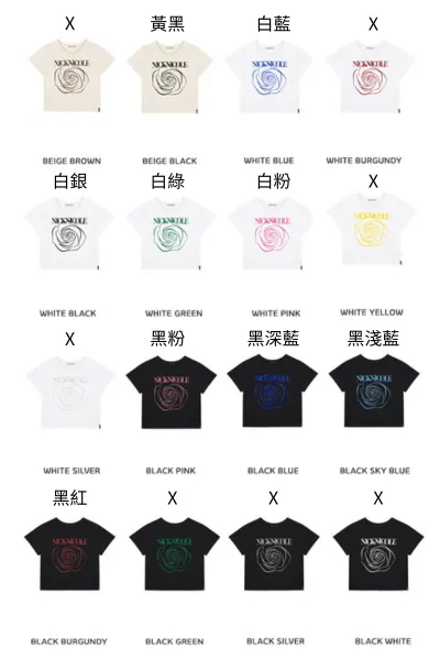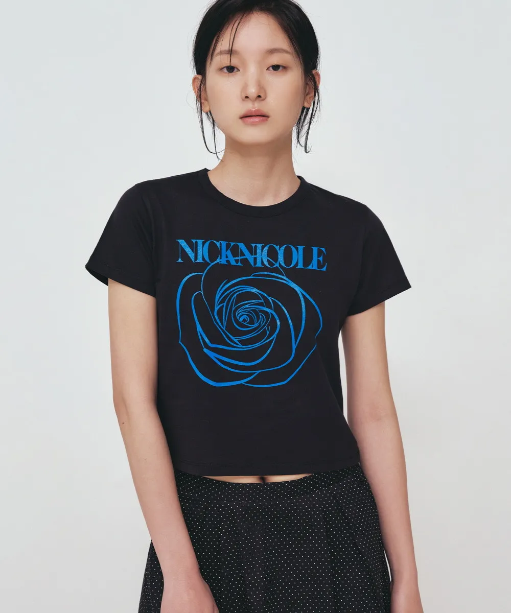 WB594經典Nick nicole玫瑰花Tshirt(短版) 黑淺藍 黑紅 黑粉 黑深藍 白銀 白 粉 白綠 白藍 黃黑 官網價$899 線上價$869