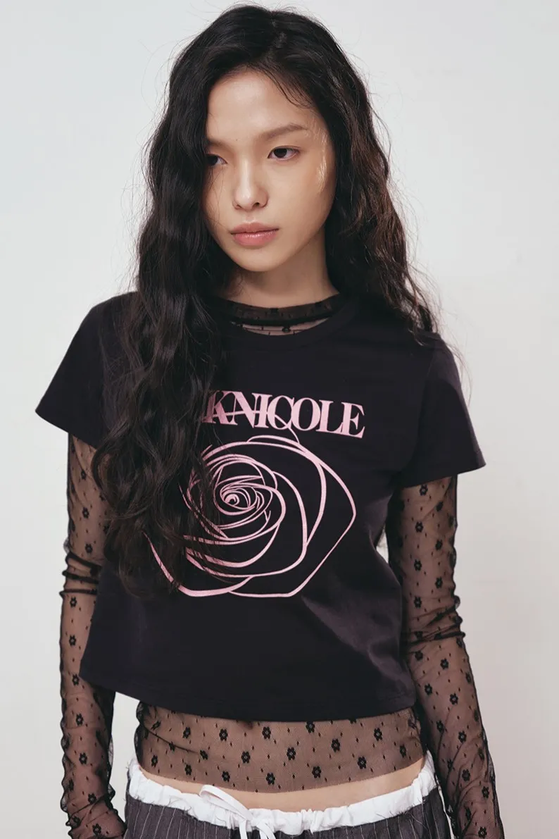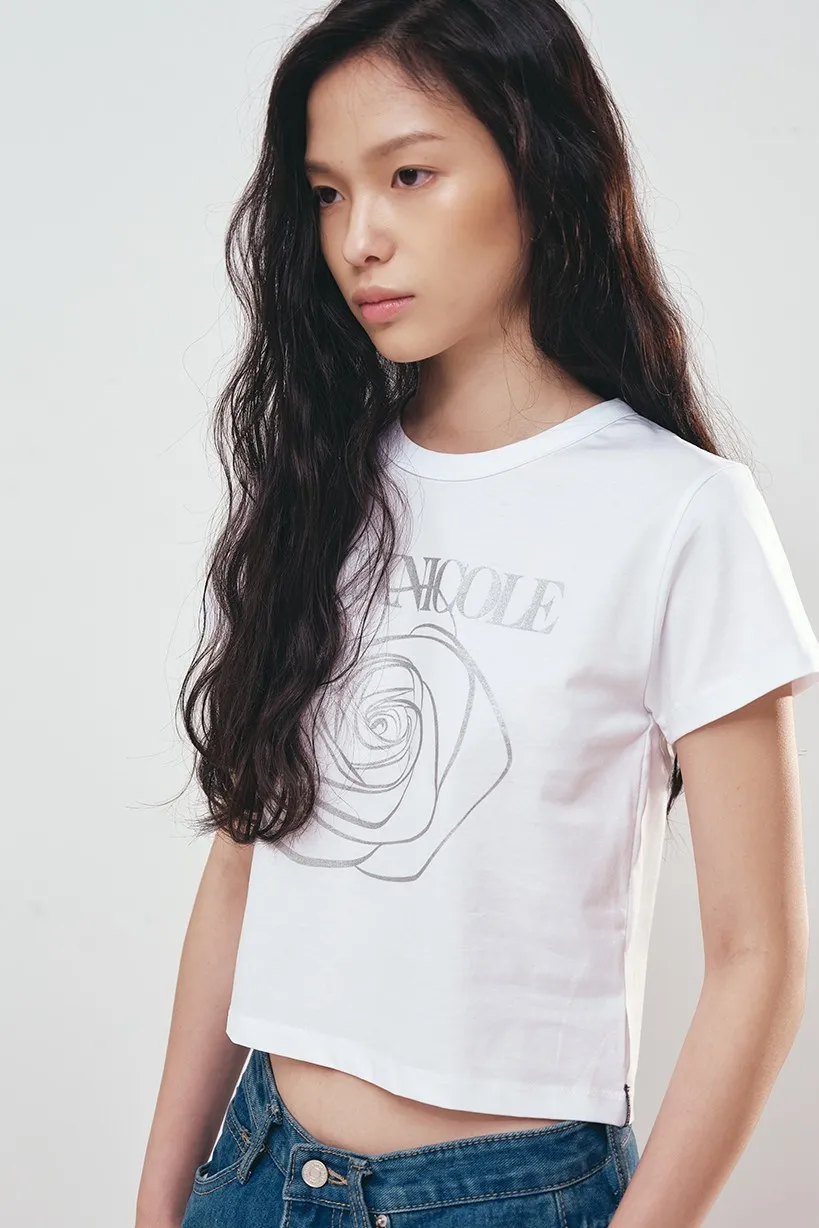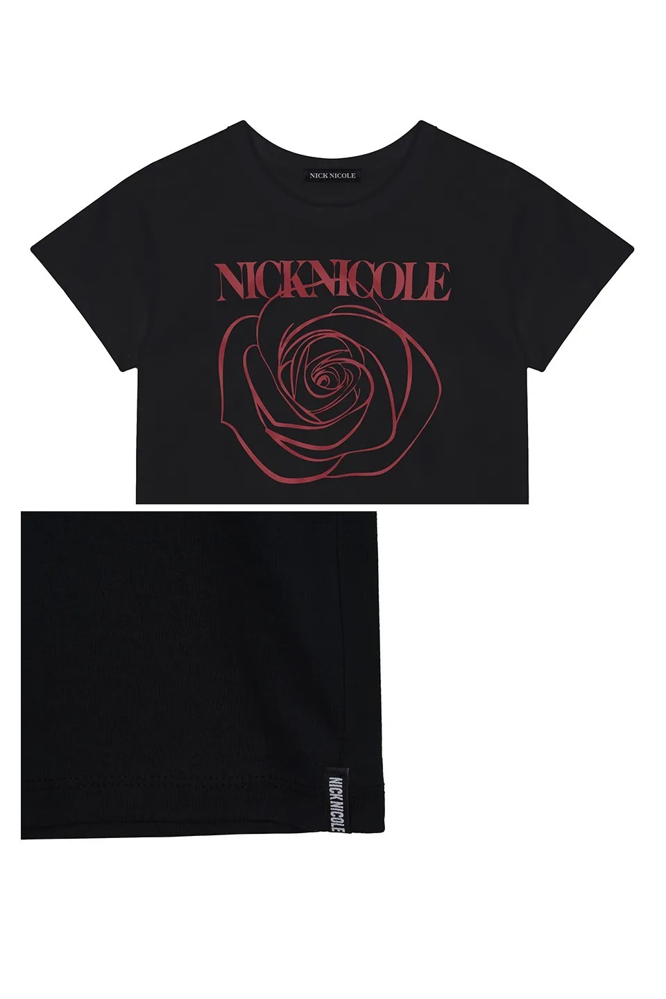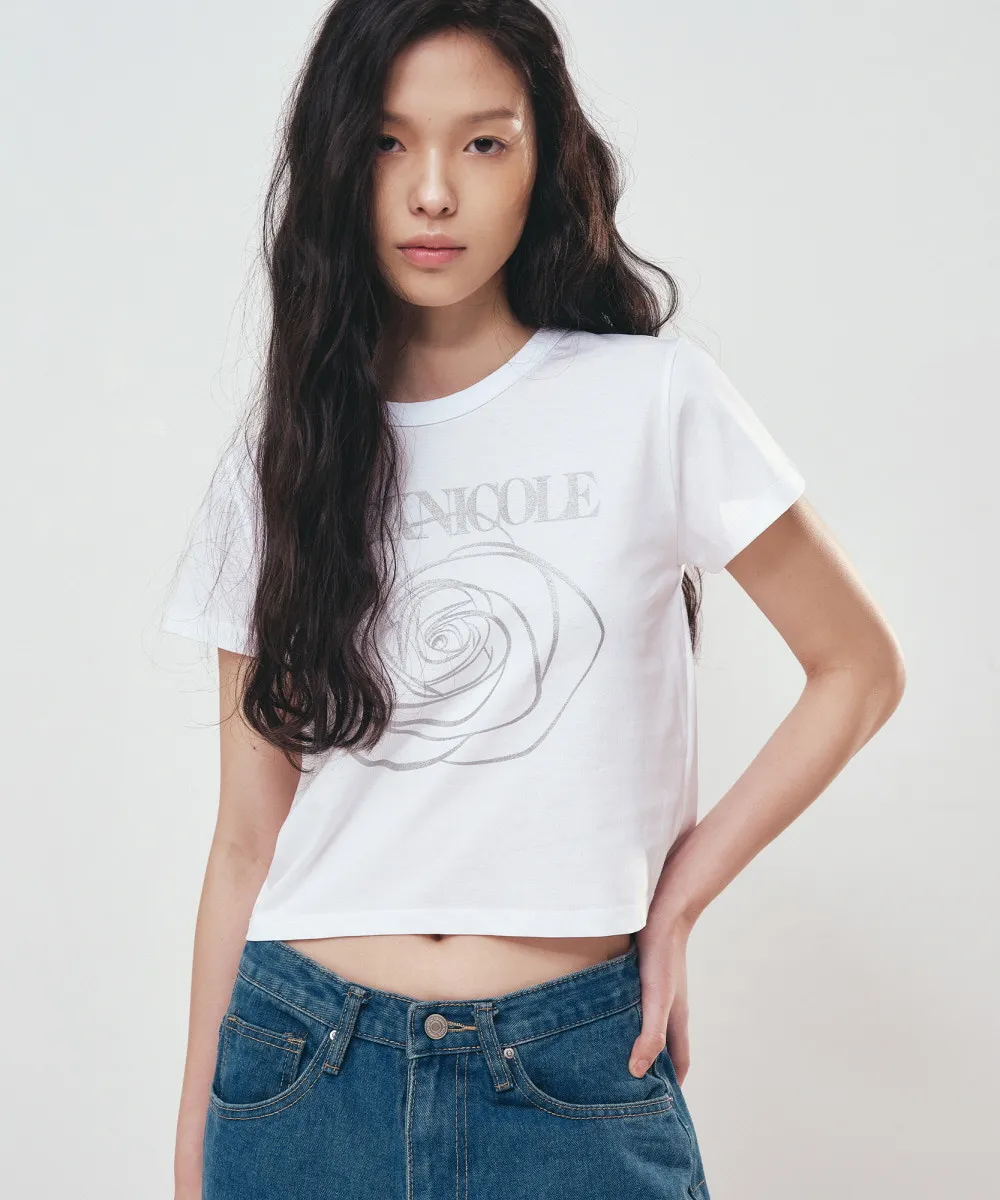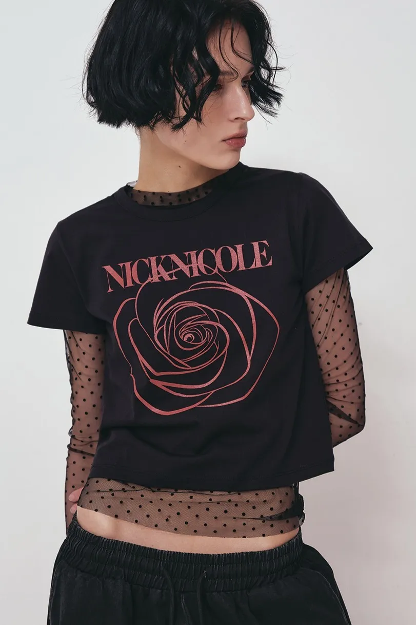 WB594經典Nick nicole玫瑰花Tshirt(短版) 黑淺藍 黑紅 黑粉 黑深藍 白銀 白 粉 白綠 白藍 黃黑 官網價$899 線上價$869