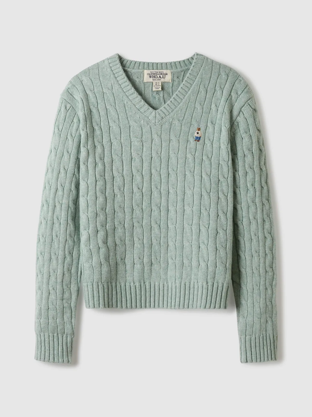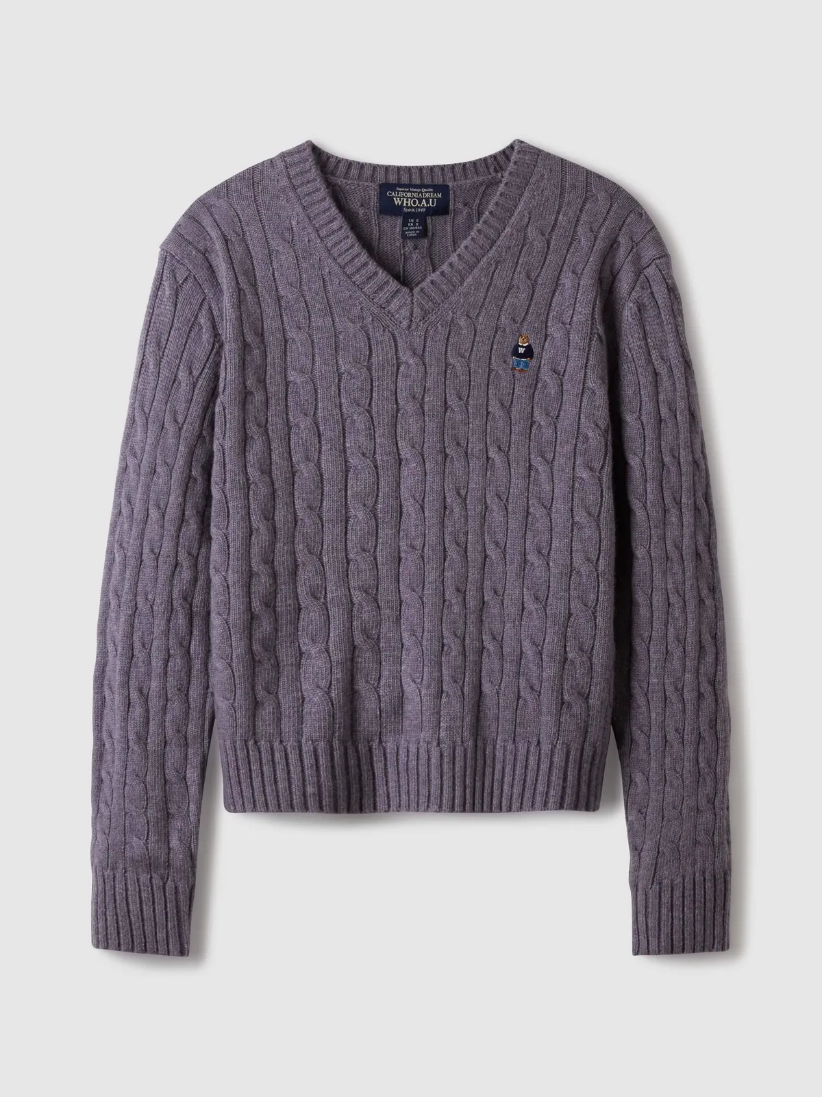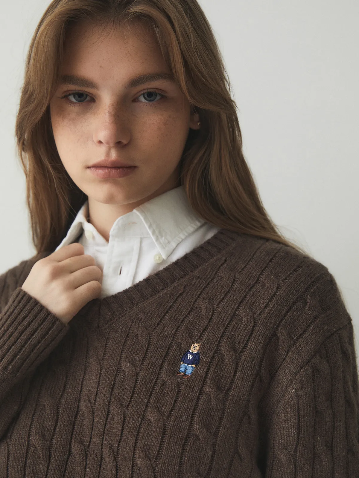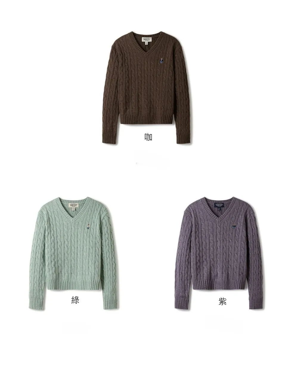 WHO_091刺繡熊熊麻花V領針織衫(原BS274) 綠 紫 咖 S M 官網價$990 線上價$960