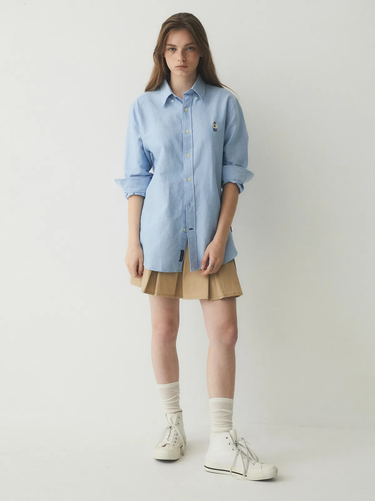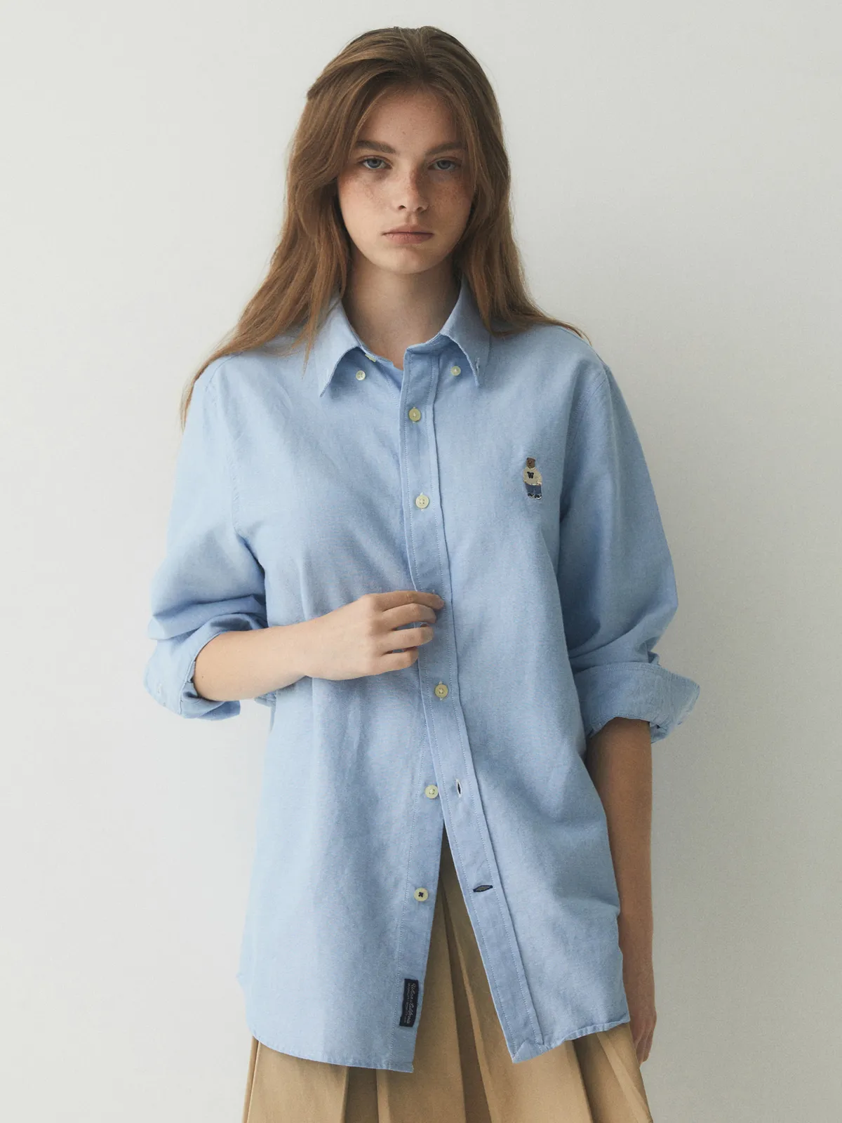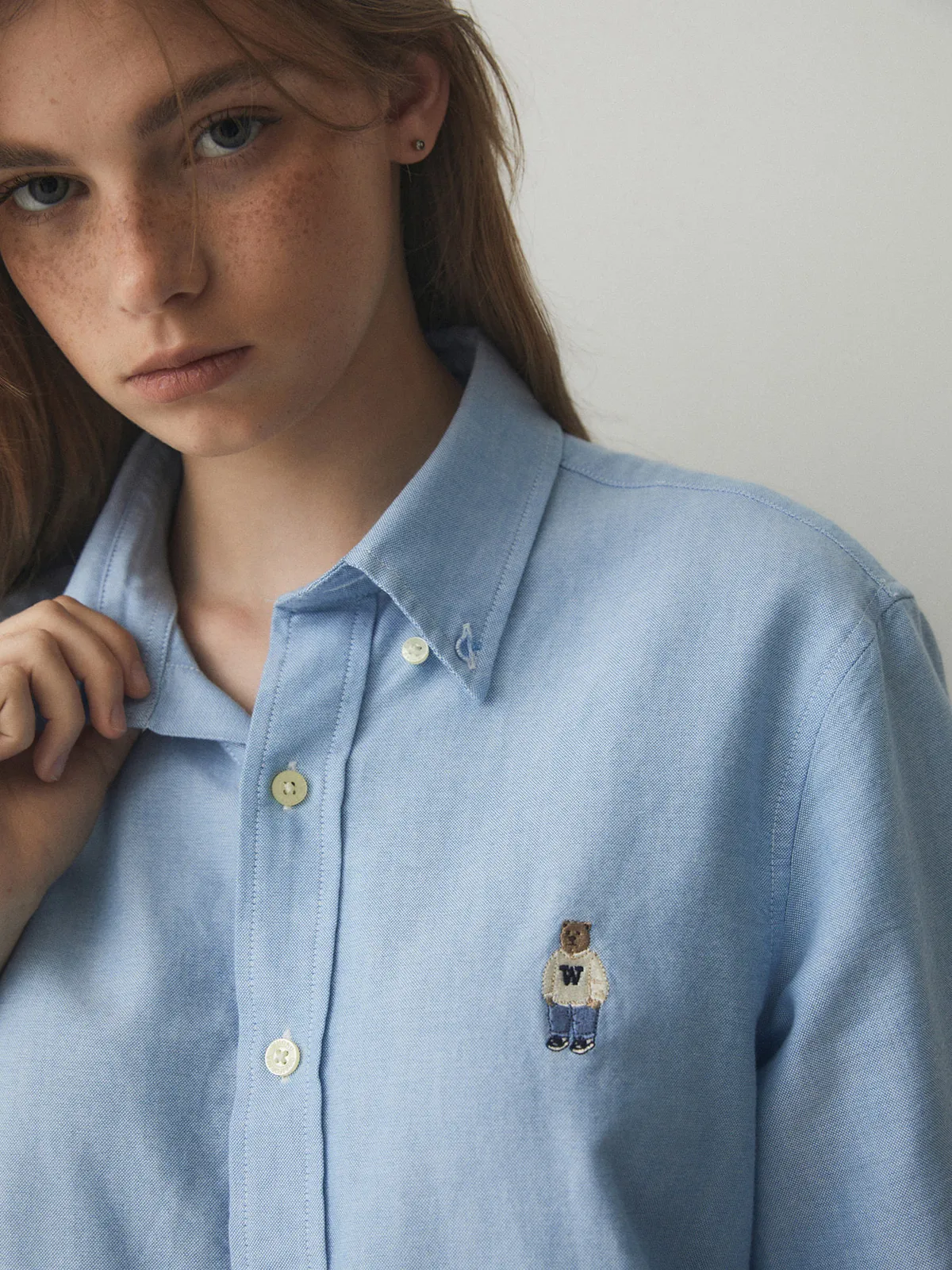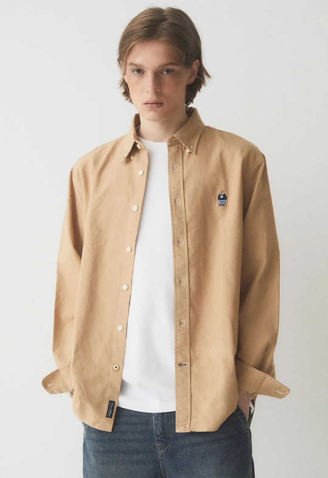 WHO_098刺繡熊熊長袖襯衫(原BS281) 白 藍 奶茶 S M L 官網價$1150 線上價$1120