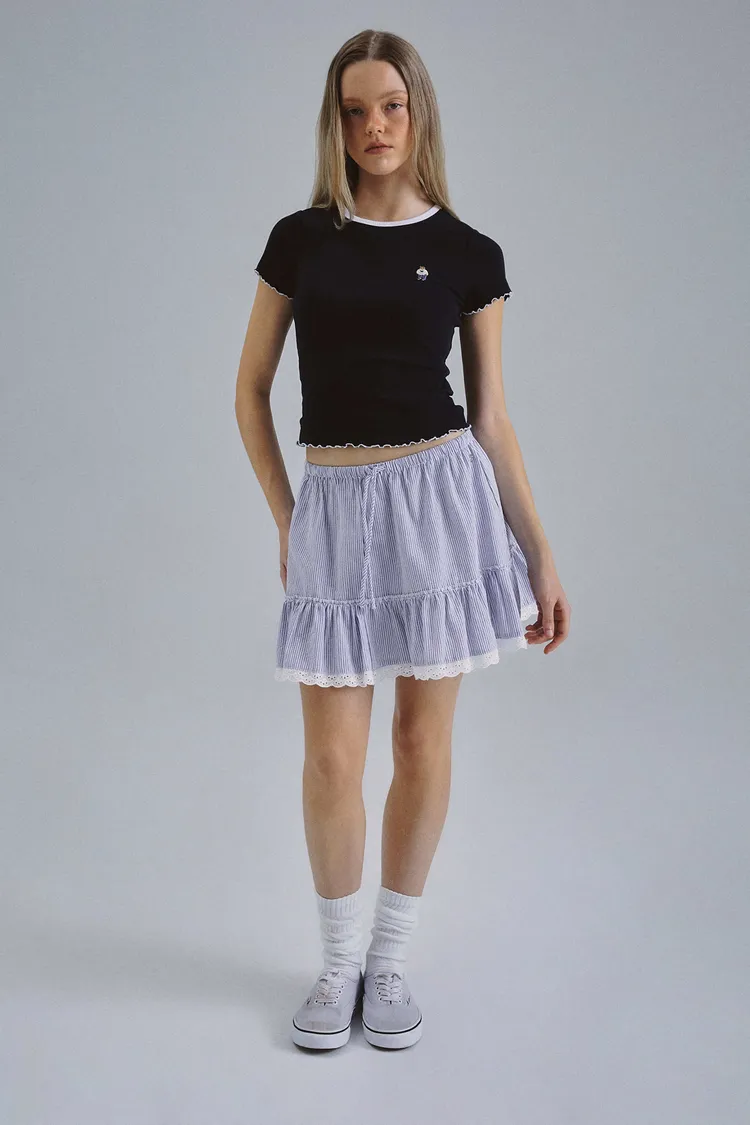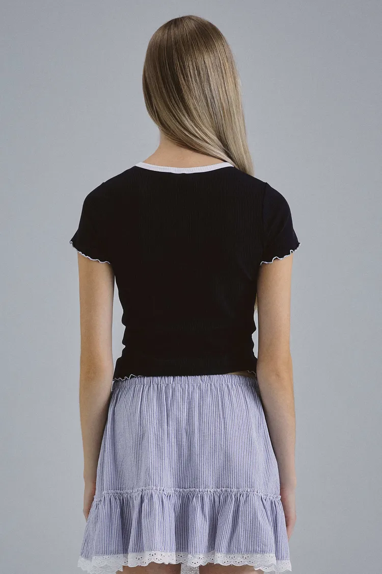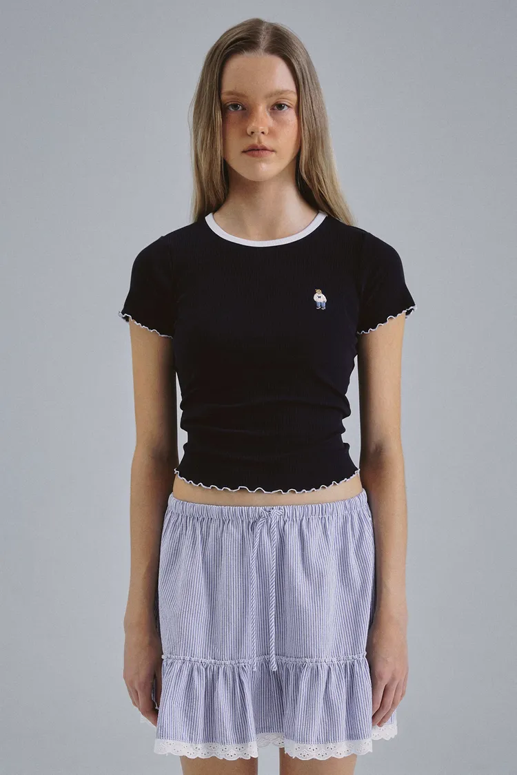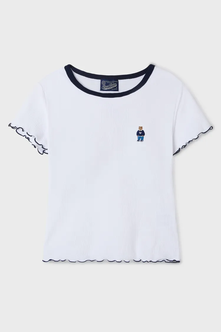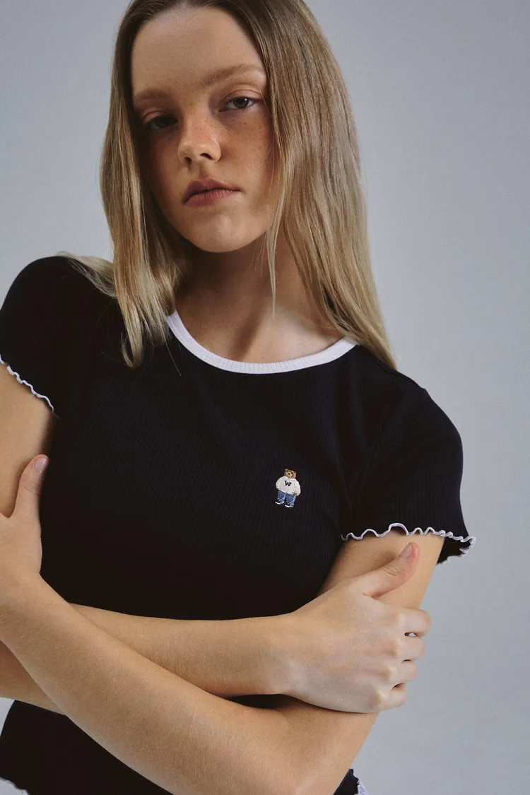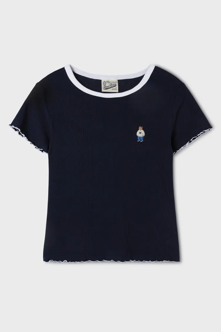 WHO_132木耳滾邊熊熊上衣 深藍 白 S M 原價$990 售價$650 棉92% 聚氨酯8%尺寸(cm)S 肩寬34.5 胸寬35 袖長14 全長46M 肩寬36 胸寬37.5 袖長14.5 全長48