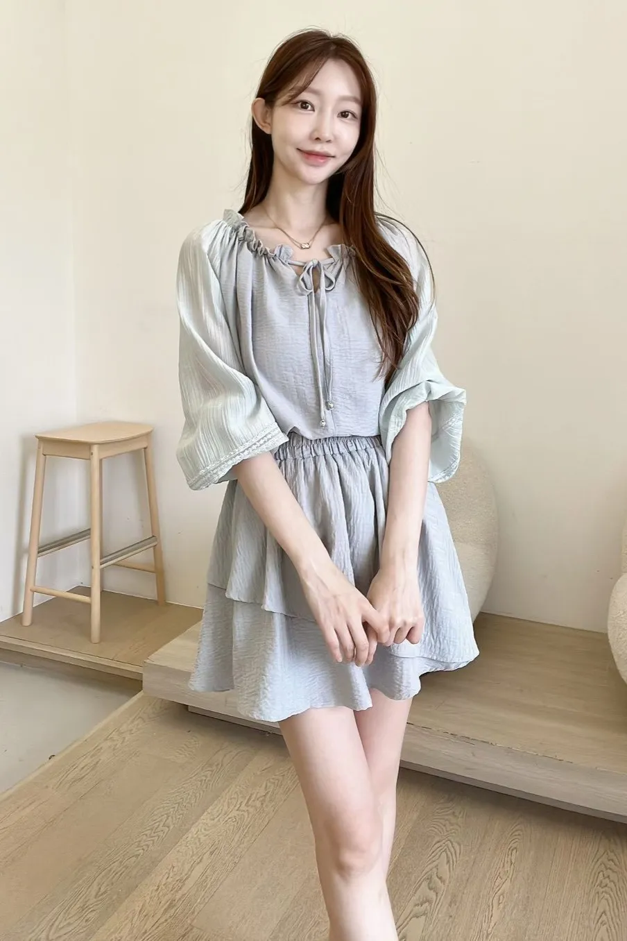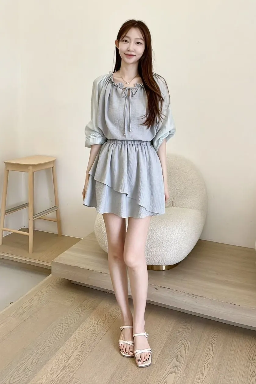 WY301套裝的天絲斜切褲裙 米 藍 灰 官網價$1000 線上價$970
