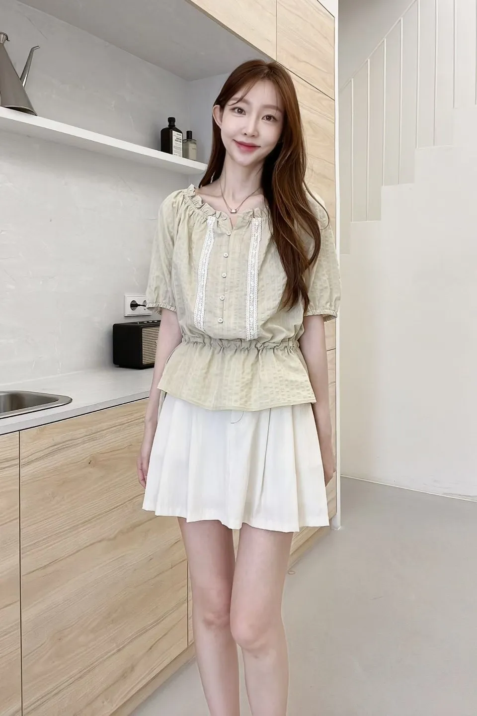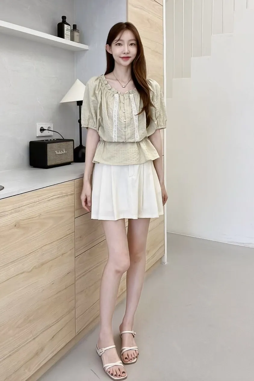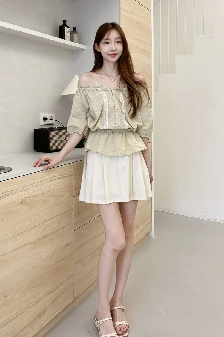 棉+人造絲 細腰抽繩 可拉一字領 蕾絲鑲嵌 袖口鬆緊 不易皺