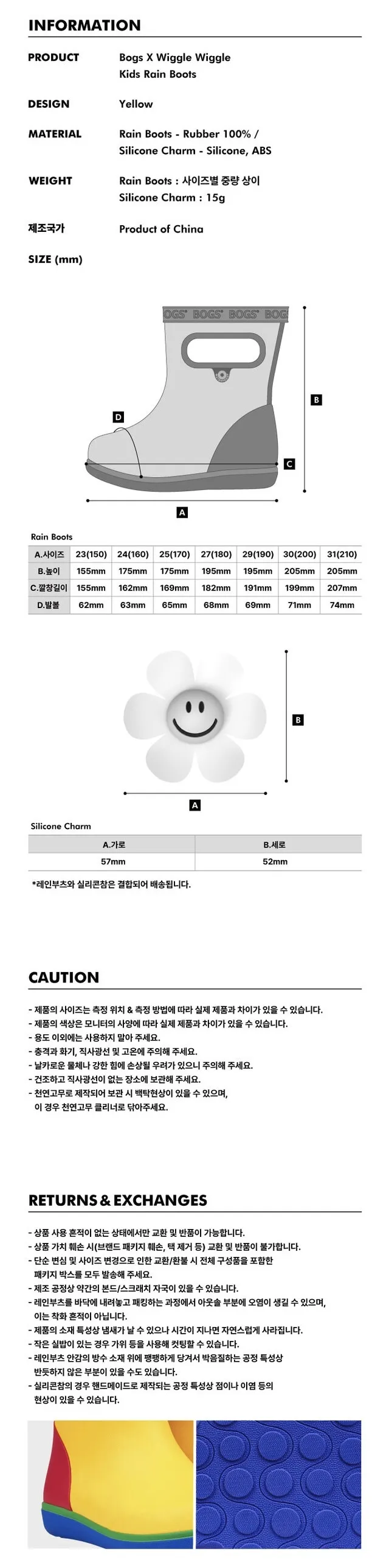 Wiggle004微笑花朵兒童雨鞋 黃 粉 藍 150~210 售價$Bogs靴子與wiggle聯名款超級可愛的兒童雨靴整個成為孩子中的亮點✨大家肯定都會問你哪裡買的因為實在是太可愛了啦!!100%防滑橡膠走在下雨的街道上也都很安全!尺寸:23(150) 24(160) 25(170) 27(180) 29(190) 30(200) 31(210)鞋子無提供退換貨服務,請記得挑好尺寸唷!以下顏色,黃色 以下顏色,粉色 以下顏色,藍色