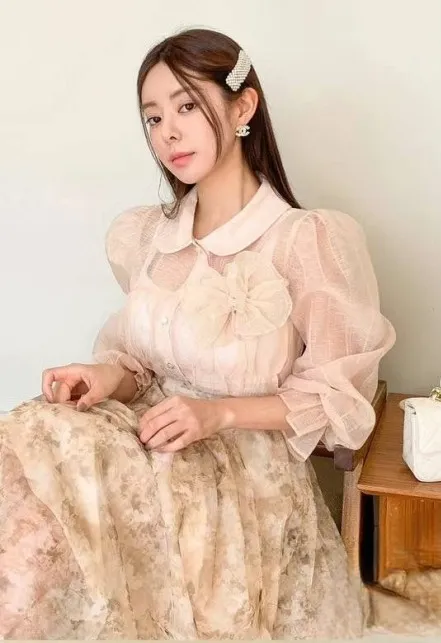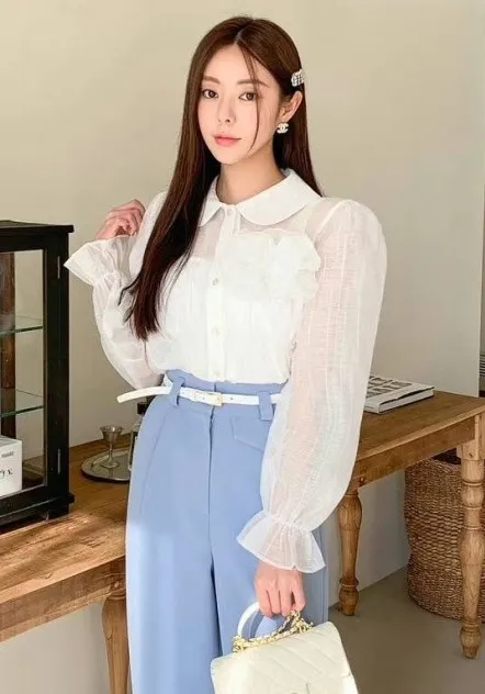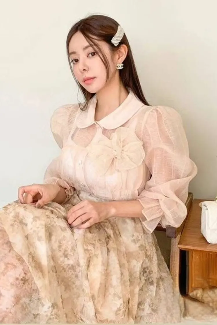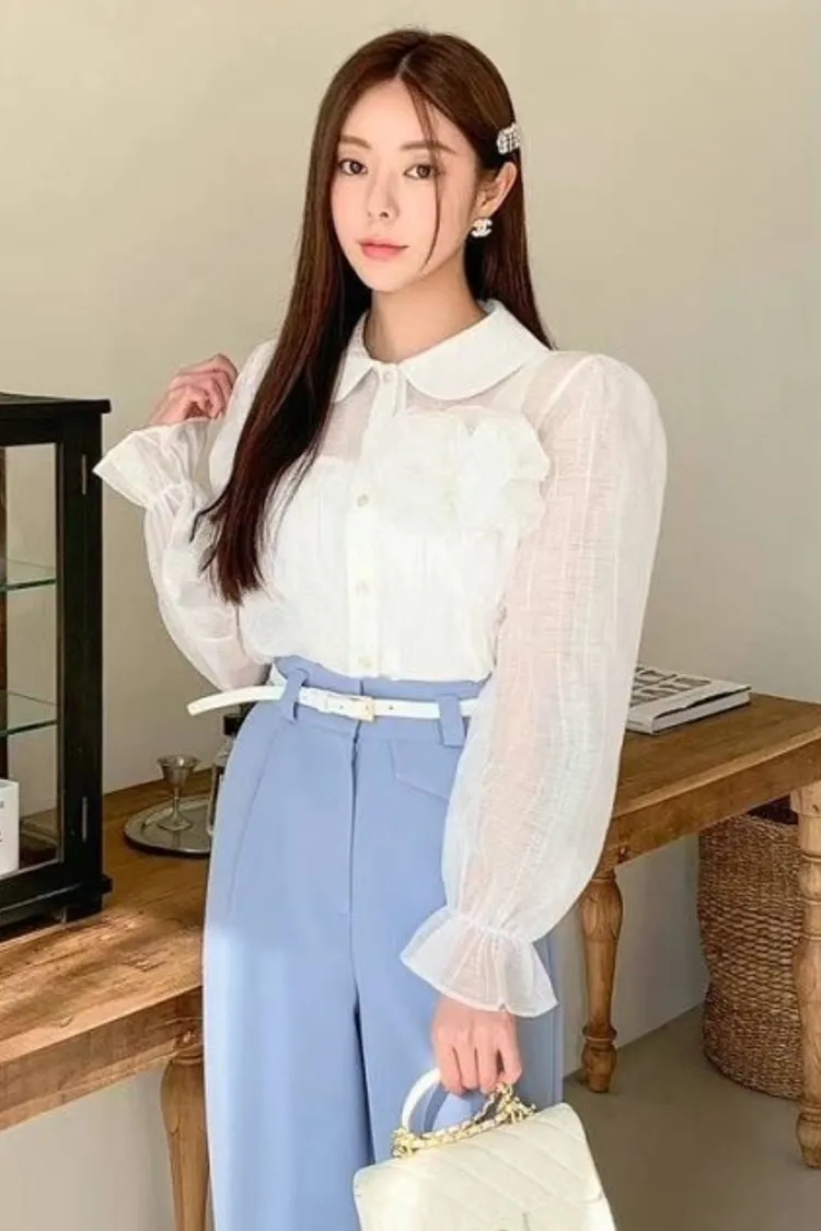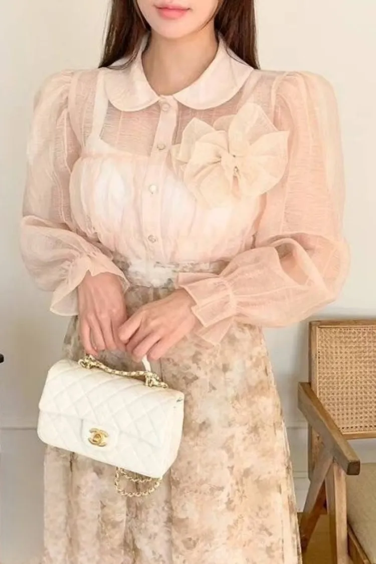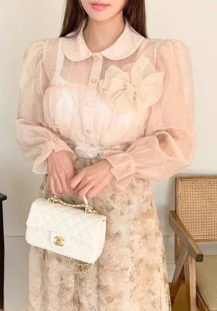雪紡 氣質襯衫圓領 蕾絲+歐根紗 手袖鬆緊 超敏肌略過