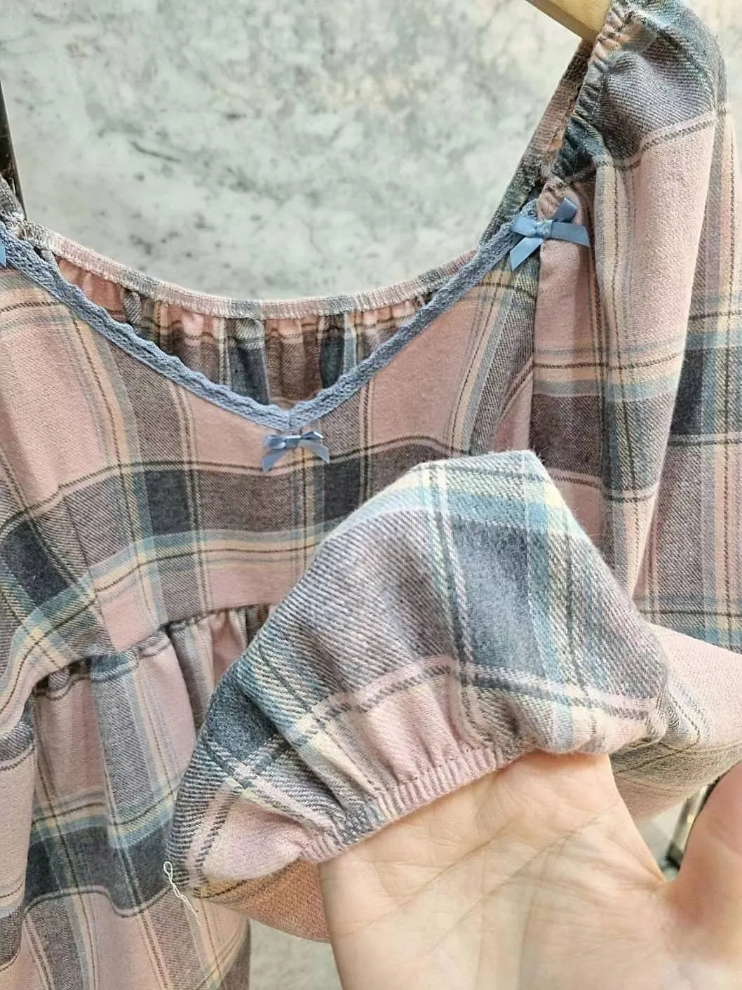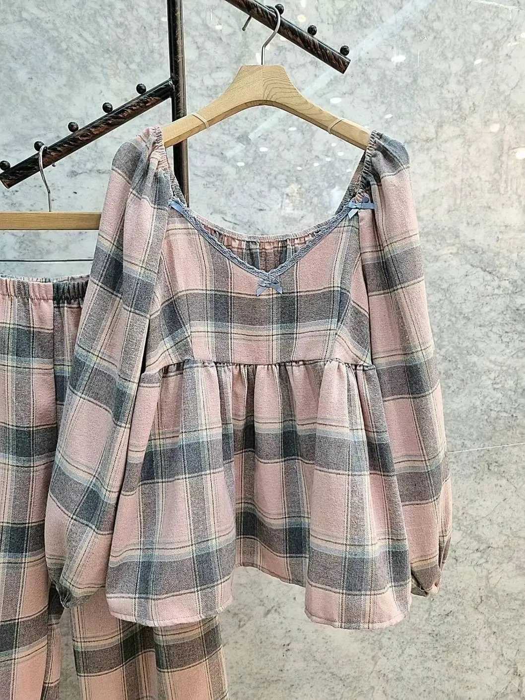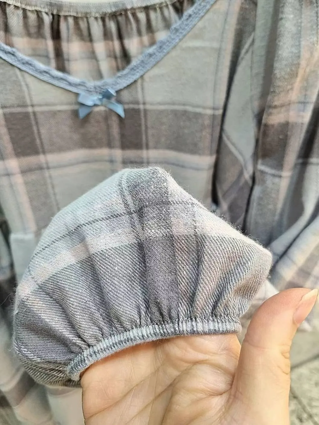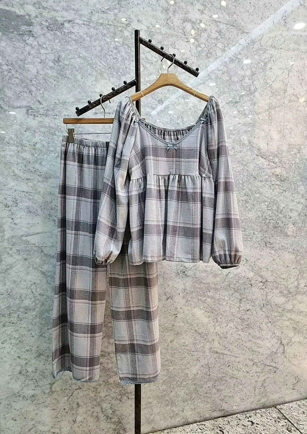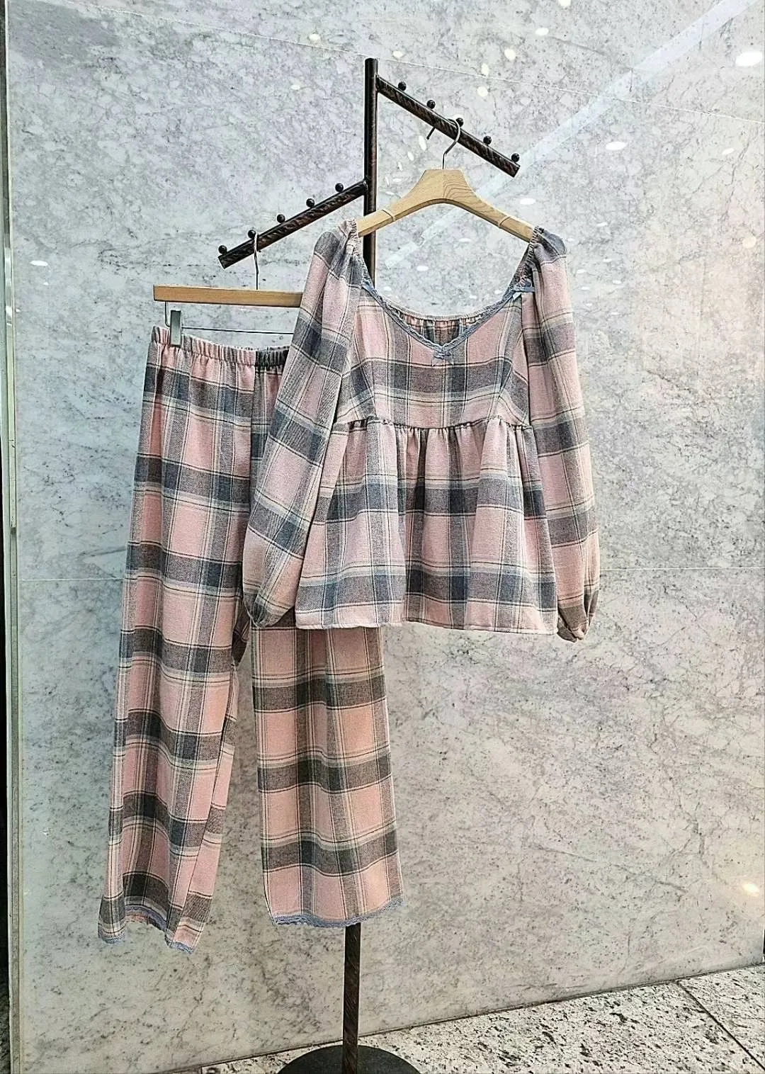 YN018秋夜霧霾色格紋睡衣套裝(上衣長褲) 粉 灰 官網價$1020 線上價$990