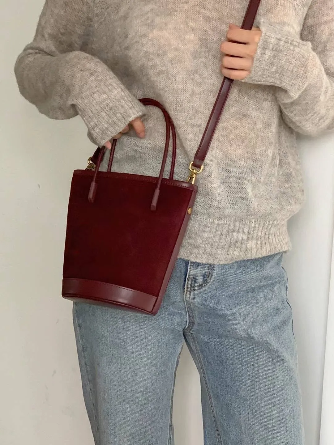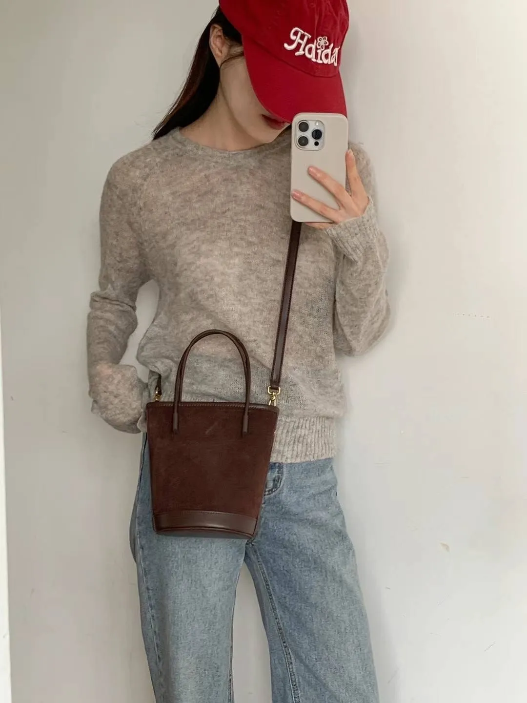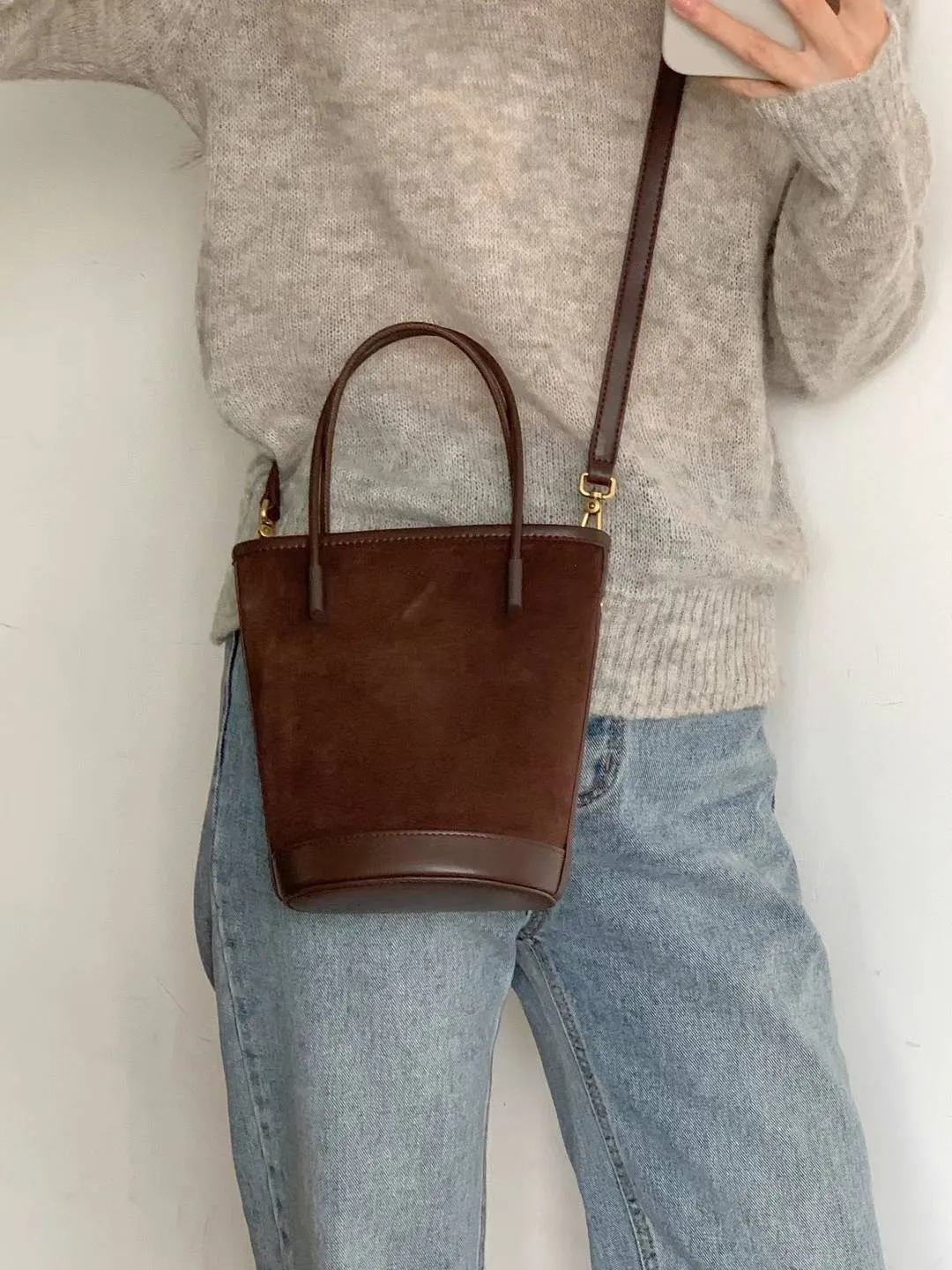 牛皮 絲絨感麂皮 有肩背帶 送一個拉鍊小包包