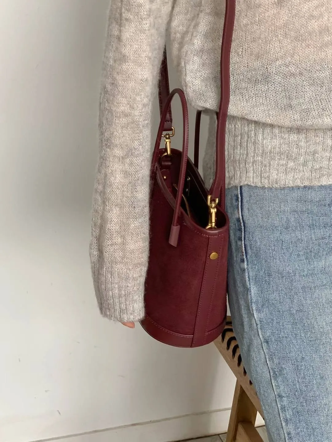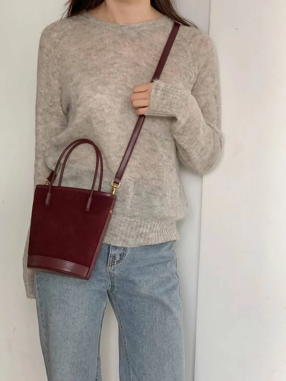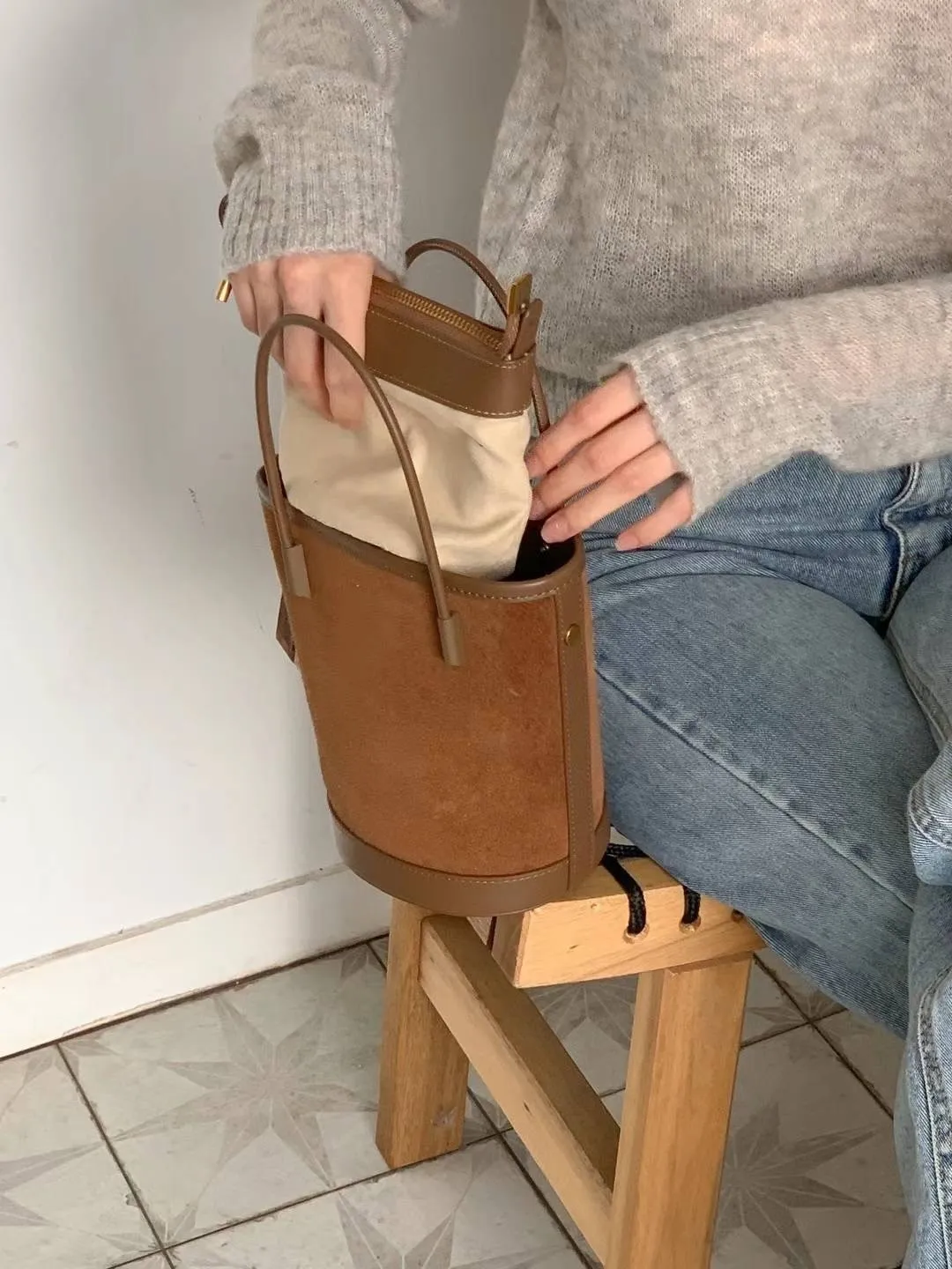 牛皮 絲絨感麂皮 有肩背帶 送一個拉鍊小包包
