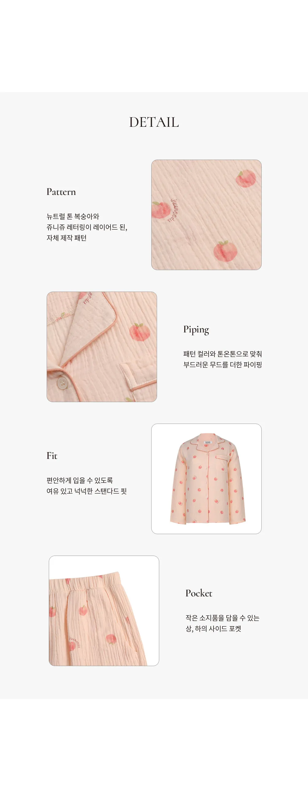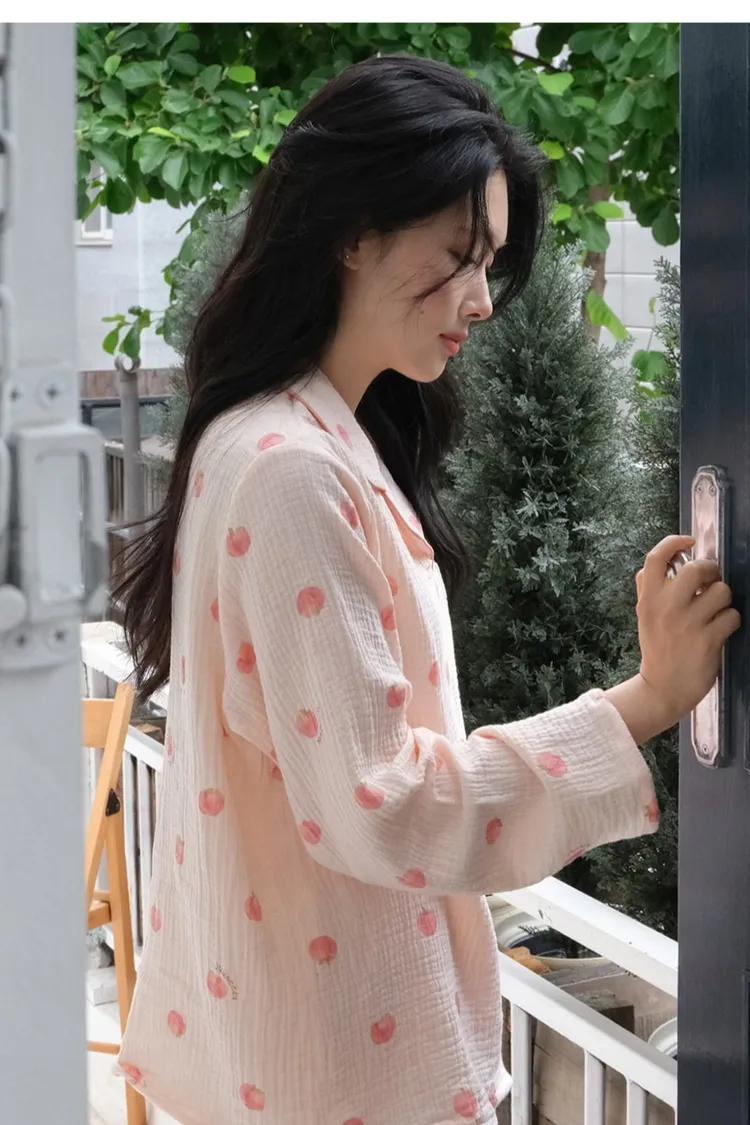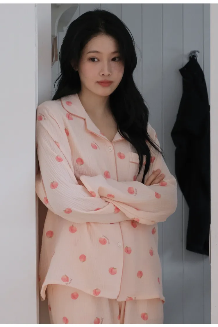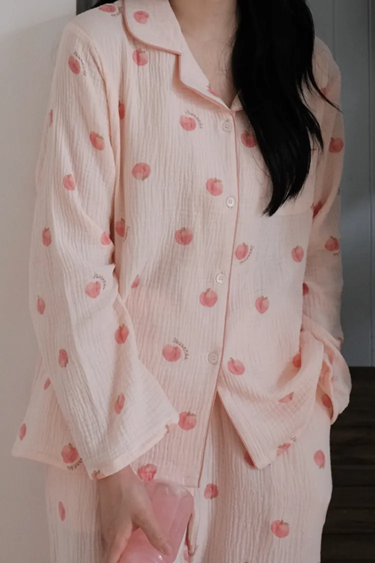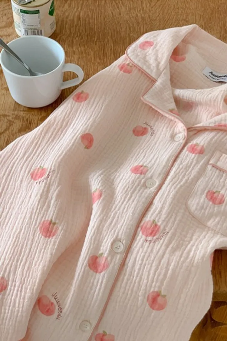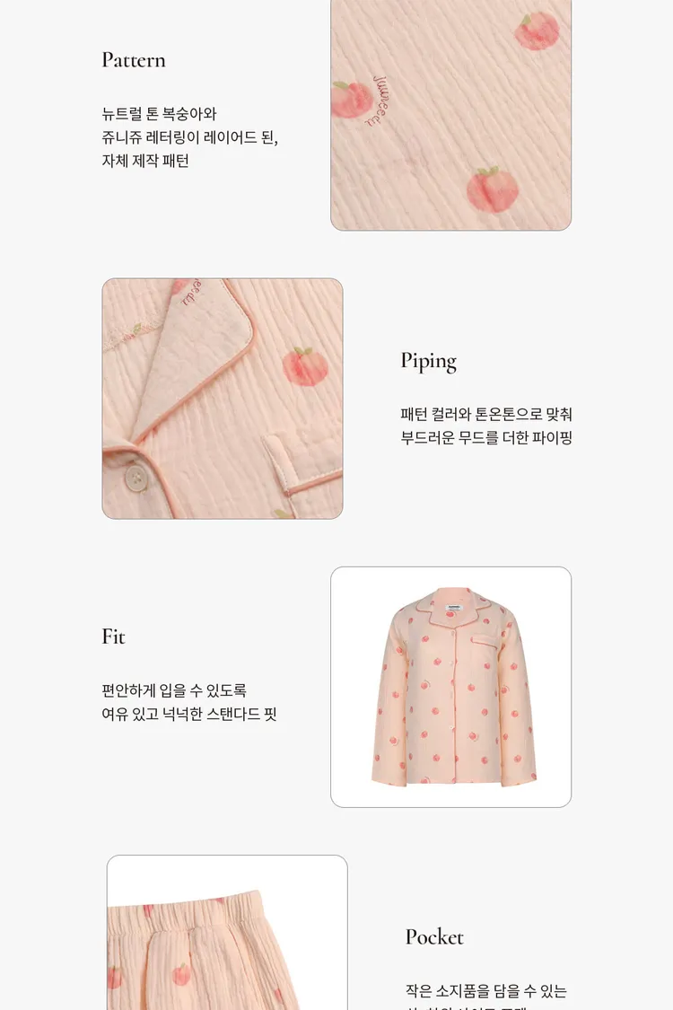棉,親膚舒適 可愛插畫水蜜桃 微光澤奶油釦 透氣皺皺紋理 考克滾邊