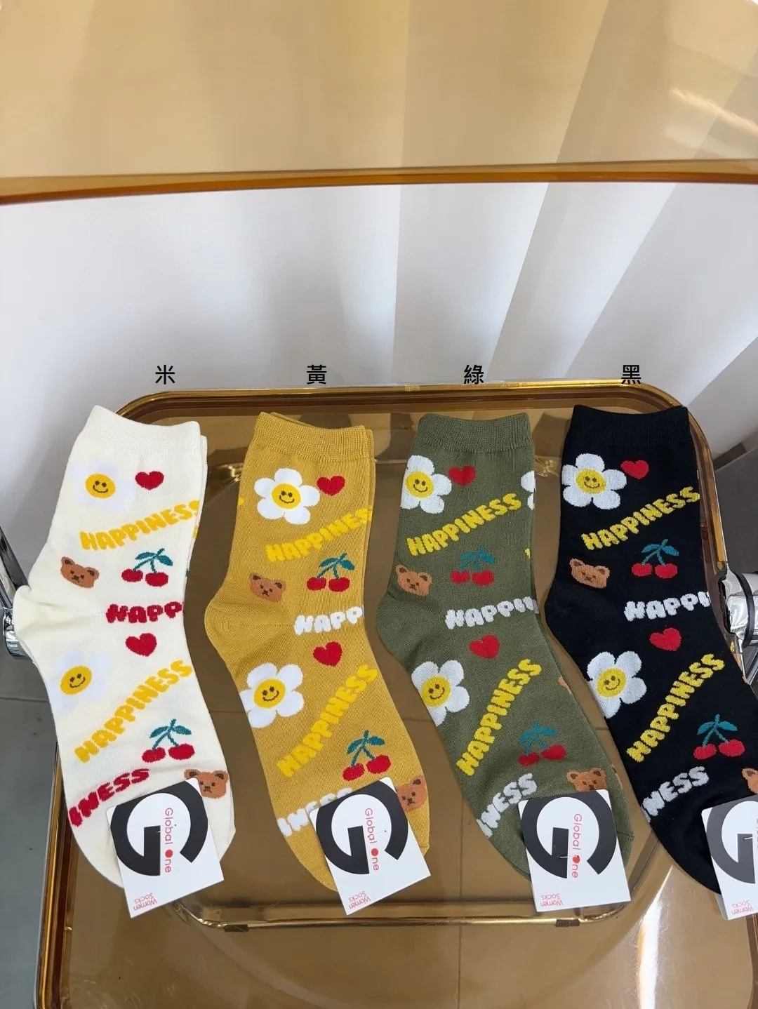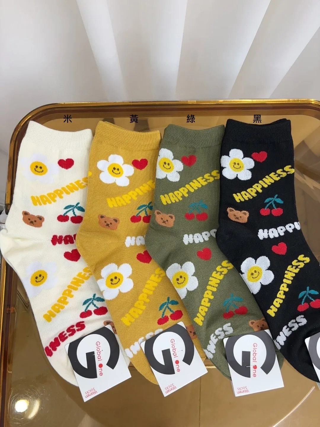 ZC033熊熊花花happiness襪 米 黃 綠 黑 $39 包色$140