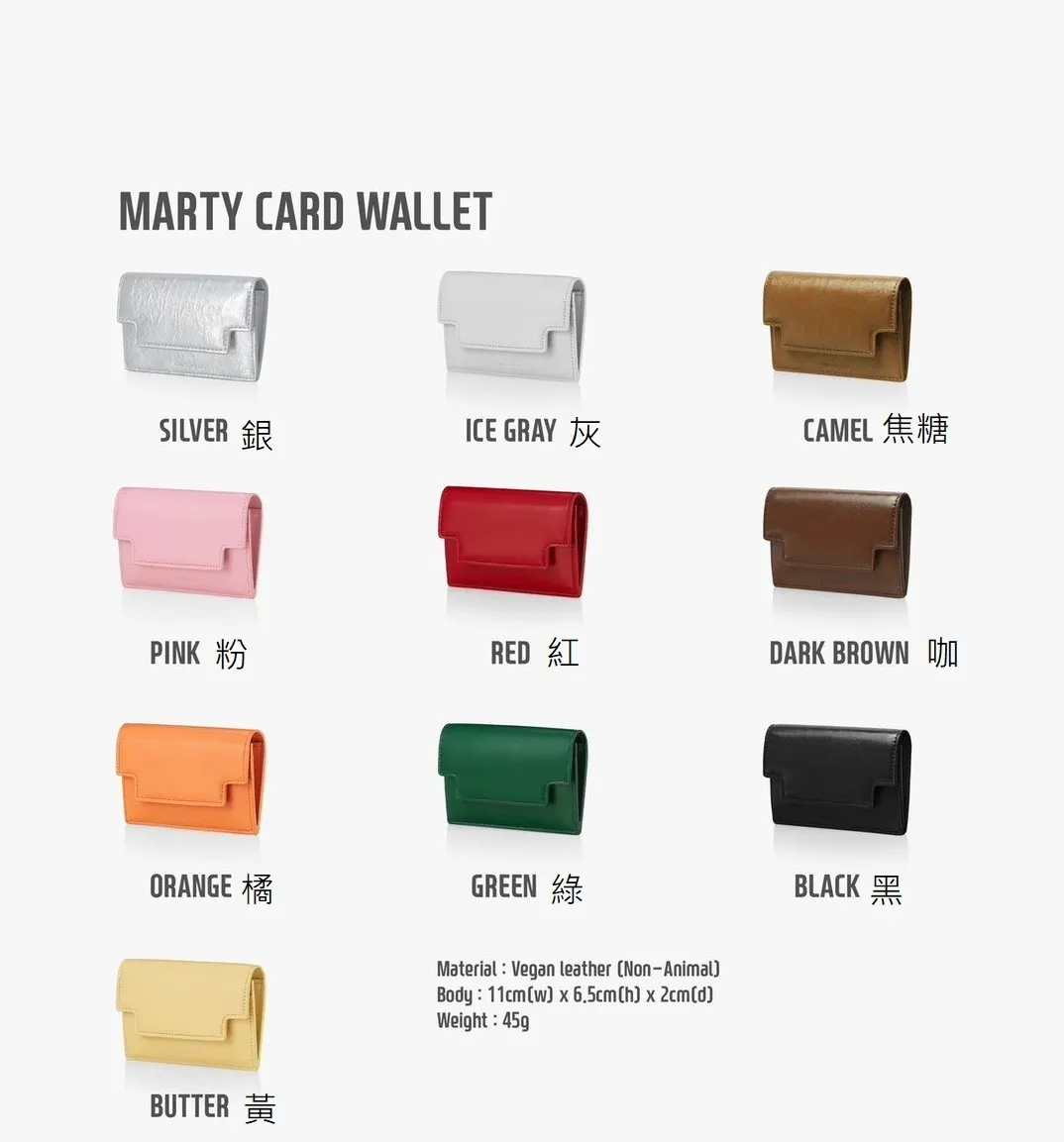 該商品是 Marty Bag 的卡片盒版本。它尺寸緊湊,可輕鬆握在一隻手上。主內袋可容納多張卡片,正面和背面的附加口袋可提供額外的便利使用。