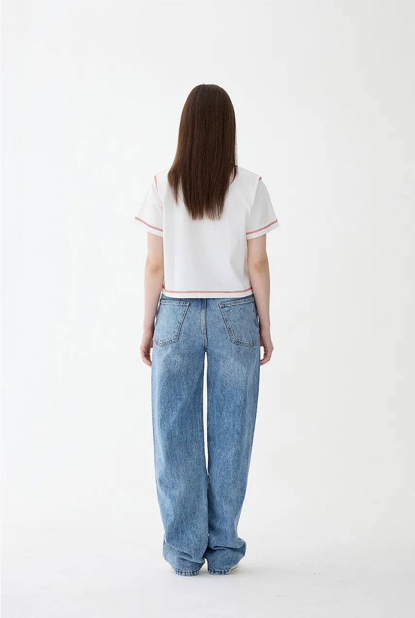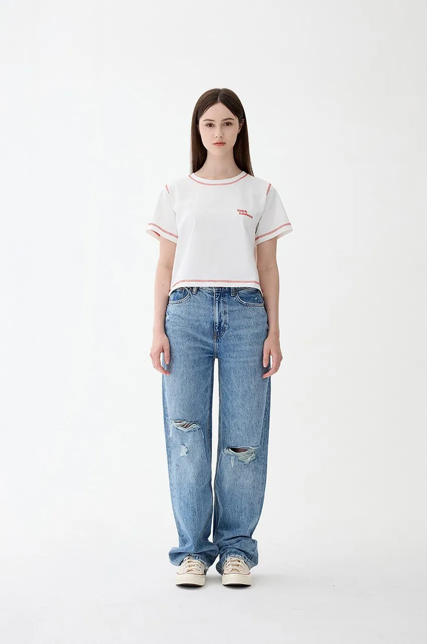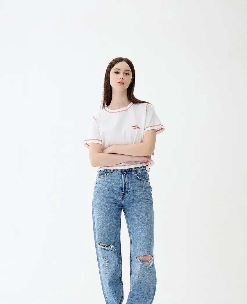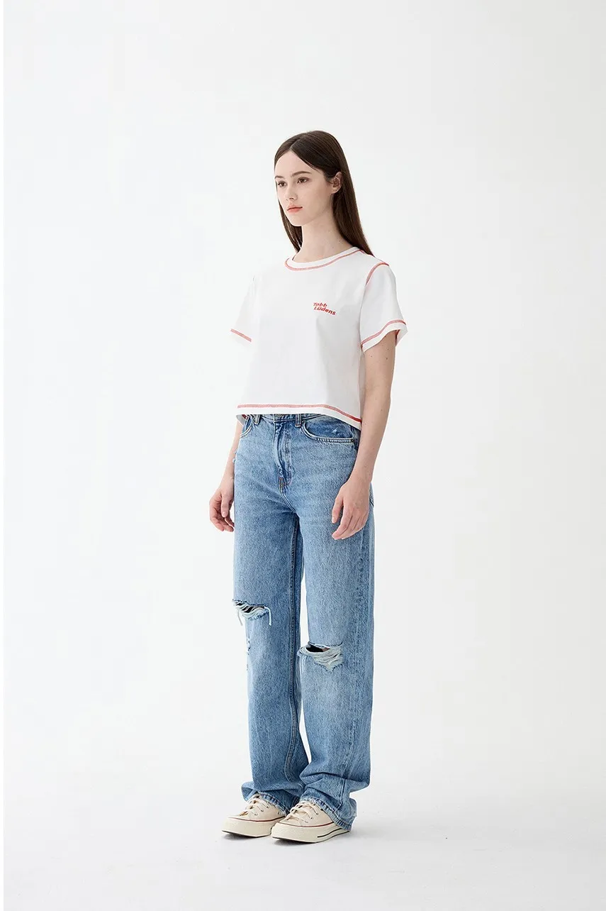 ludens003女版橘色縫線短版上衣
