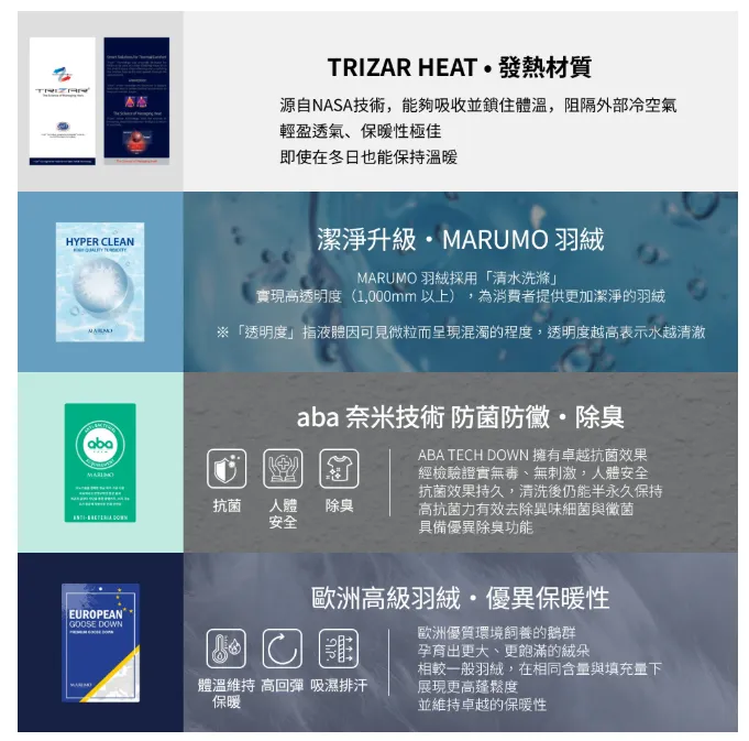 - 奈米技術抗菌羽絨,防菌防黴,除臭又抗過敏
